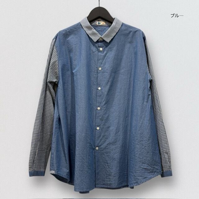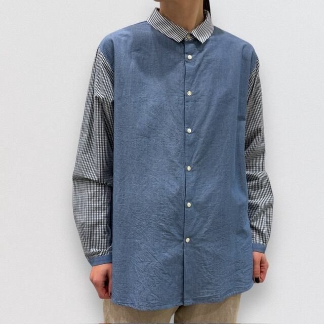 1 着の中で、3種類の生地をコラージュしたレギュラーカラーのシャツです。