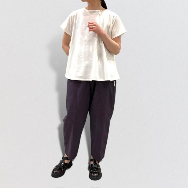 フレアシルエットのTシャツです。ボートネックあきの留め釦には、ビーズを重ねました。