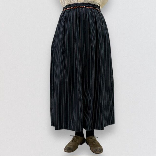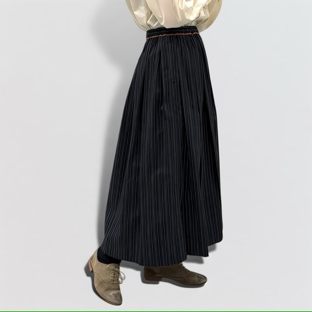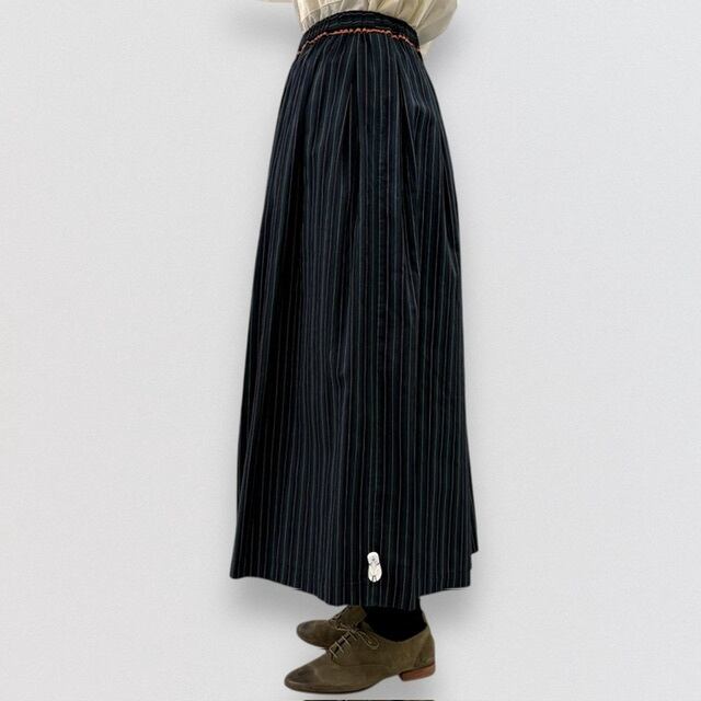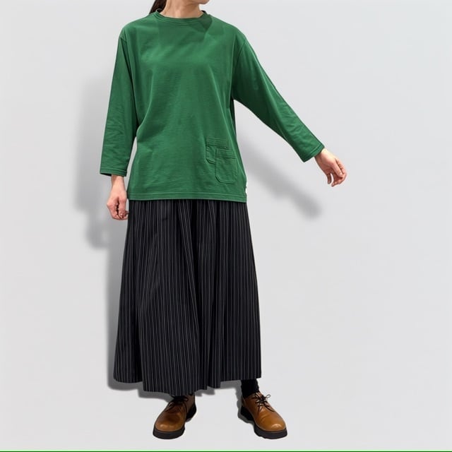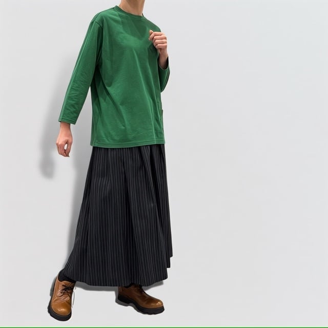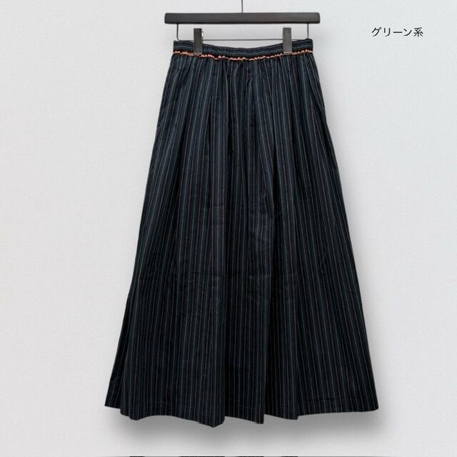 生地のハリで腰回りにふくらみが出ないデザインのタックスカート。