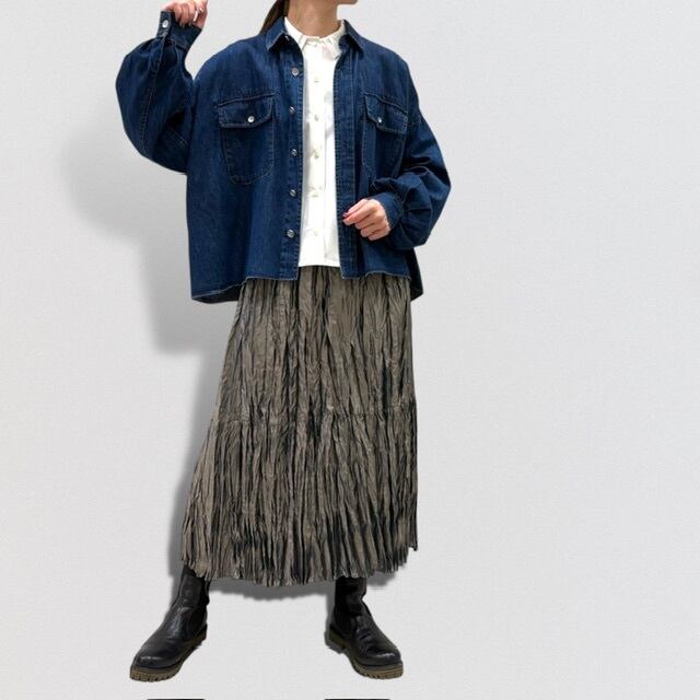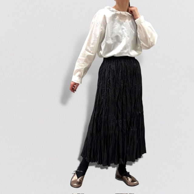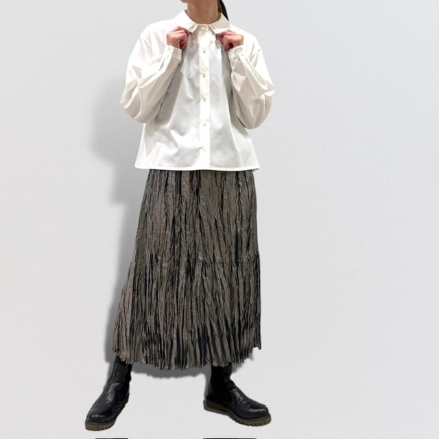 甘くなりがちなティアードデザインを、すっきりとしたミドル丈と上品な素材感でスタイリッシュに仕上げました。