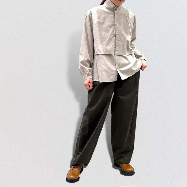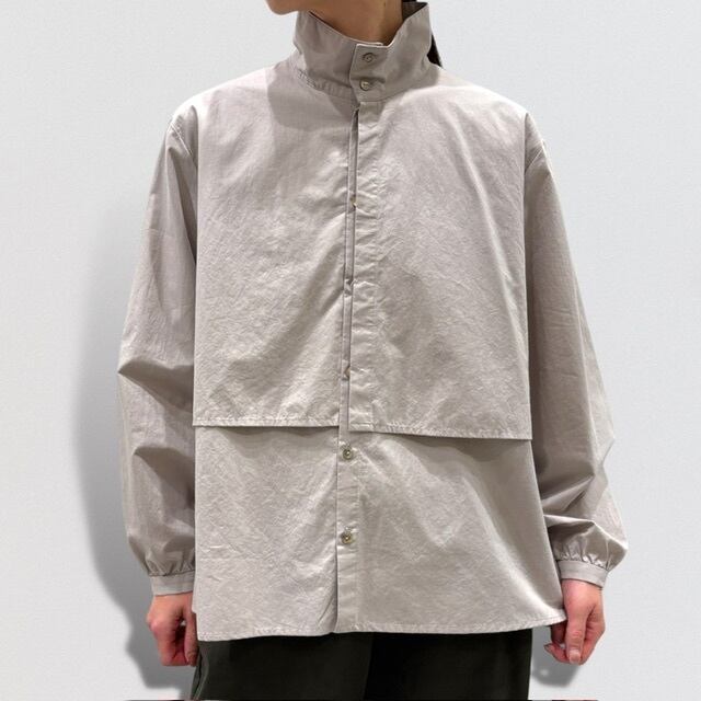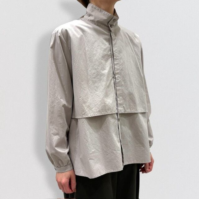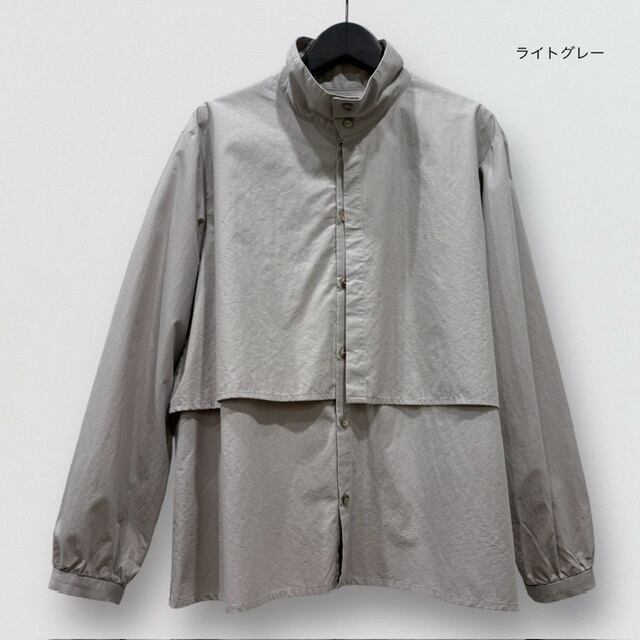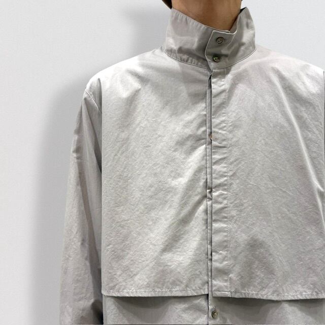 スタンドカラーは、共地を上衿に挟み込み、微細なディテールが目を引きます。