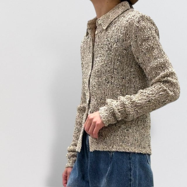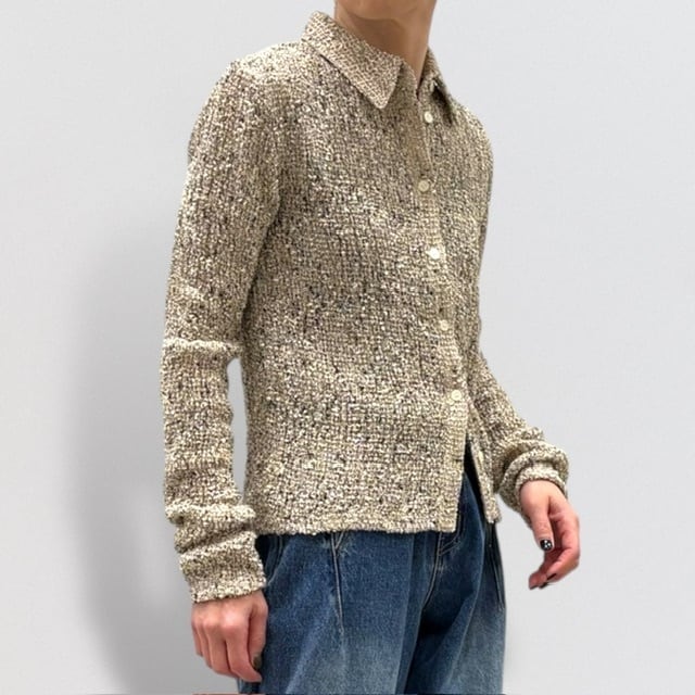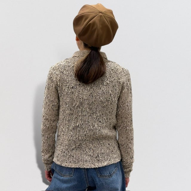 襟付きのすっきりデザインに、ツイード風のシャーリング素材が表情をプラス。