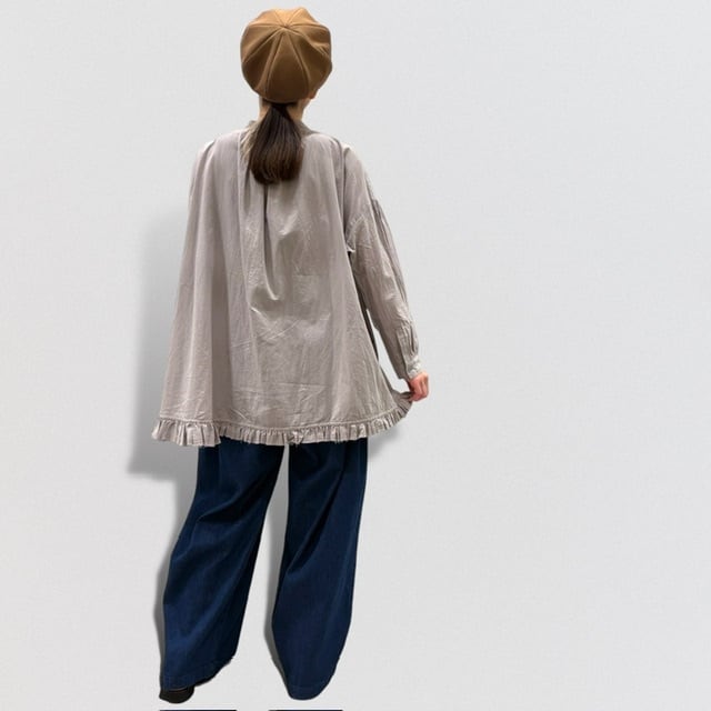 サイドから後ろにかけての切りっぱなしフリルが可愛いブラウスです。