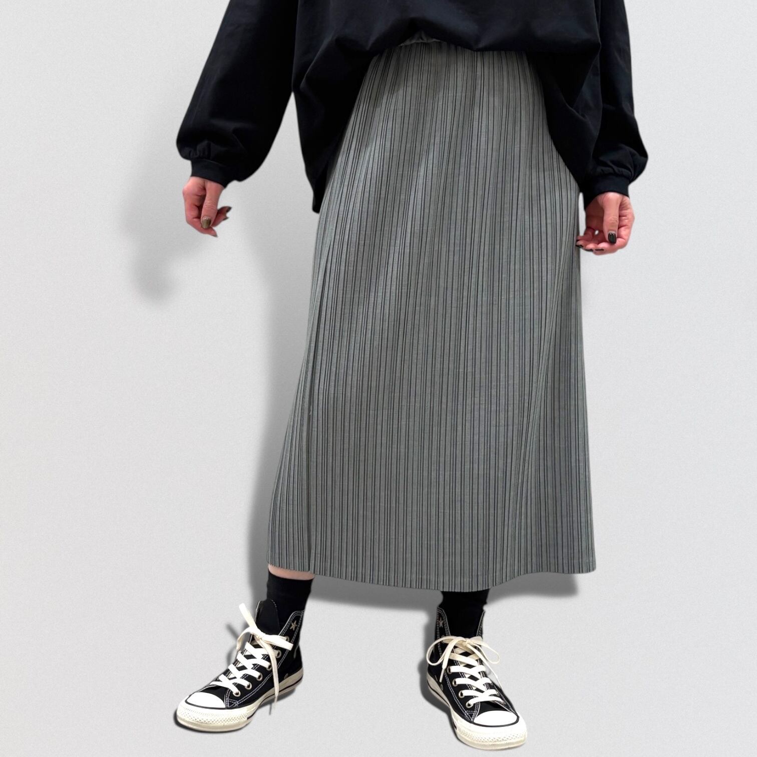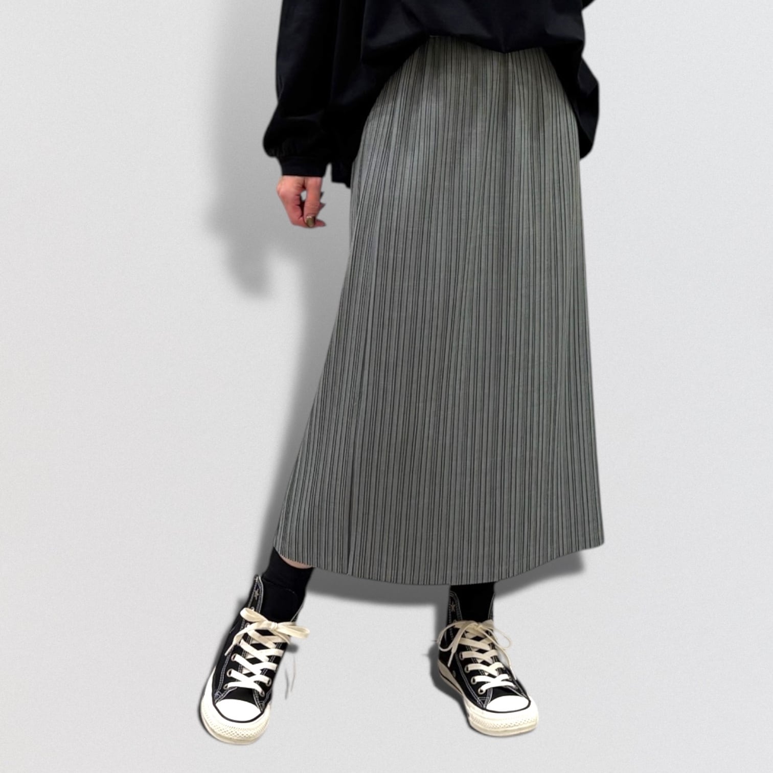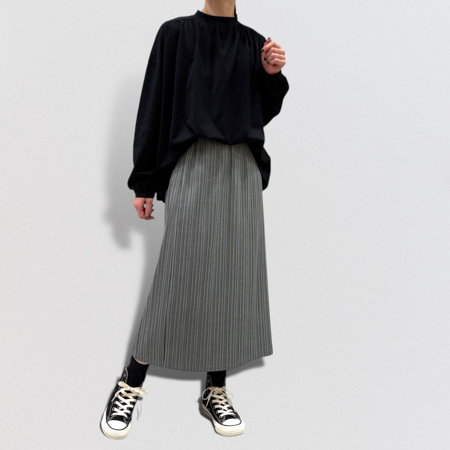 タイトラインに加えランダムな細プリーツになっているのでよりすっきりとしたスカートになっており、着方で遊んでいただくのもおすすめ。