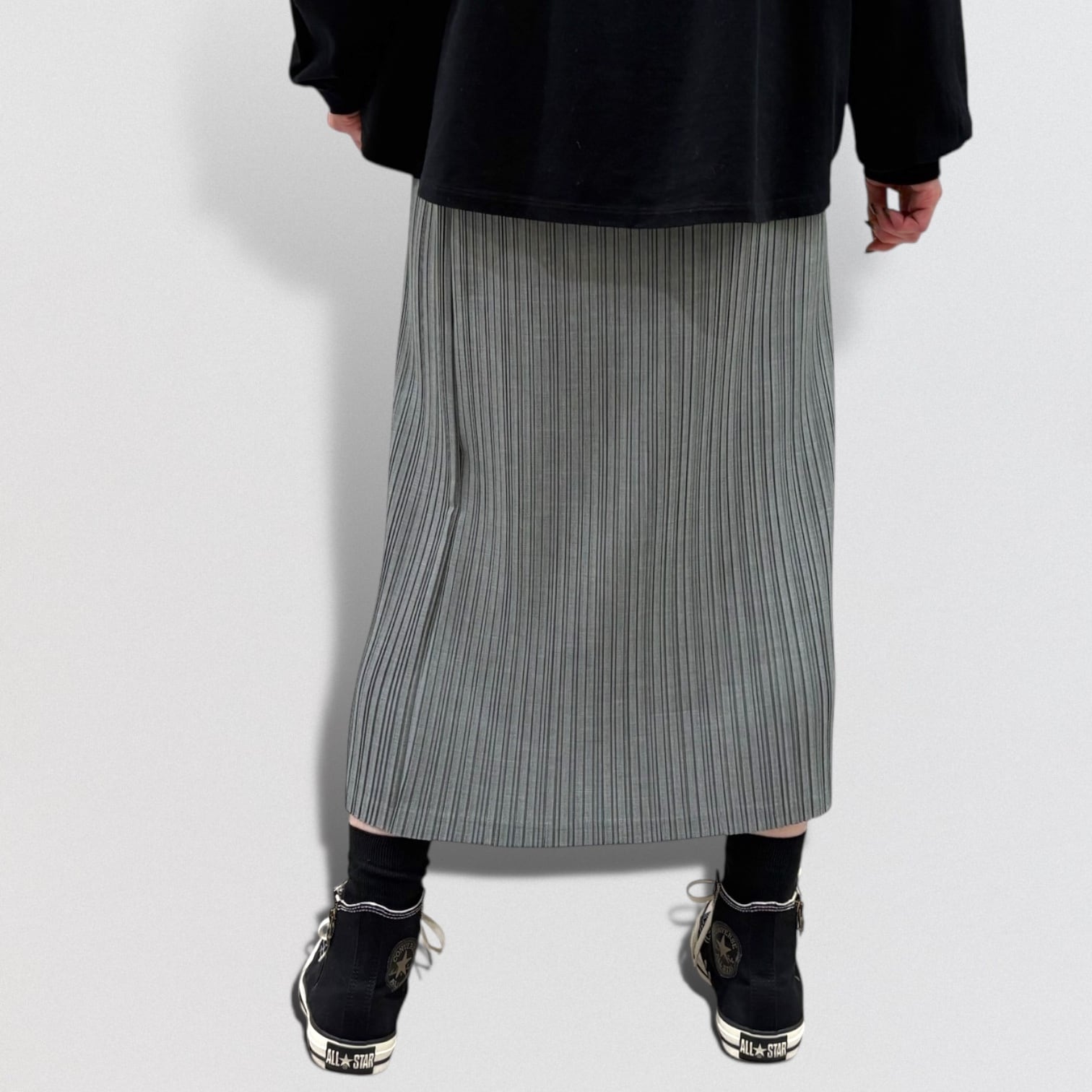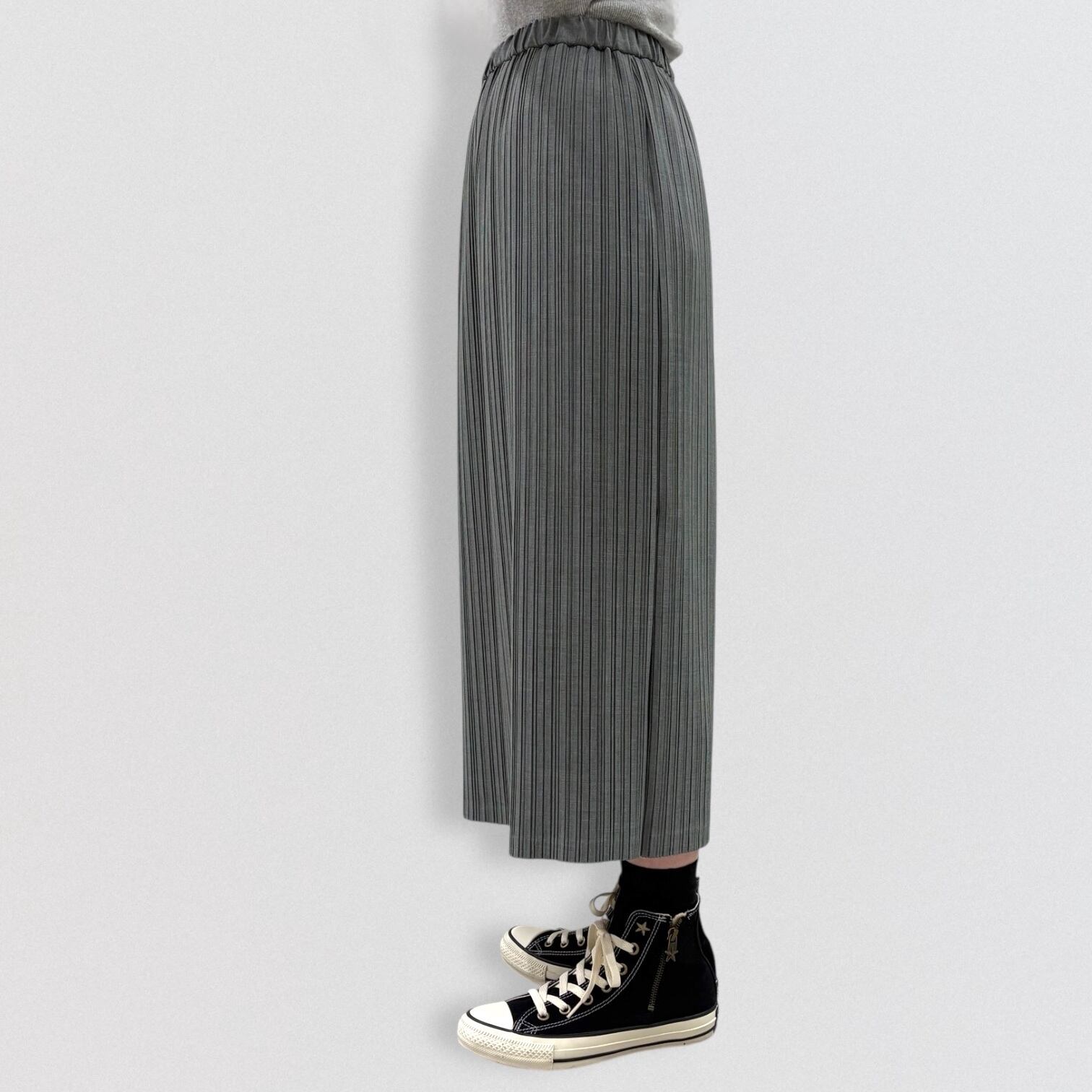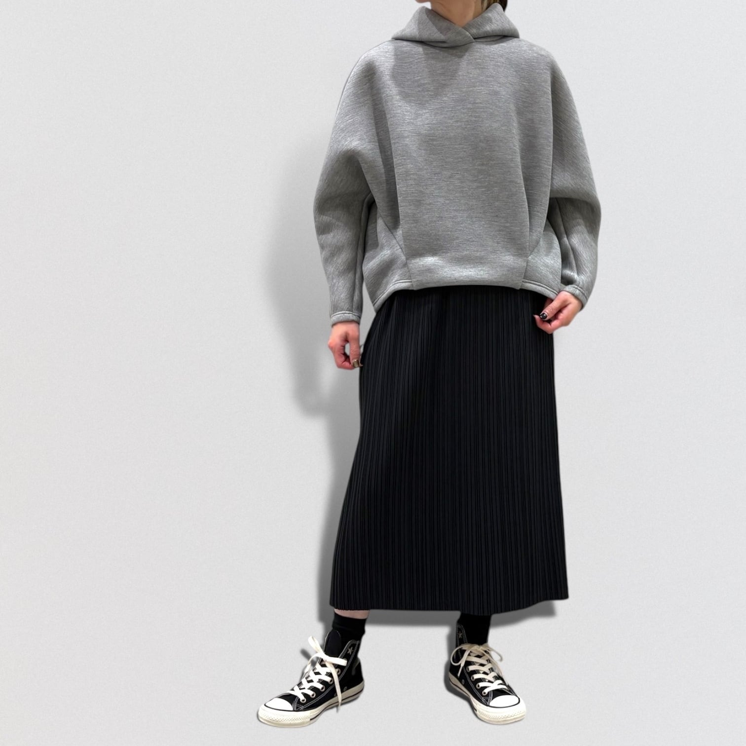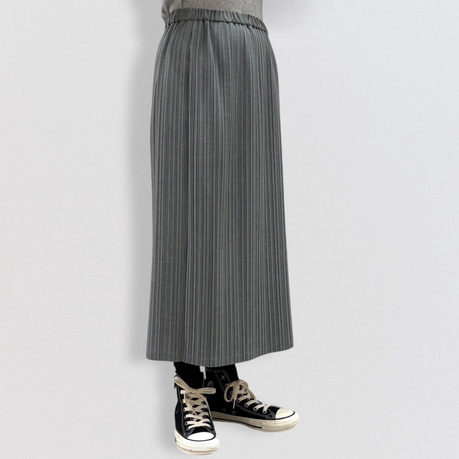 タイトラインに加えランダムな細プリーツになっているのでよりすっきりとしたスカートになっており、着方で遊んでいただくのもおすすめ。