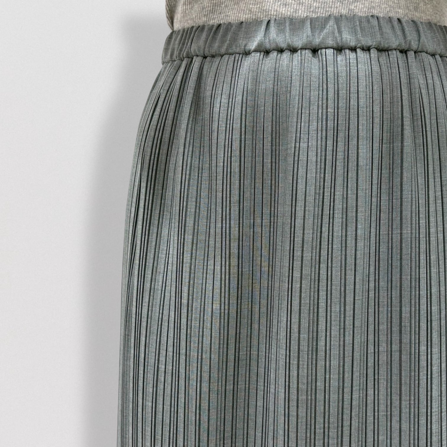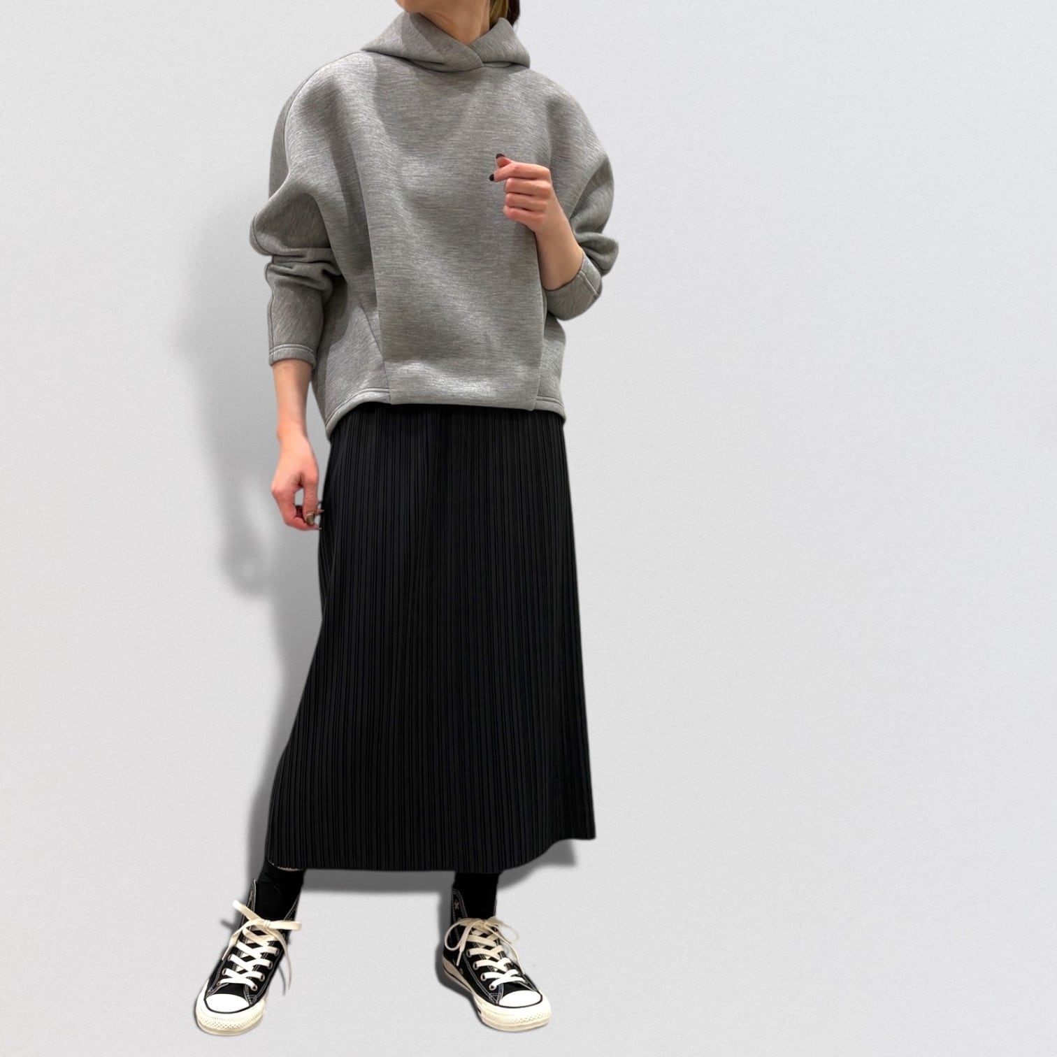 プリーツの広がりは控えめで女性らしい雰囲気を印象付け、ベーシックにもコーディネートができる1枚です。