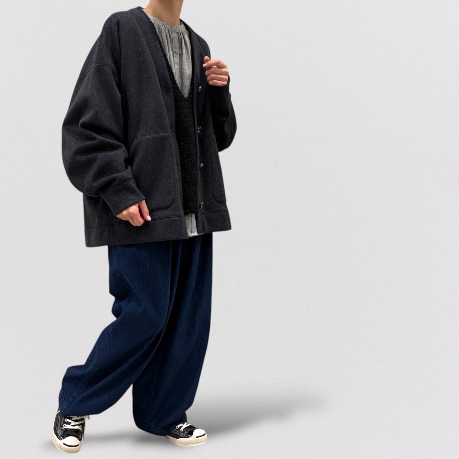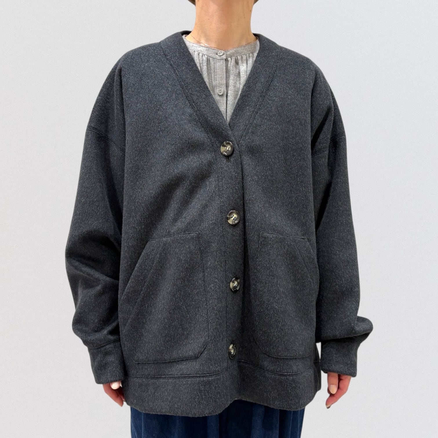 裏地が無いので軽く、羽織りやすいゆったりしたシルエット。