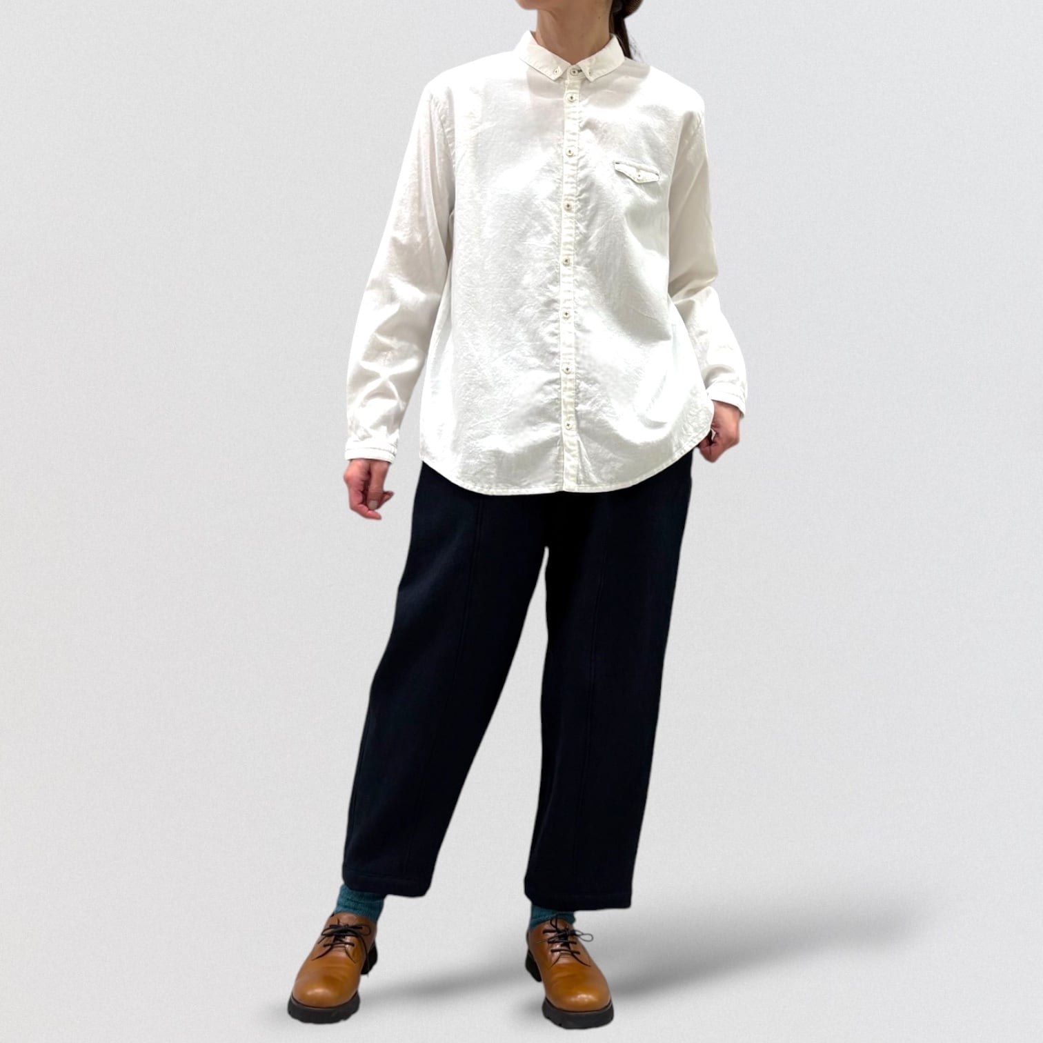 控えめな台衿の高さや、衿巾、釦のサイズ感、コンパクトな設計と配置がポイントです。