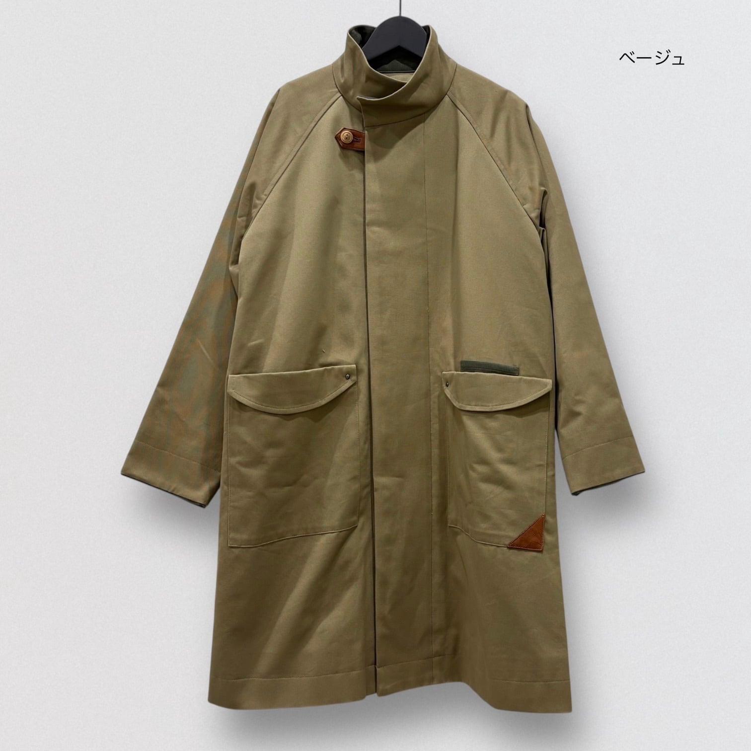 起毛感のあるピーチツイルを使用したスタンドカラーコート。