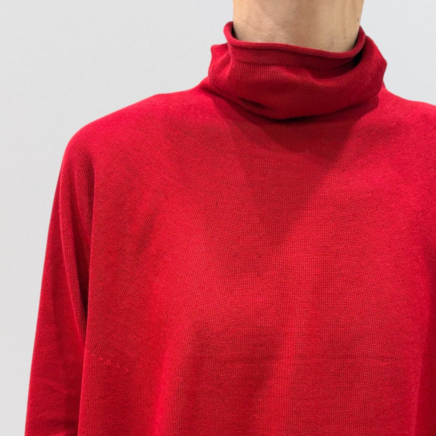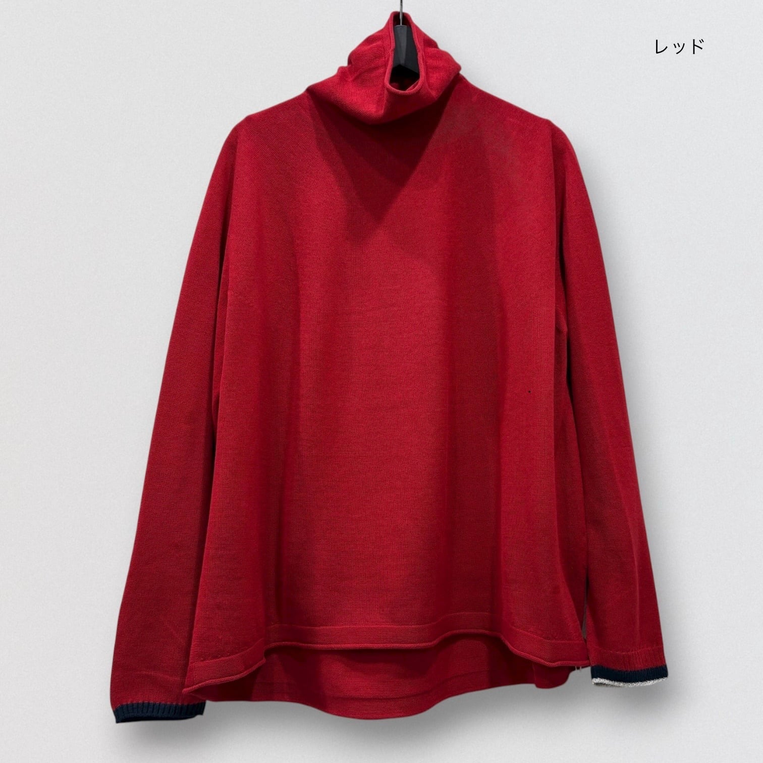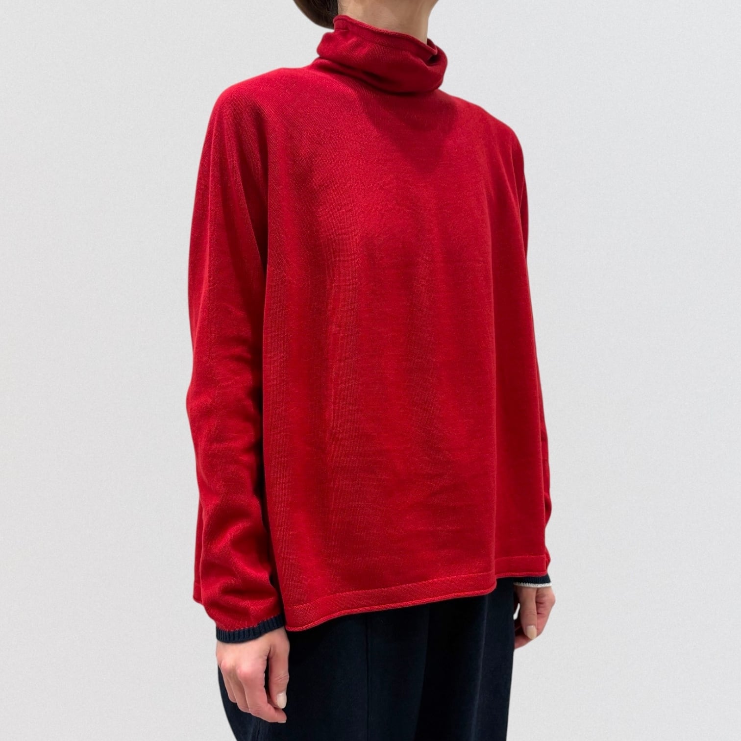 衿が少し下がるふんわりとしたオフタートル。