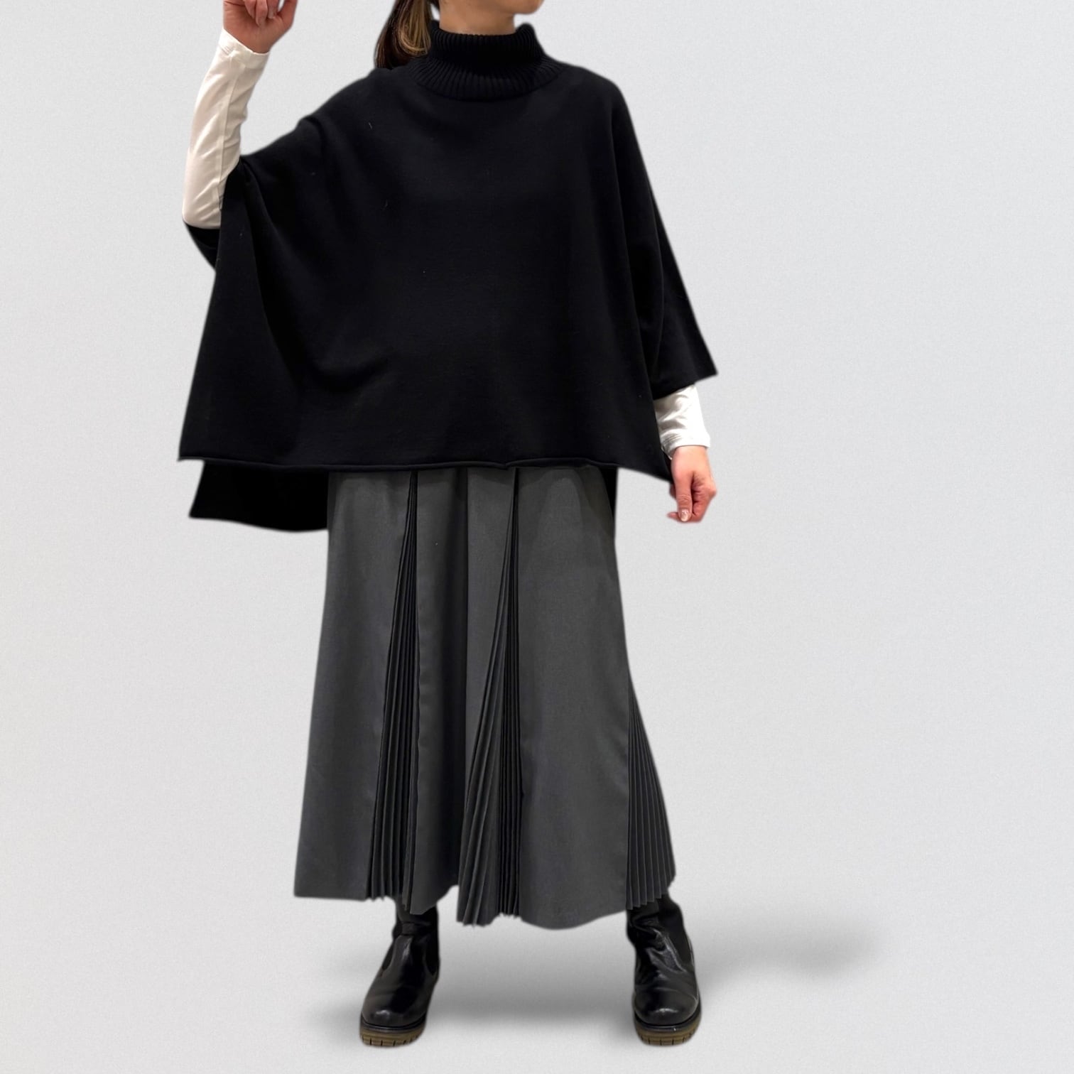 コーディネートに馴染むポンチョは優雅に動きのあるシルエットが印象的。