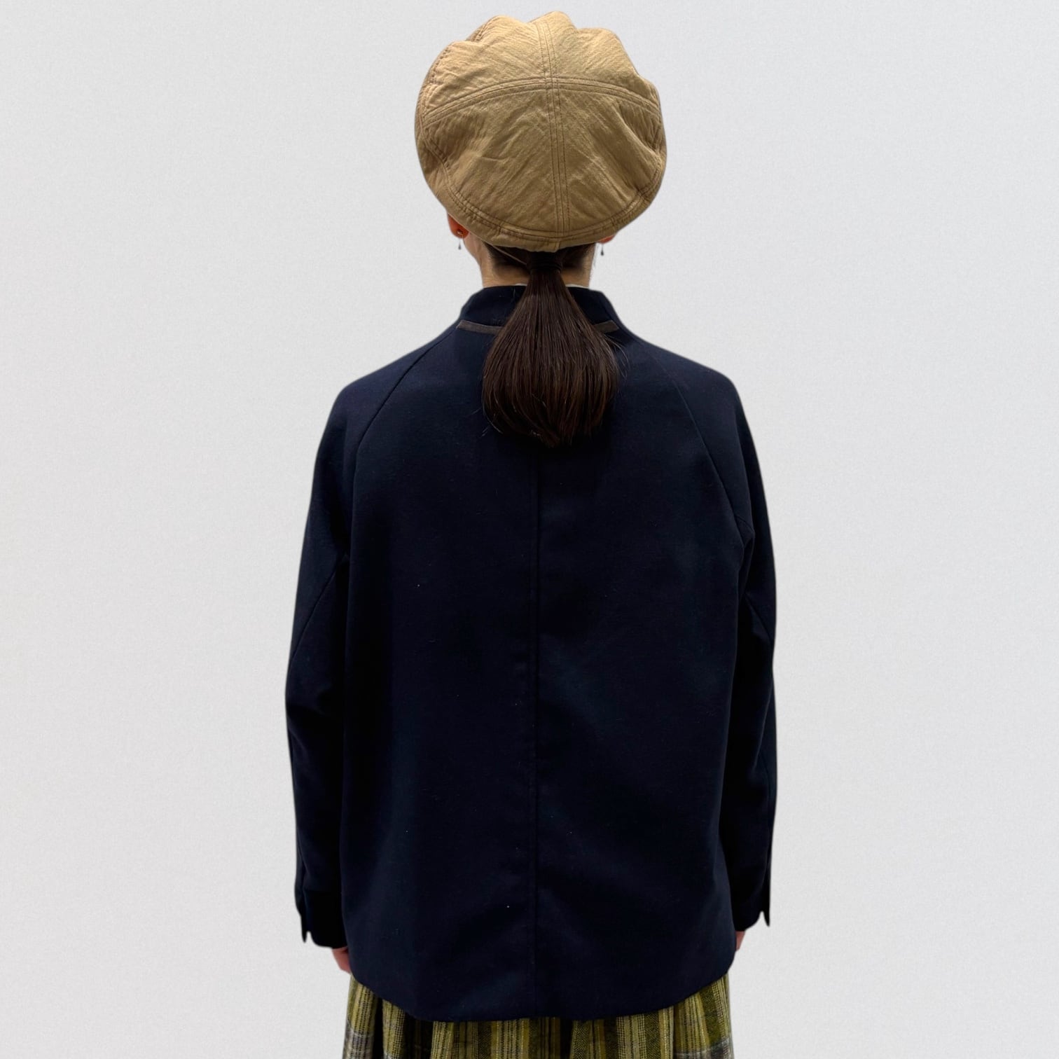 衿元と左袖口に同色の別珍表地で切替になっています。