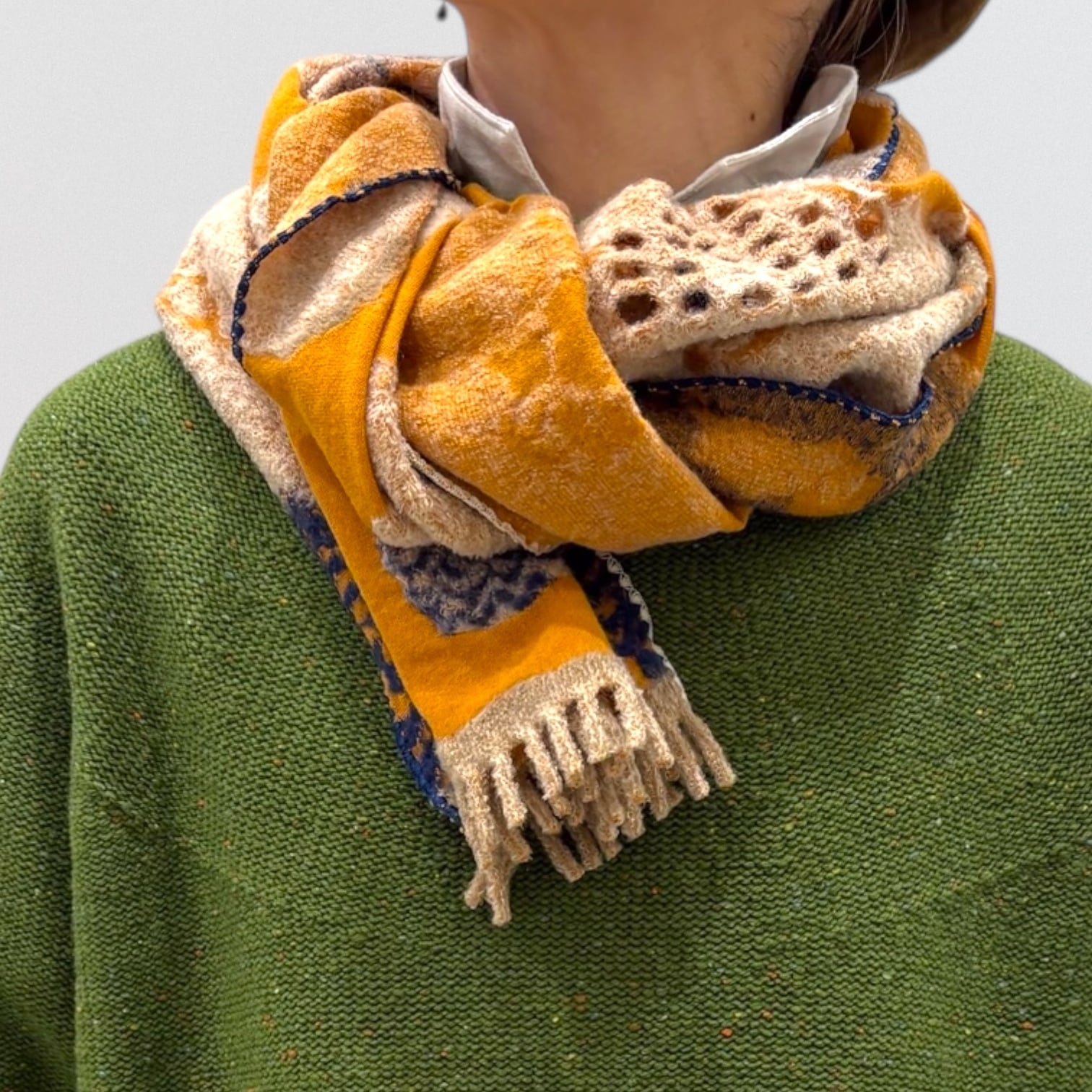 両サイド違う色の変形千鳥ミシンで両裾はフリンジになってます。