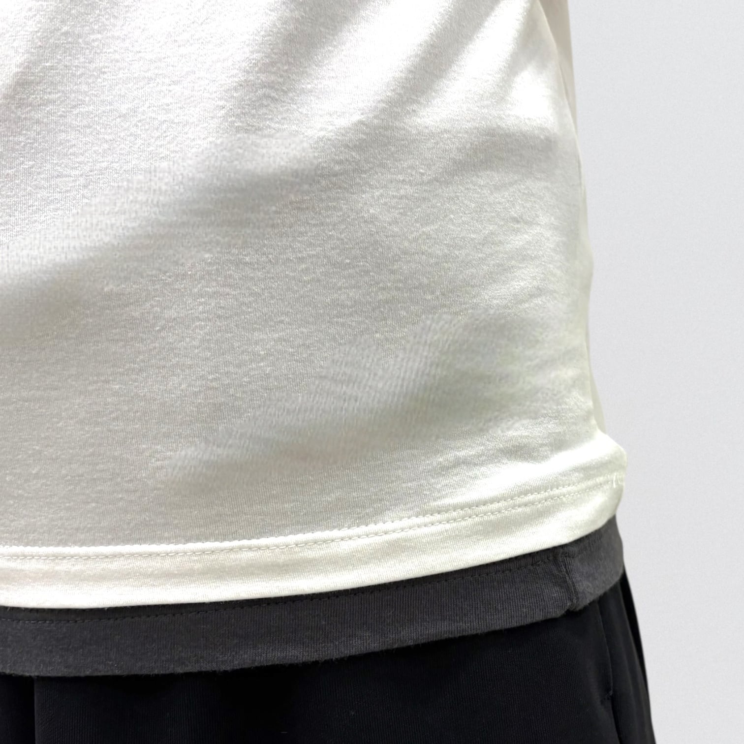 身頃が二重になっており、裾と襟からインナーがのぞいているようなレイヤード風のデザインが特徴のレイヤードTシャツです。