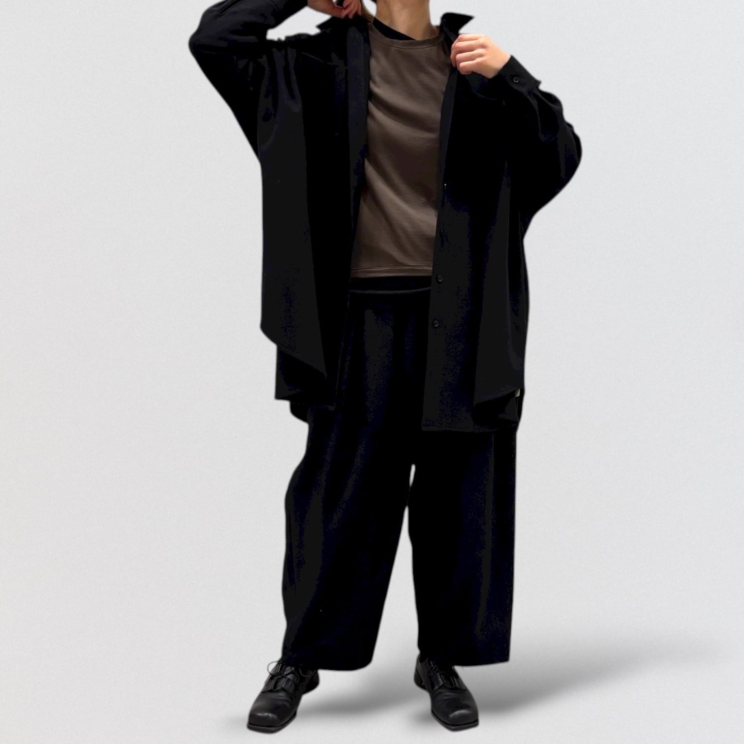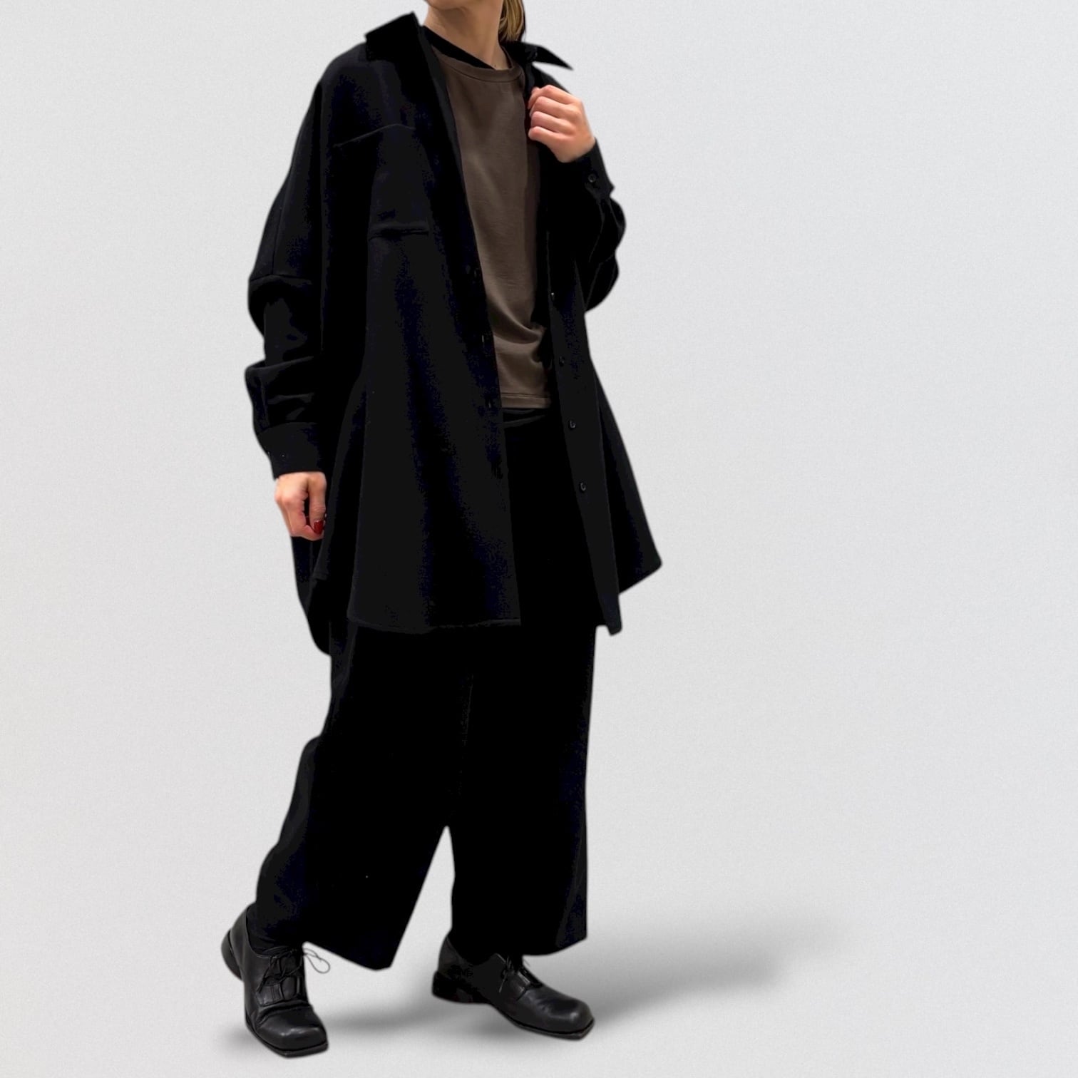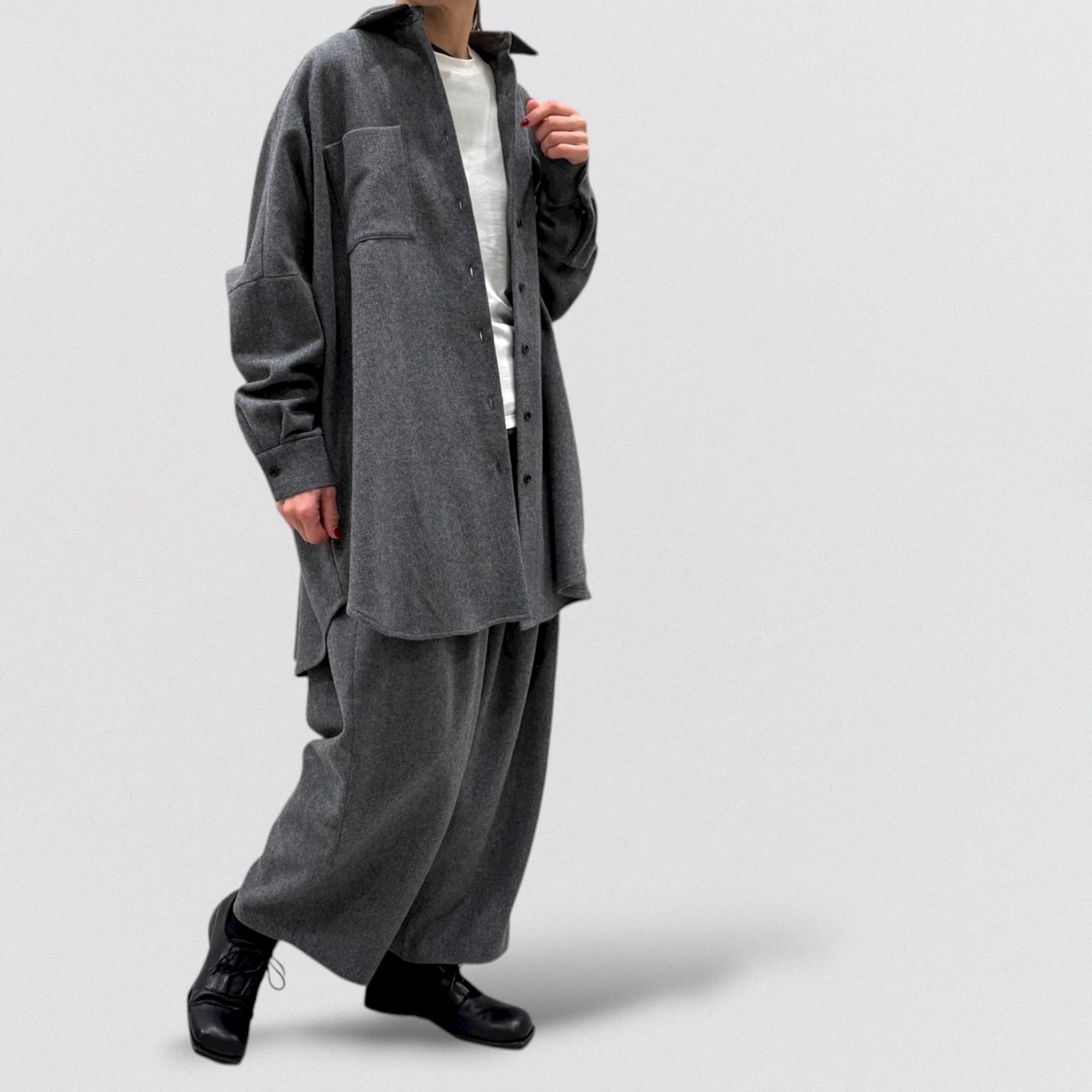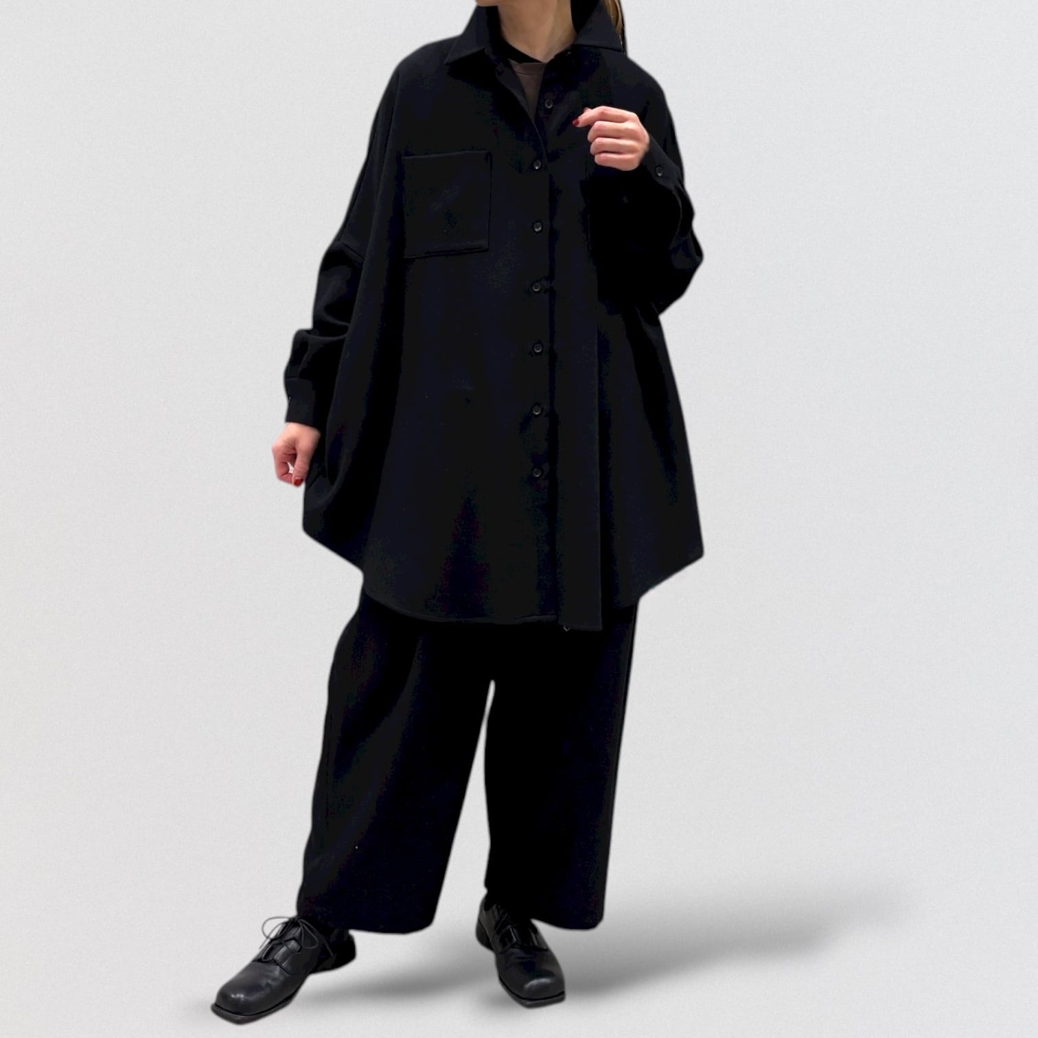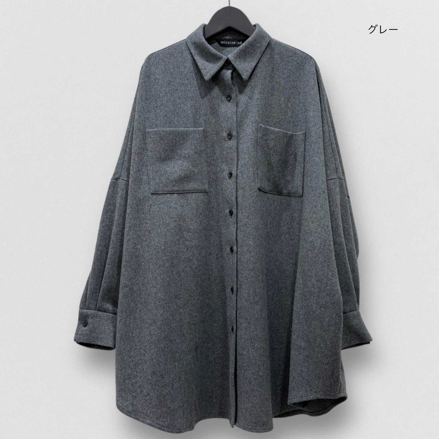 mizuiro indらしいワイドシルエットシャツに胸ポケットがアクセントになったデザインが特徴的。