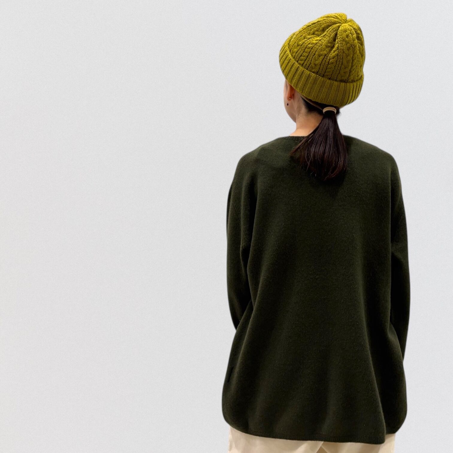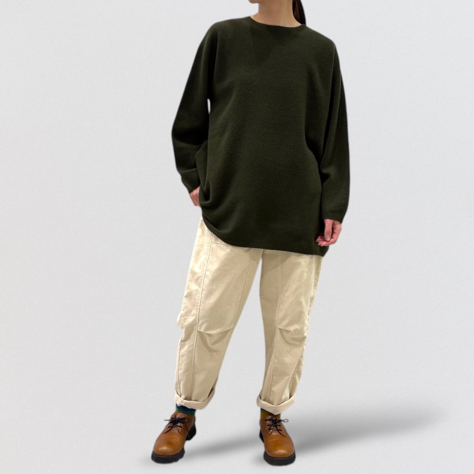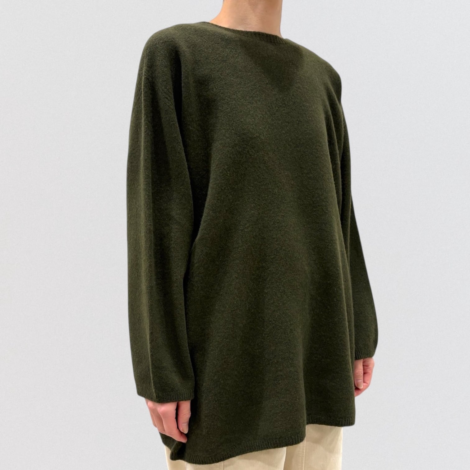 メリノウールの中でもオーストラリア産の上質で細番の原毛を、カシミヤの紡績技術で紡糸した最高級紡毛糸を使用したAラインニットです。