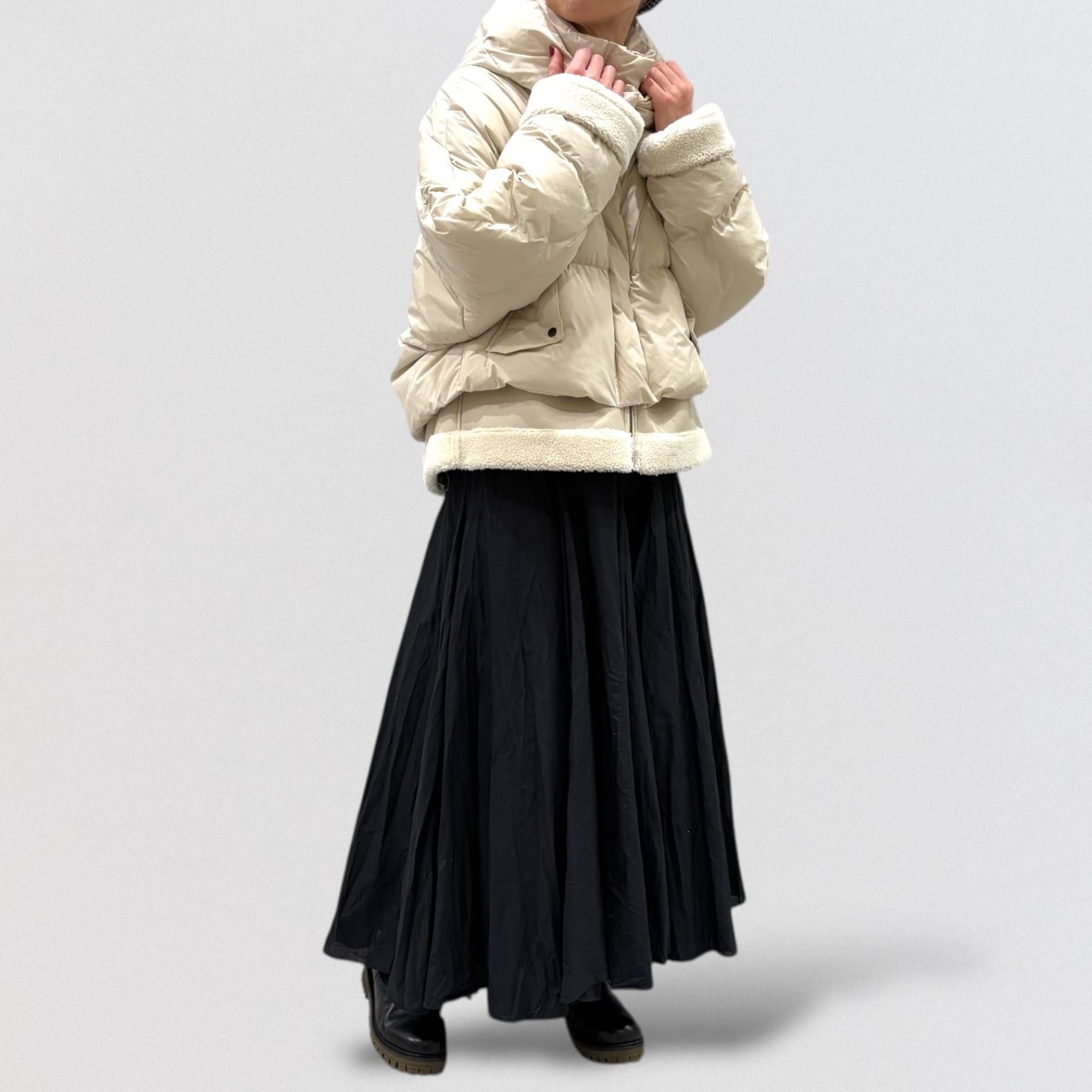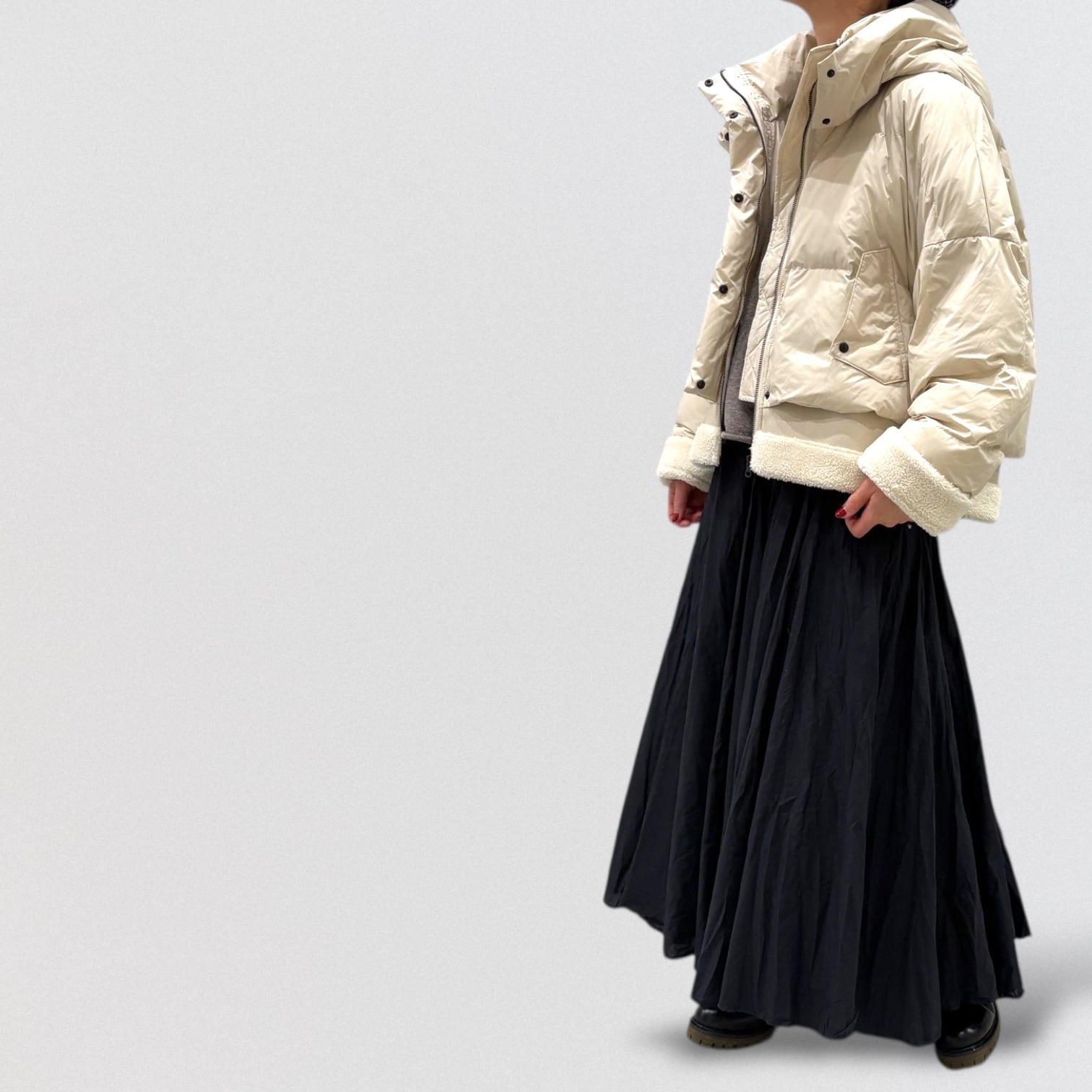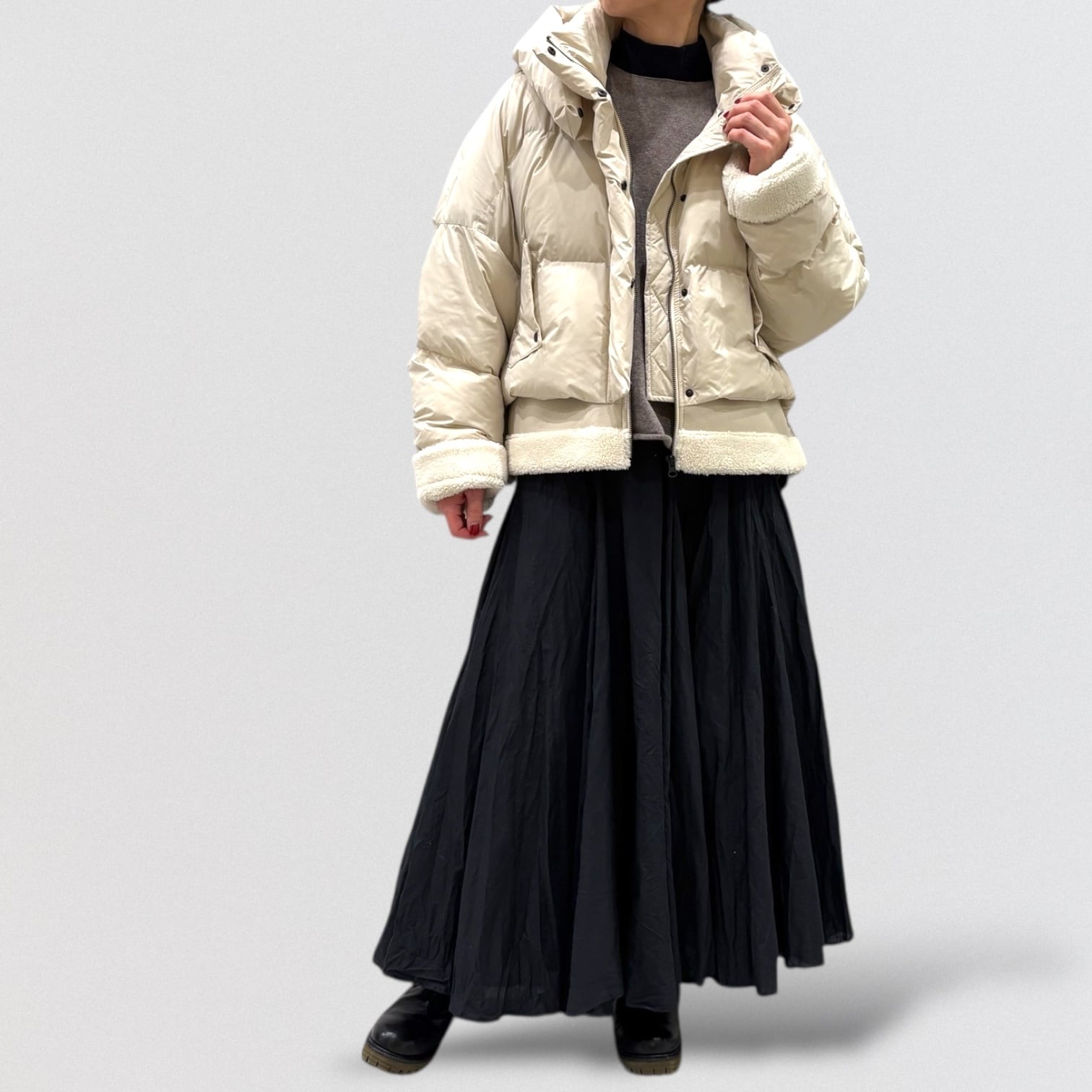 軽さと暖かさはしっかりと、首元をカバーするフォルムと袖口のムートンで真冬にも安心です。