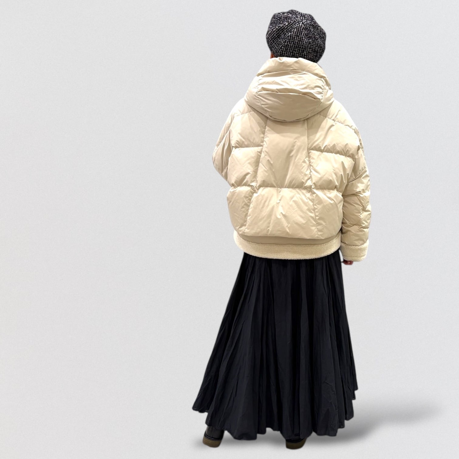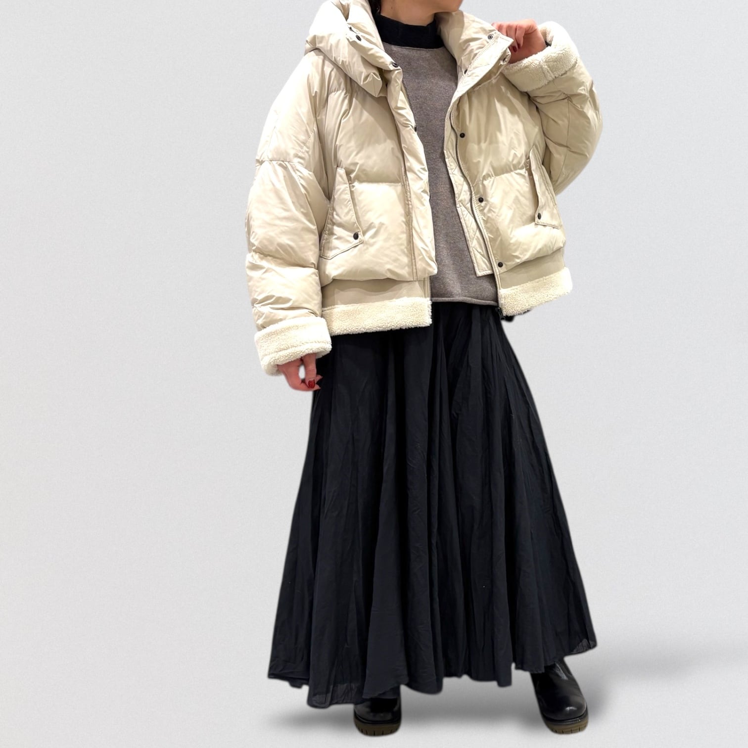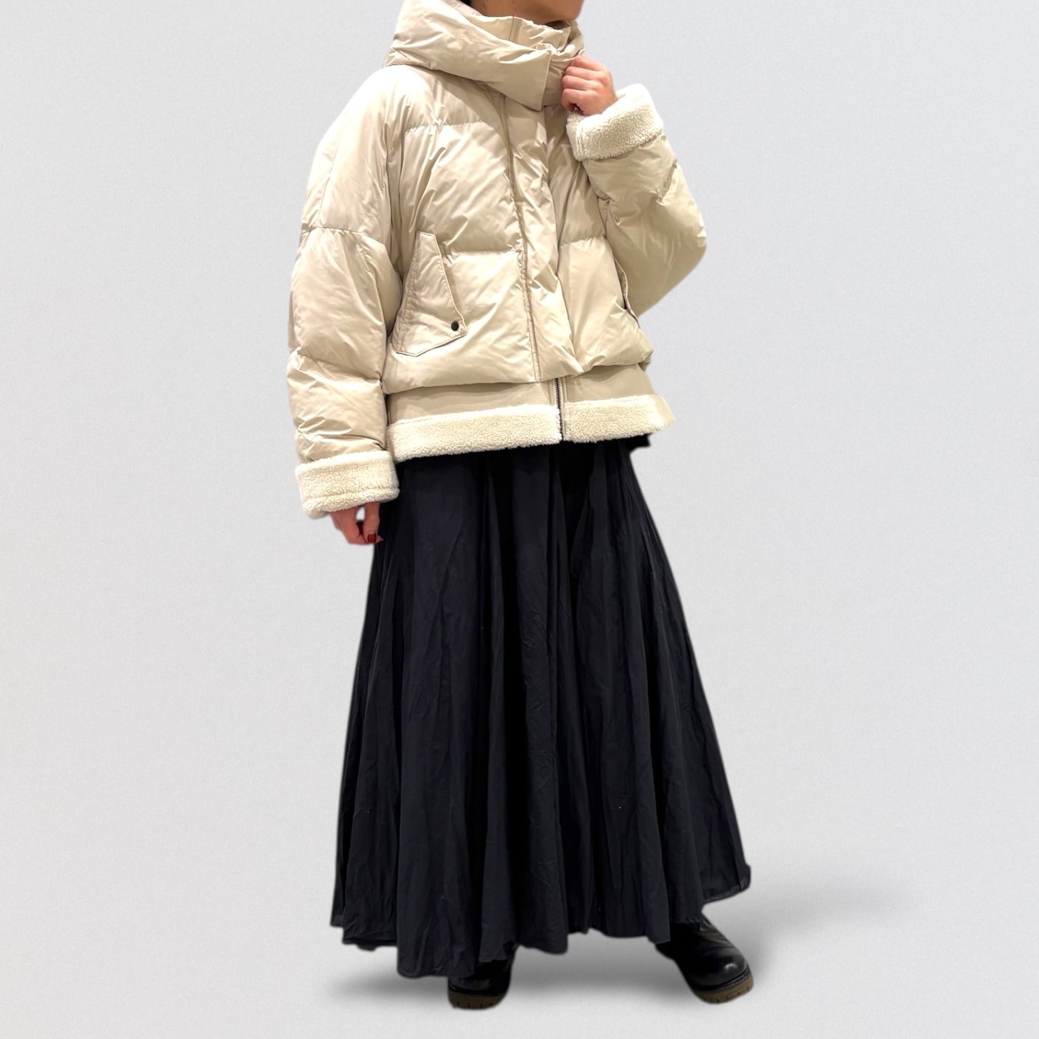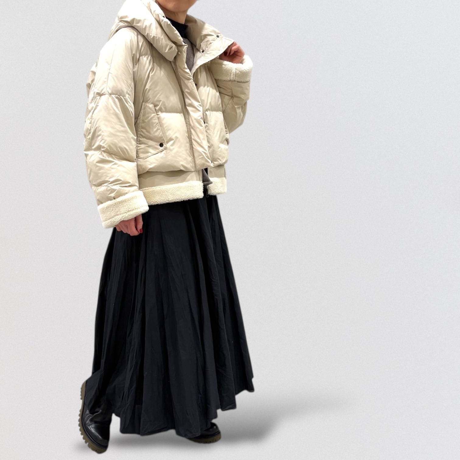 軽さと暖かさはしっかりと、首元をカバーするフォルムと袖口のムートンで真冬にも安心です。