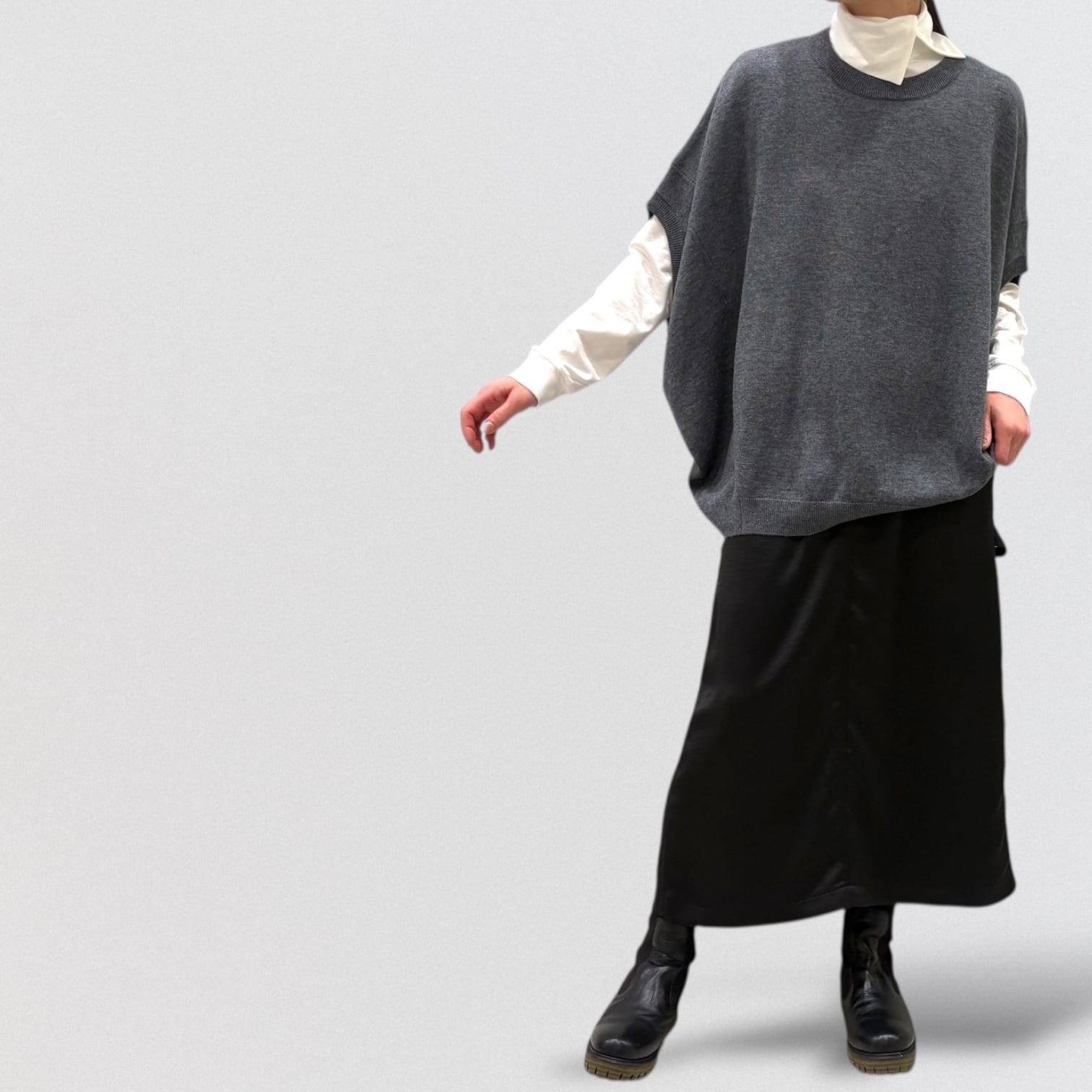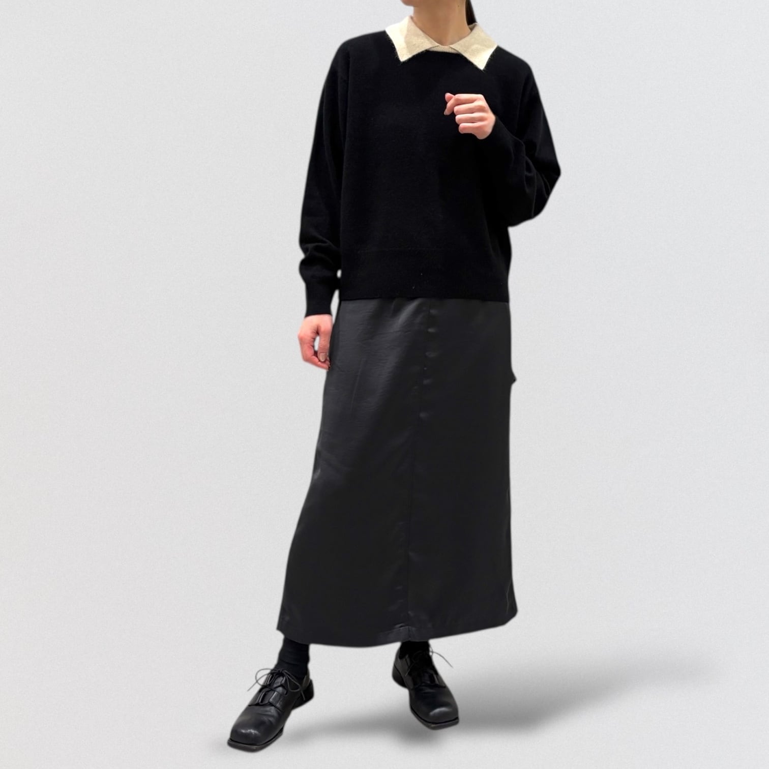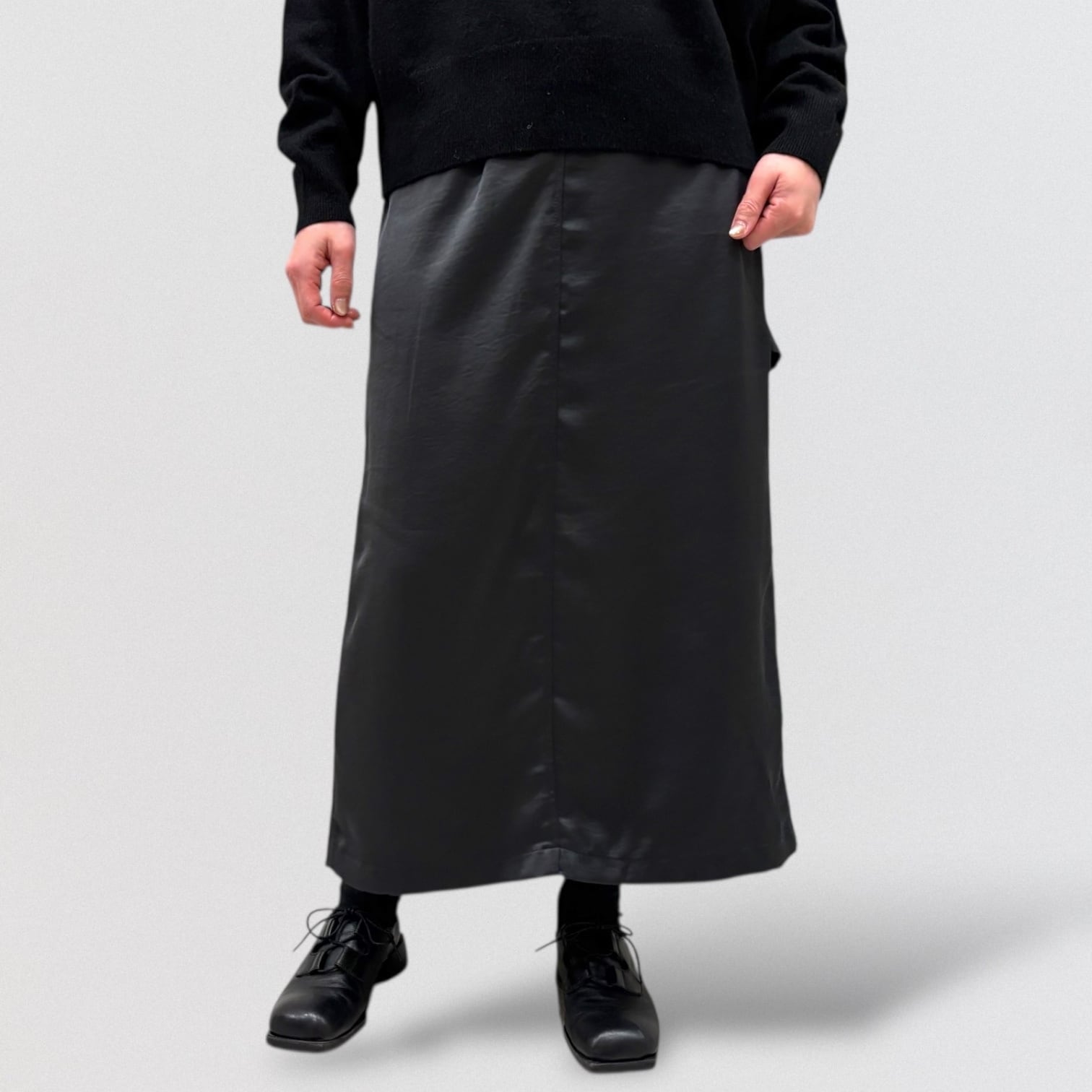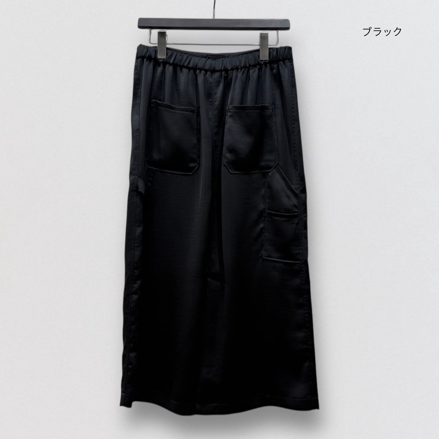 上品なサテン生地にペインターパンツのデザインをプラスしたペインタータイトスカートです。