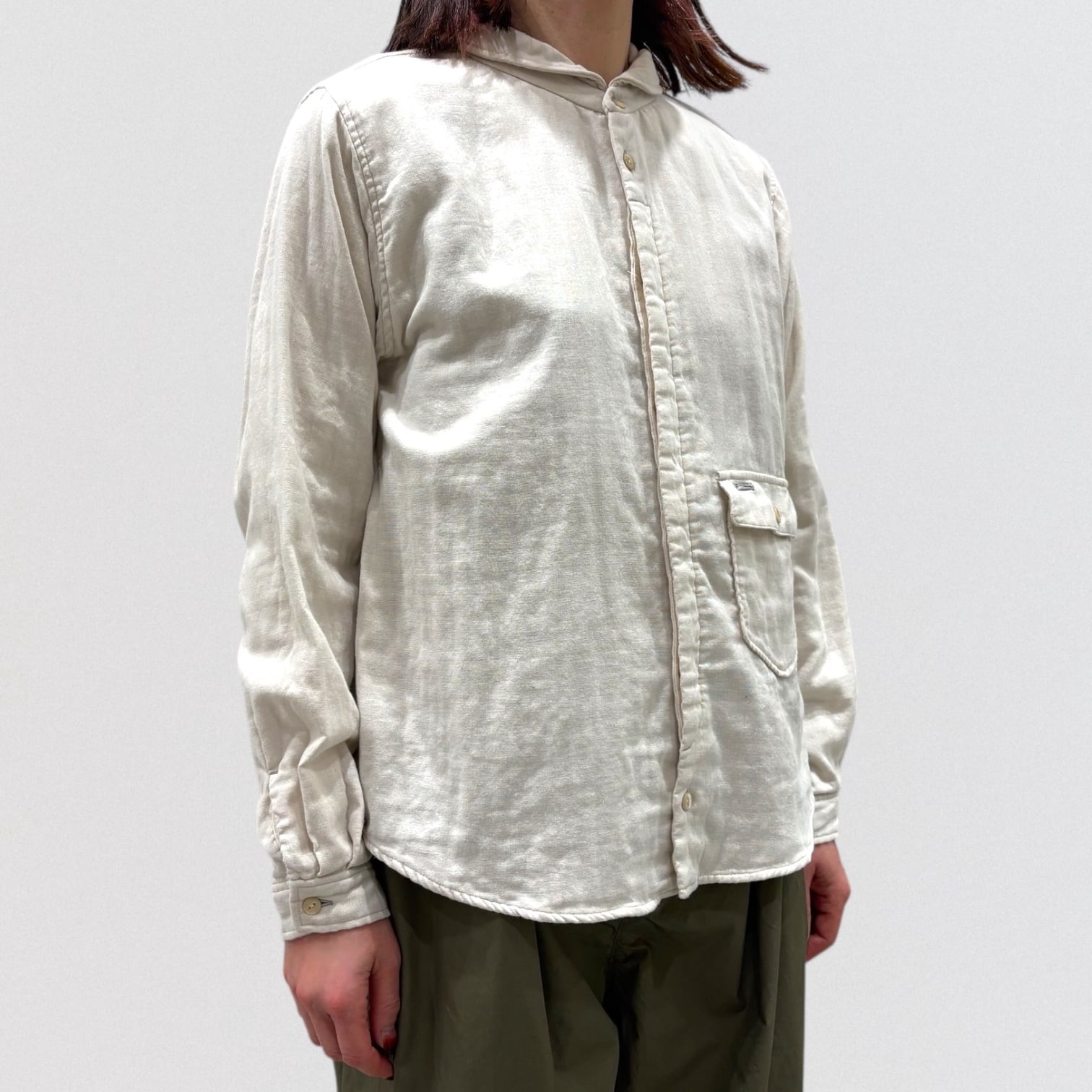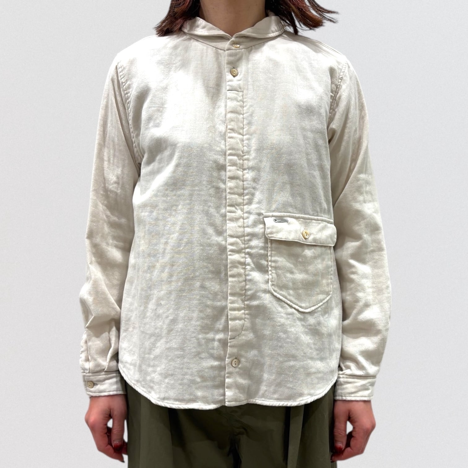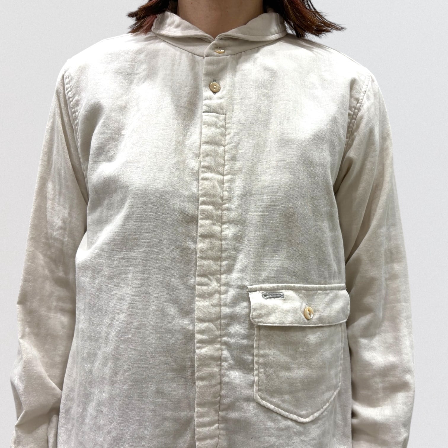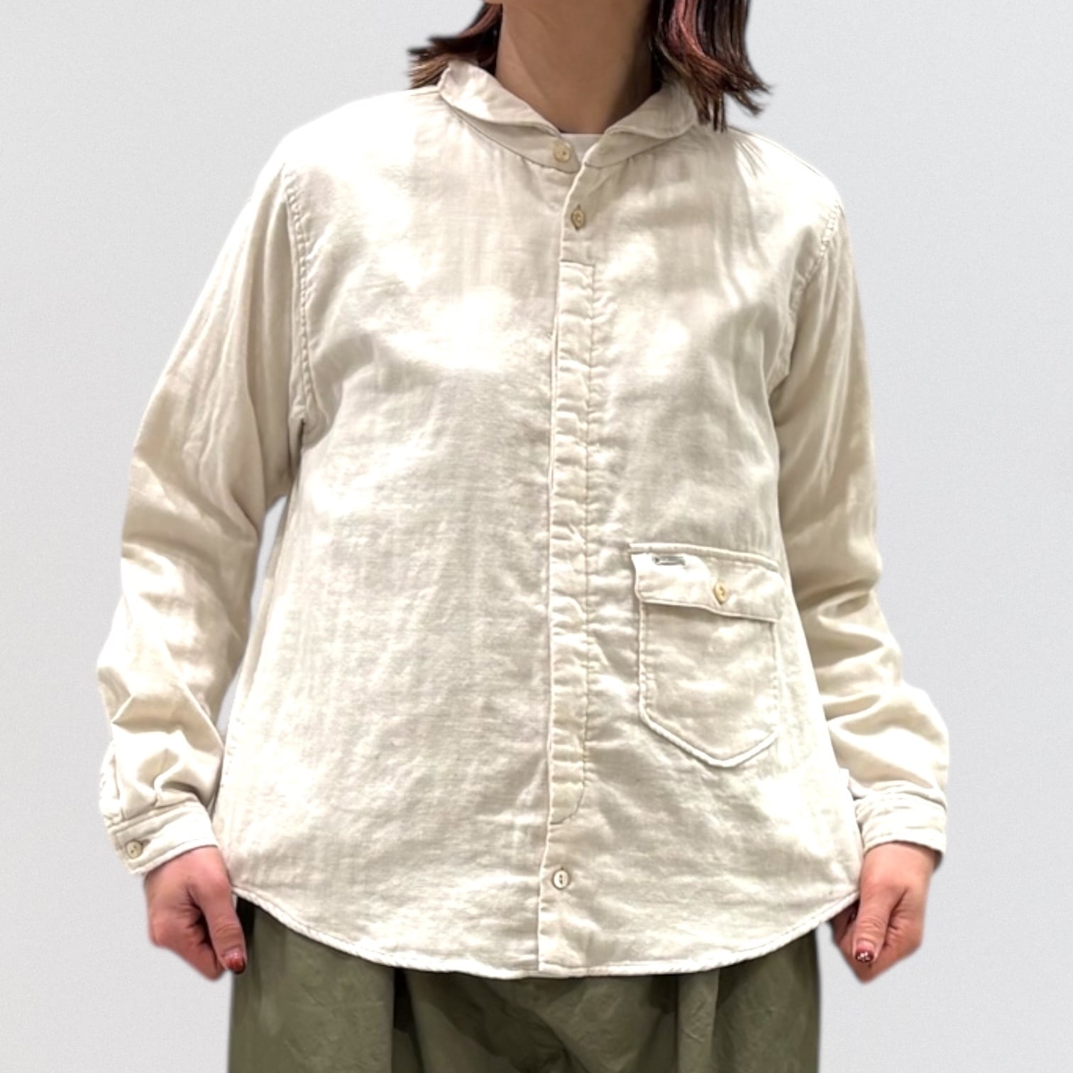 広め開いた形の丸襟、敢えて胸より下に付けたフラップ付きポケット、フロント比翼仕様など、ワークシャツを女性らしく変更しました。