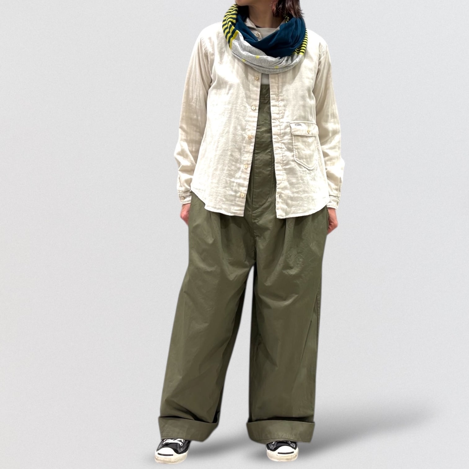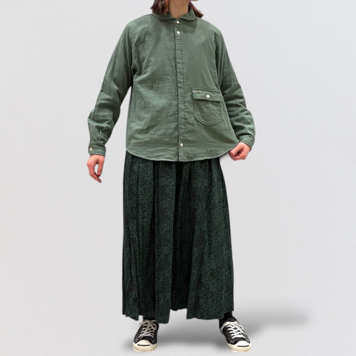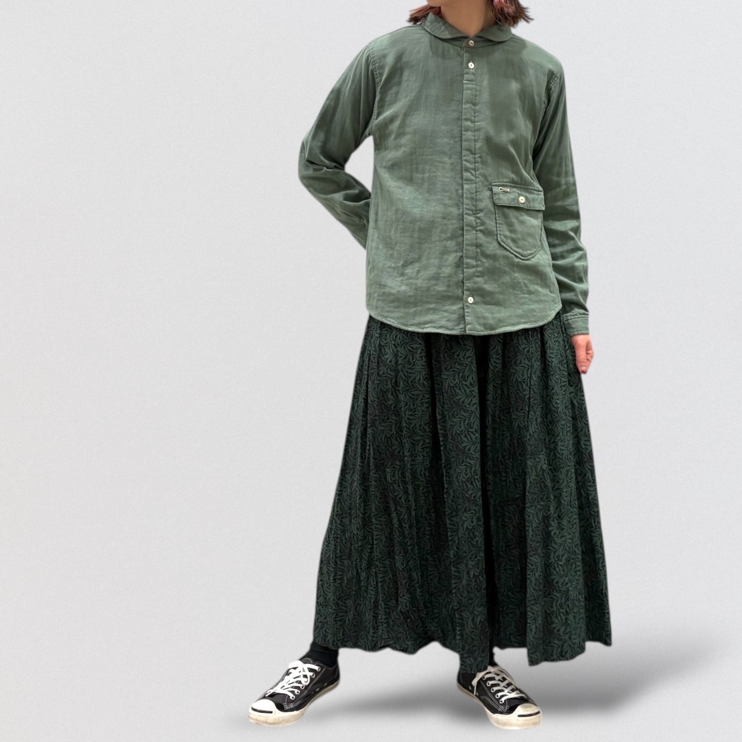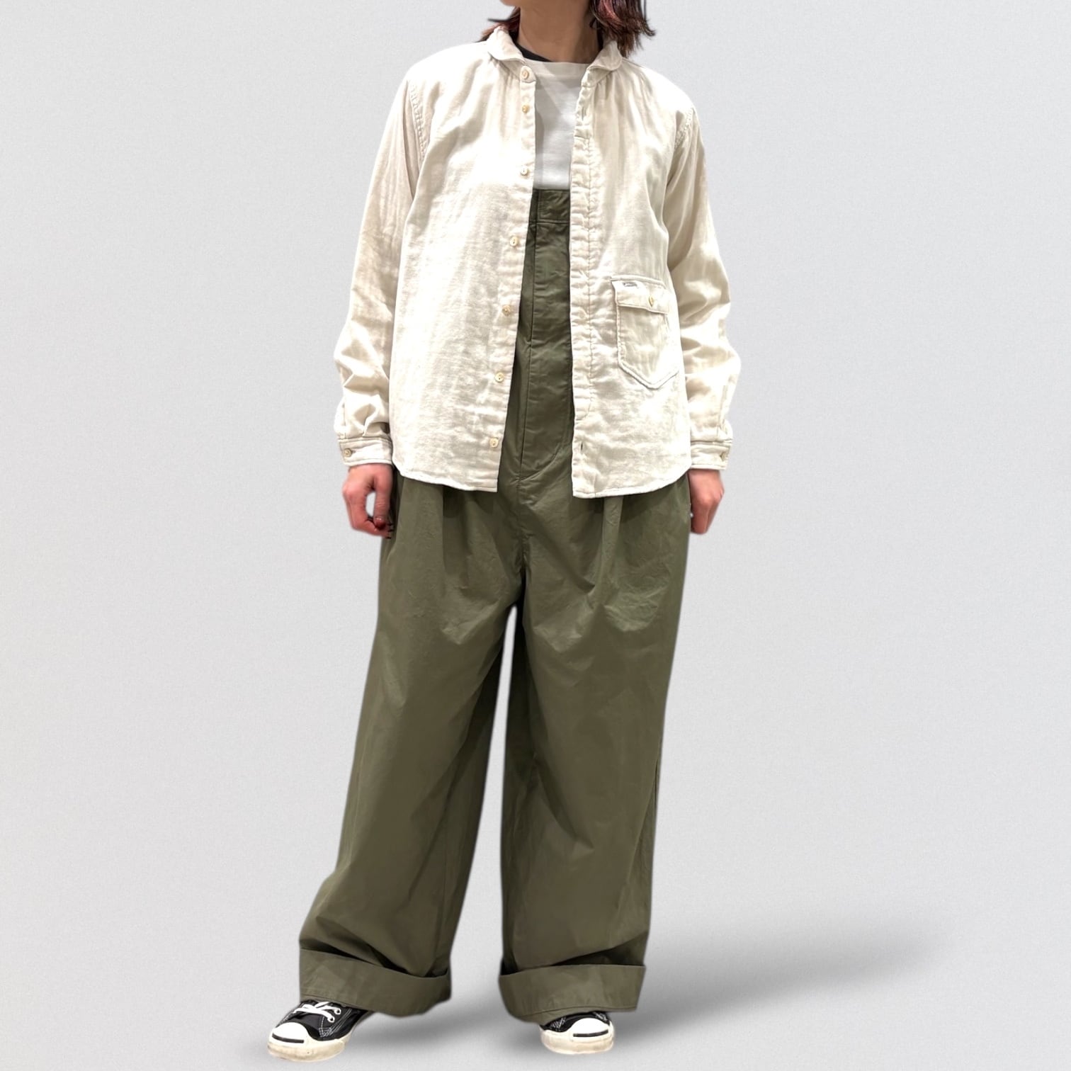 広め開いた形の丸襟、敢えて胸より下に付けたフラップ付きポケット、フロント比翼仕様など、ワークシャツを女性らしく変更しました。