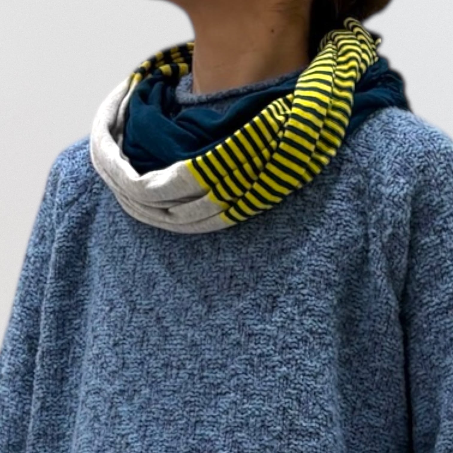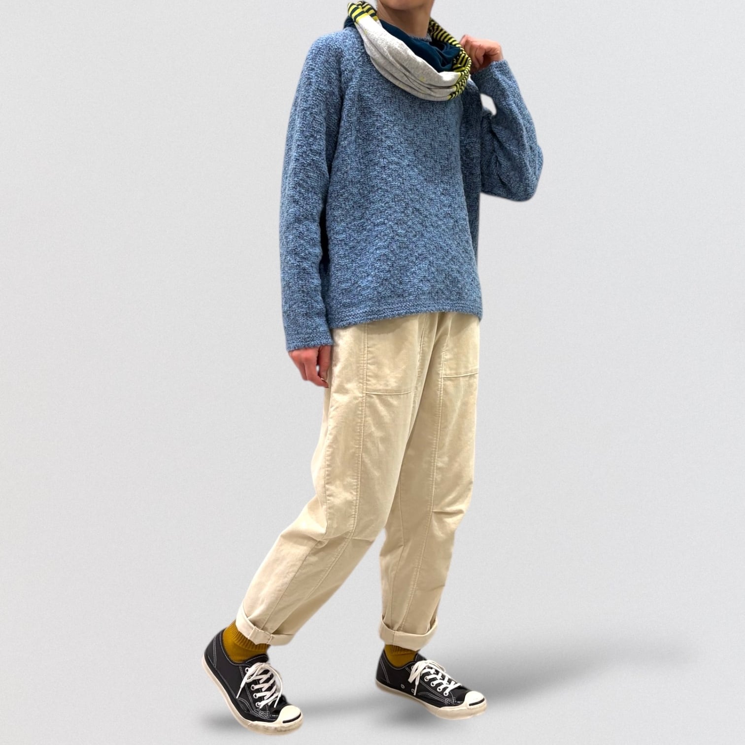 サイズ感は、二巻した際に首にゆとりが出るようにしています。