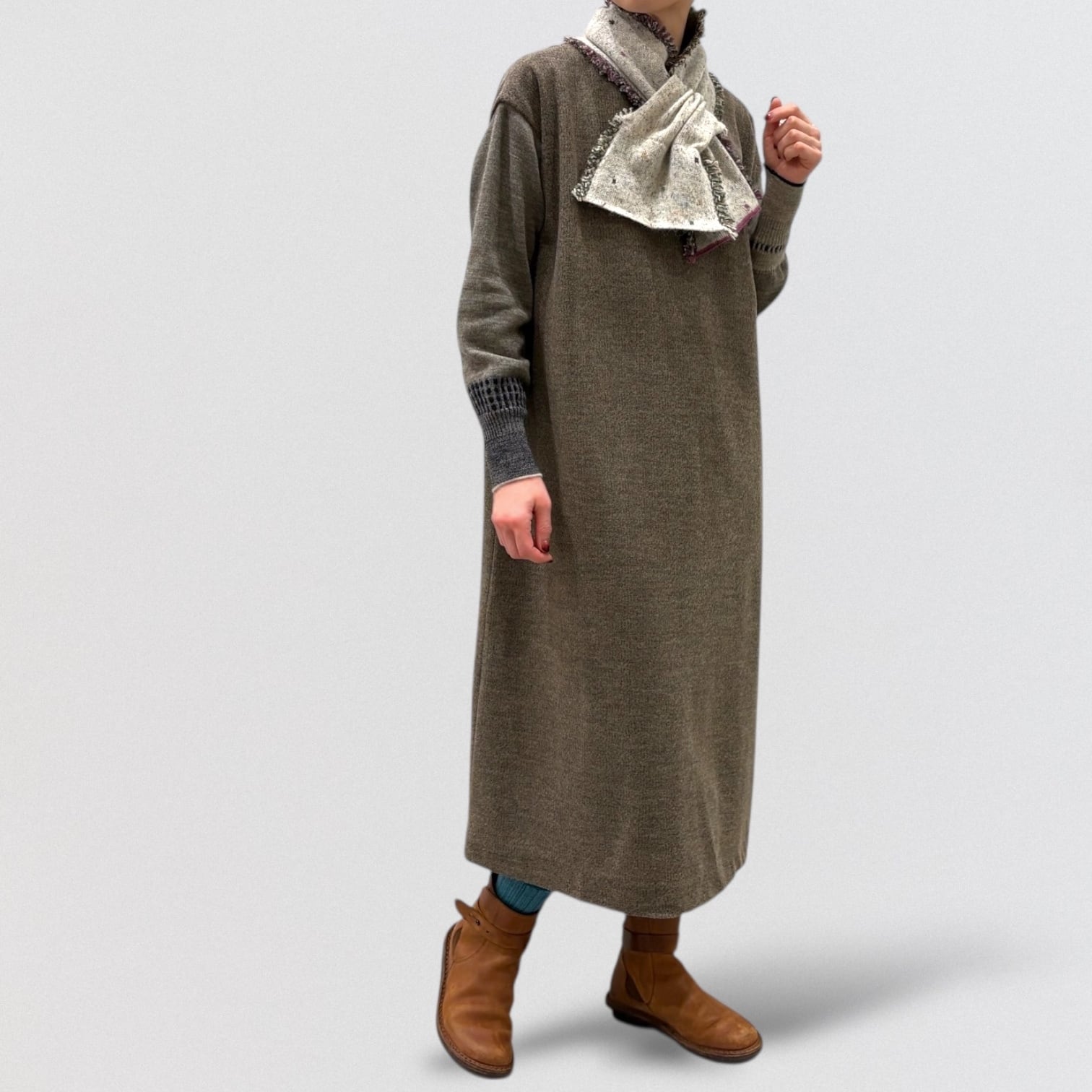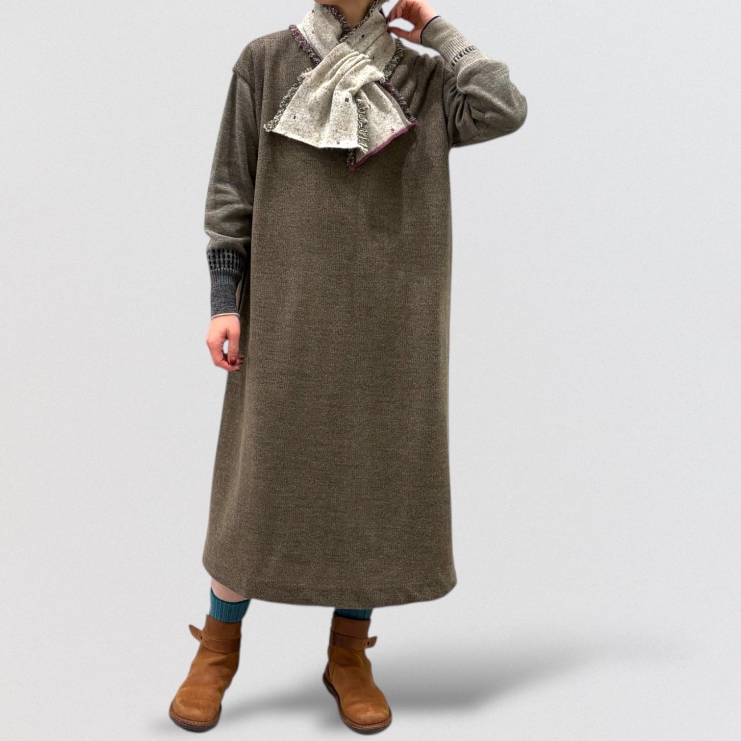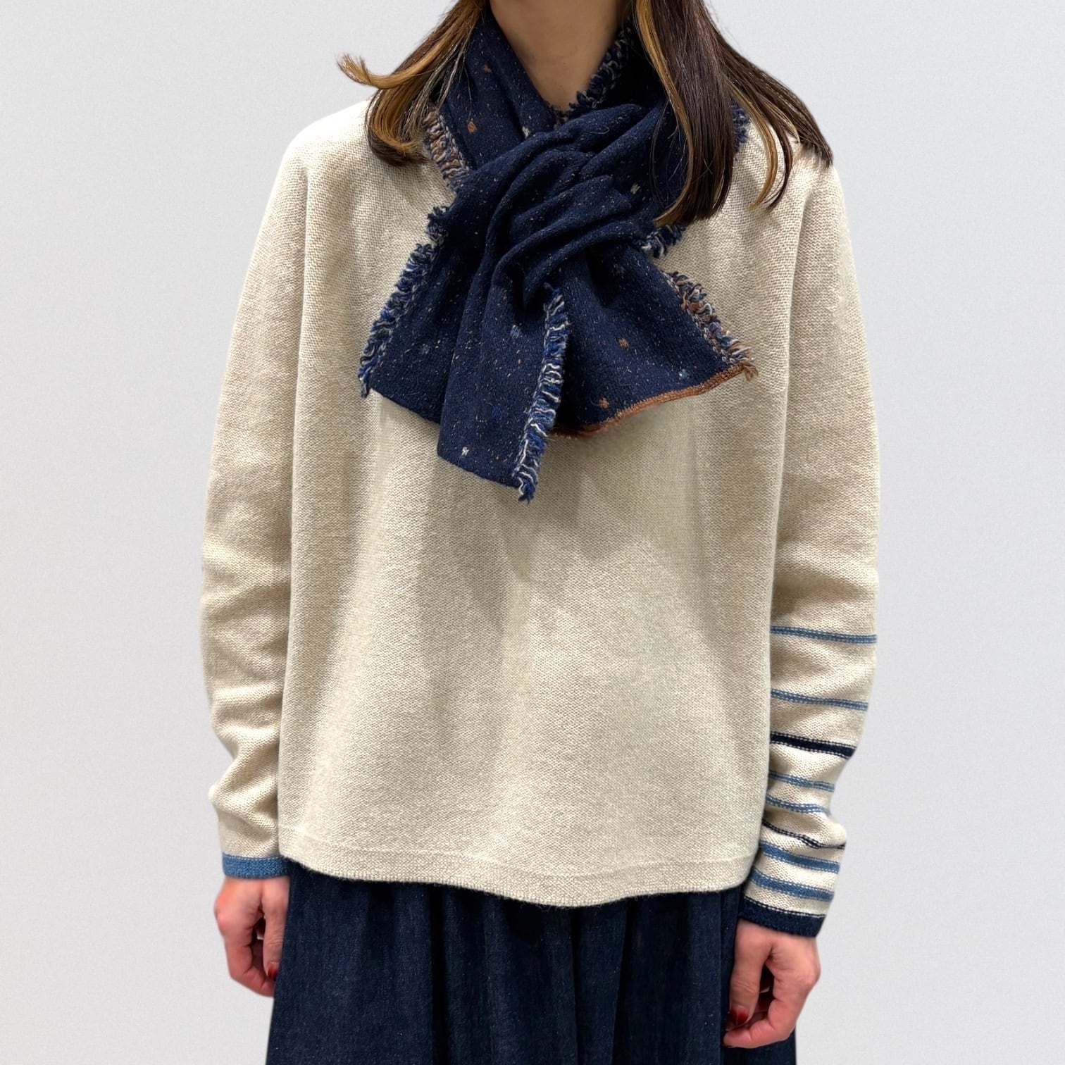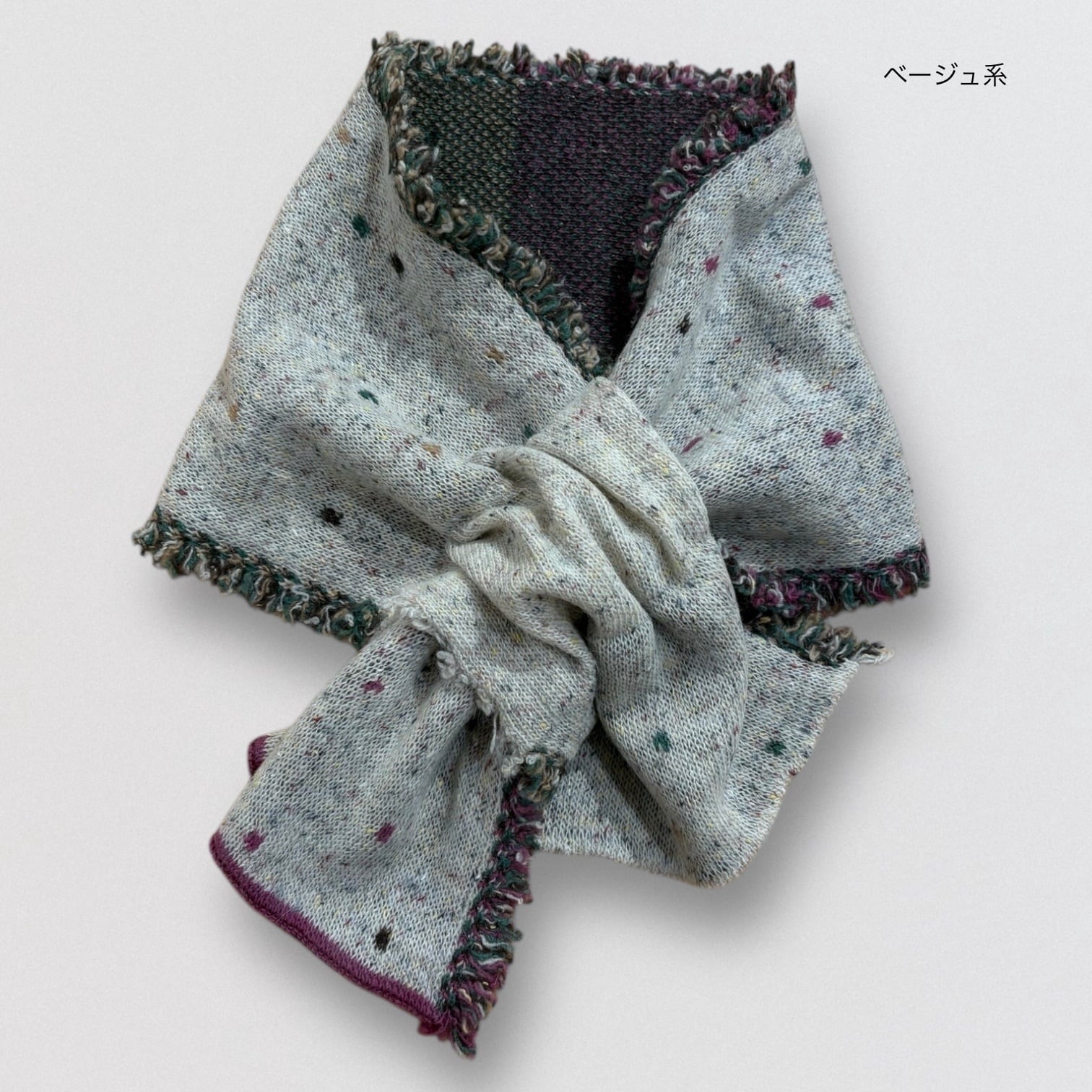 マフラーの両サイドにカラフルなフリンジのついたジャガード差し込みマフラー。