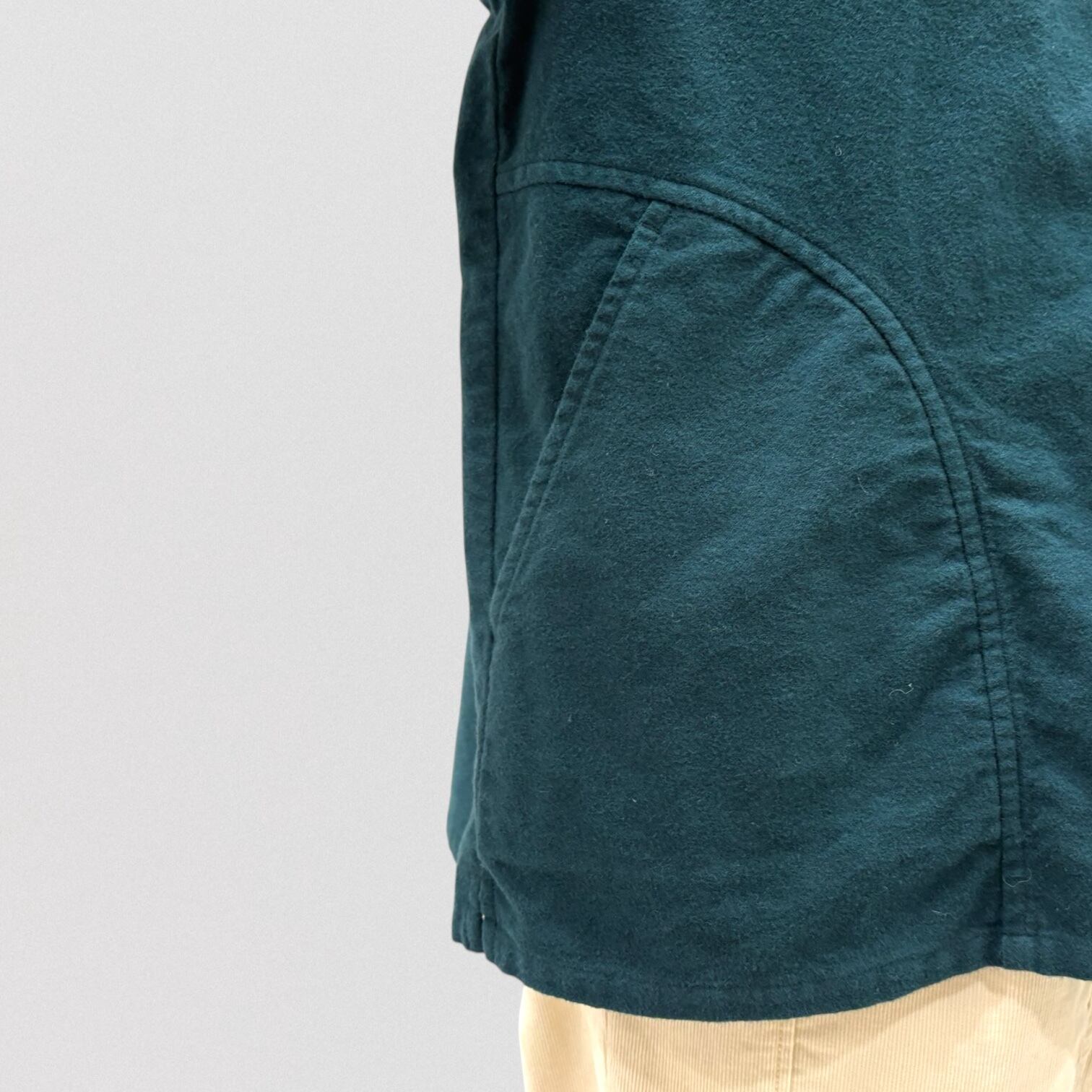 通常アウトポケットにするラウンドポケットを、前身頃を完全に切り替えたデザインのポケットに。