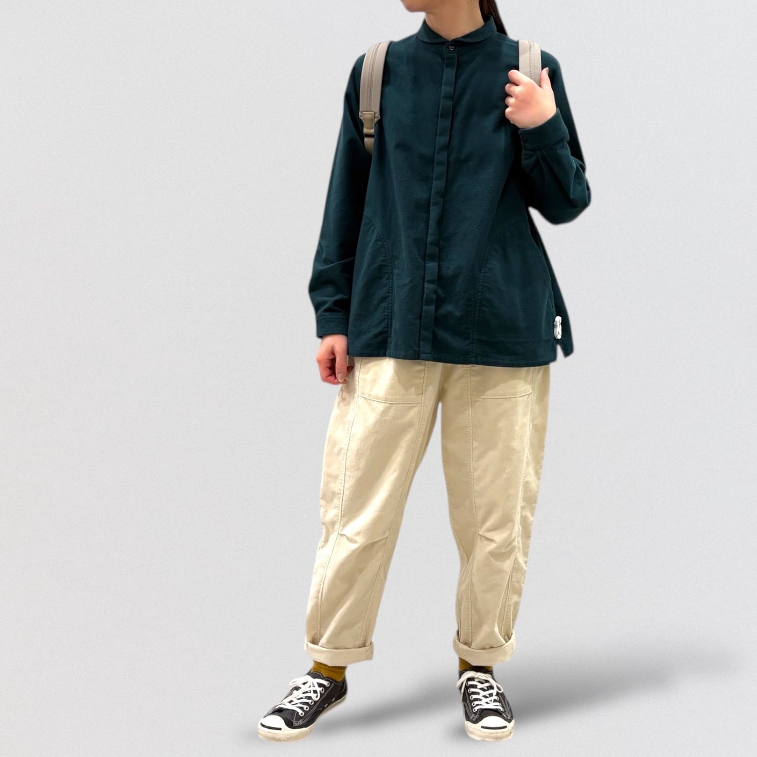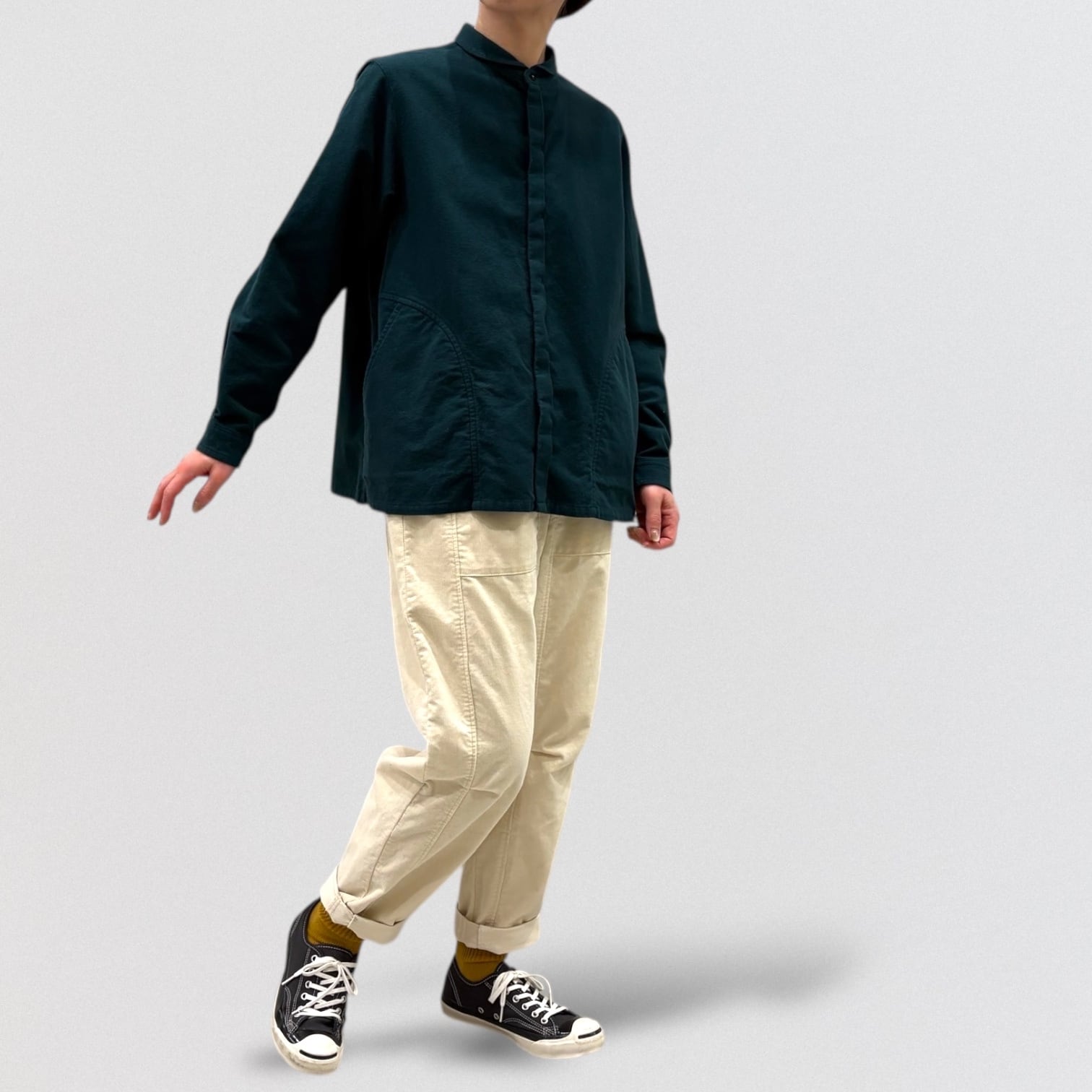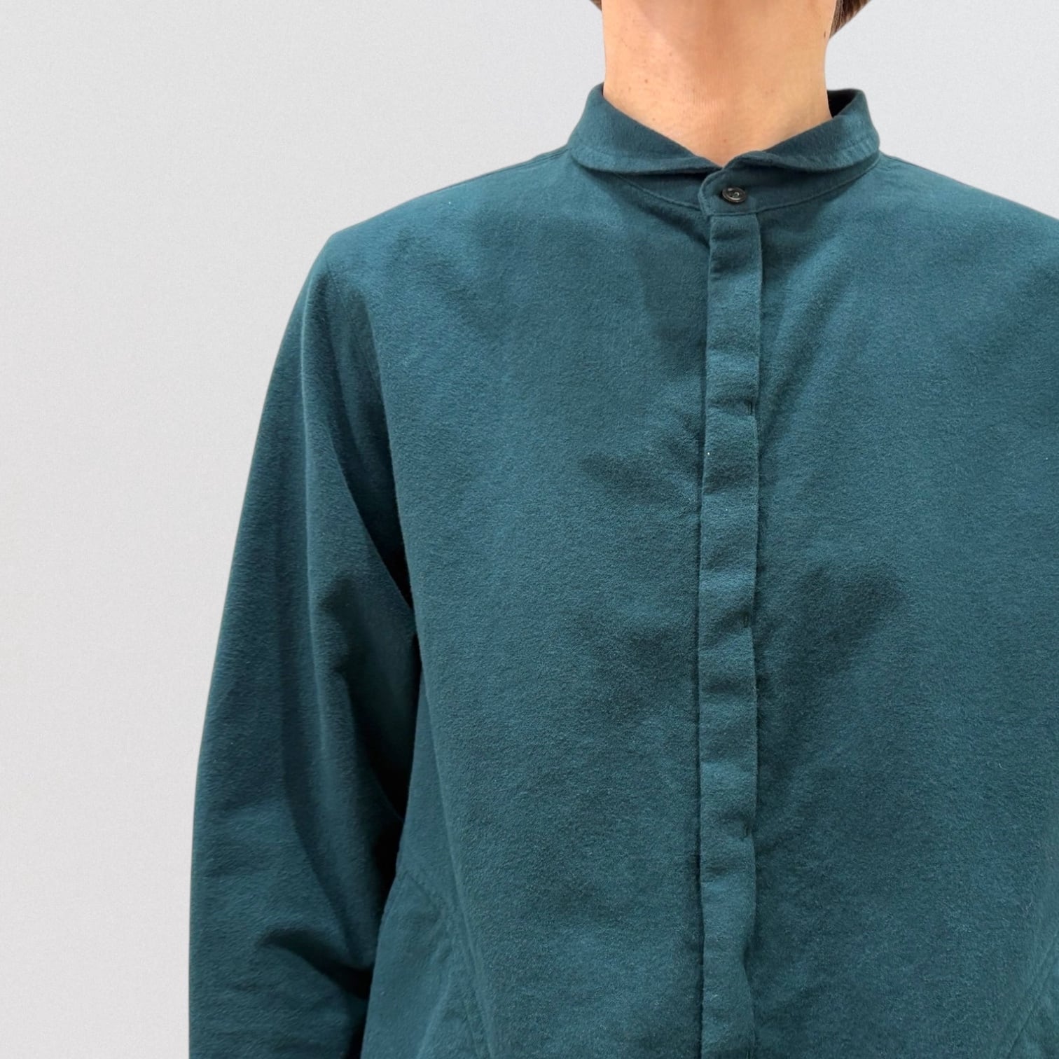 シャープなラウンドカラーもワークテイストに落とし込みました。