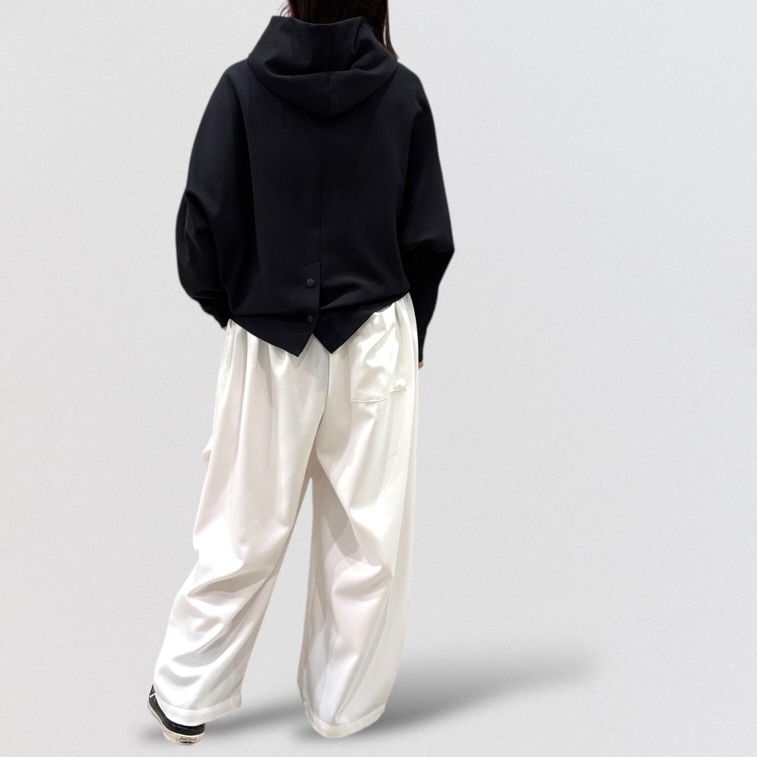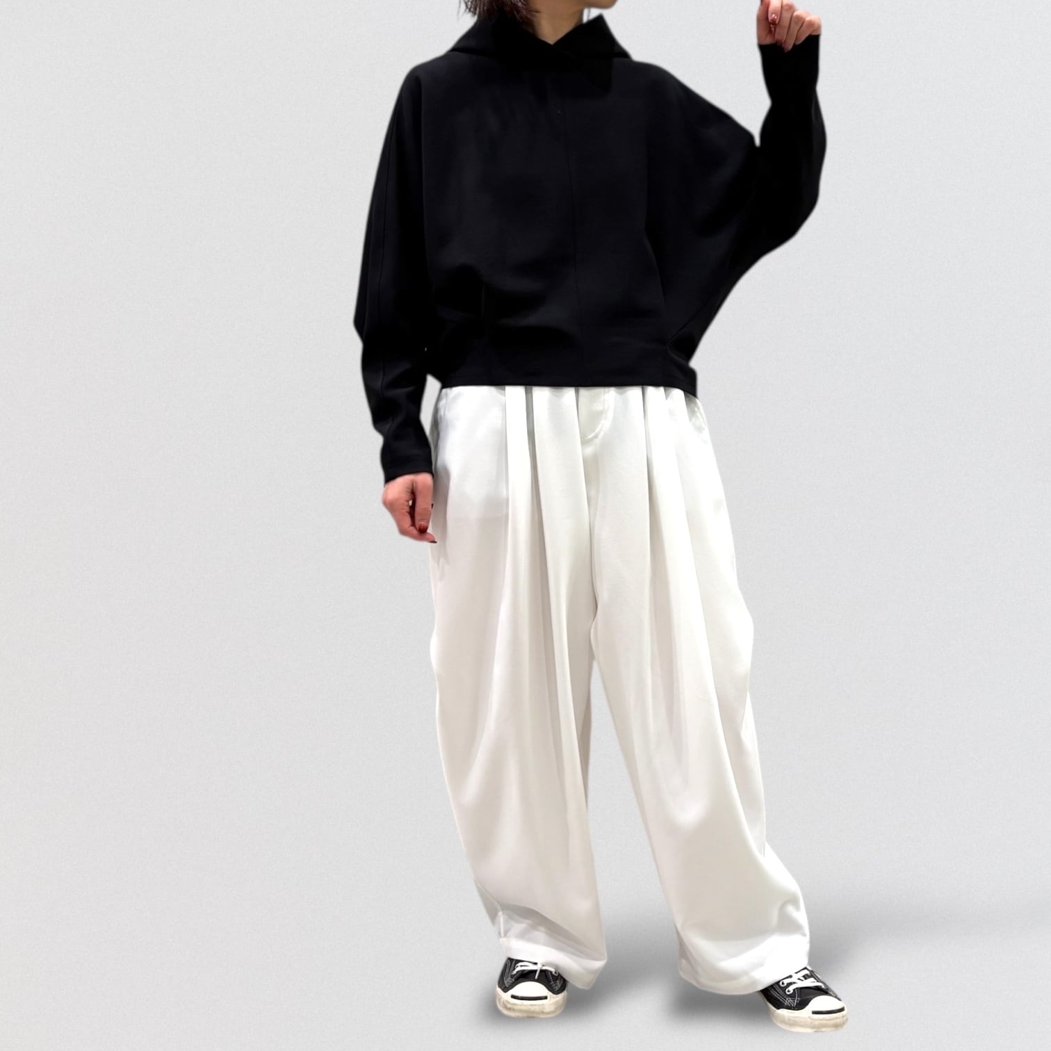 ドルマンで動きやすさを追求し、リラックスしたスタイルを実現します。
