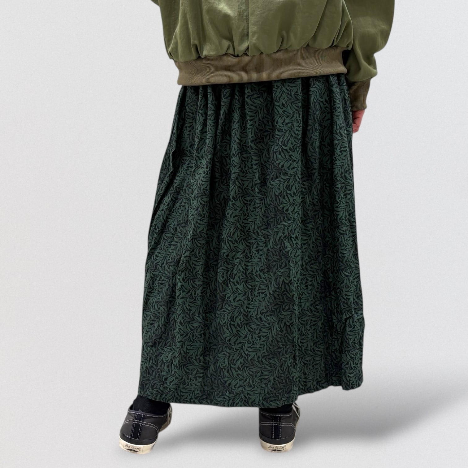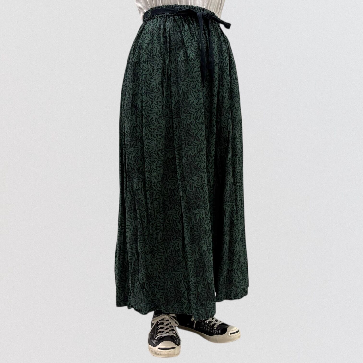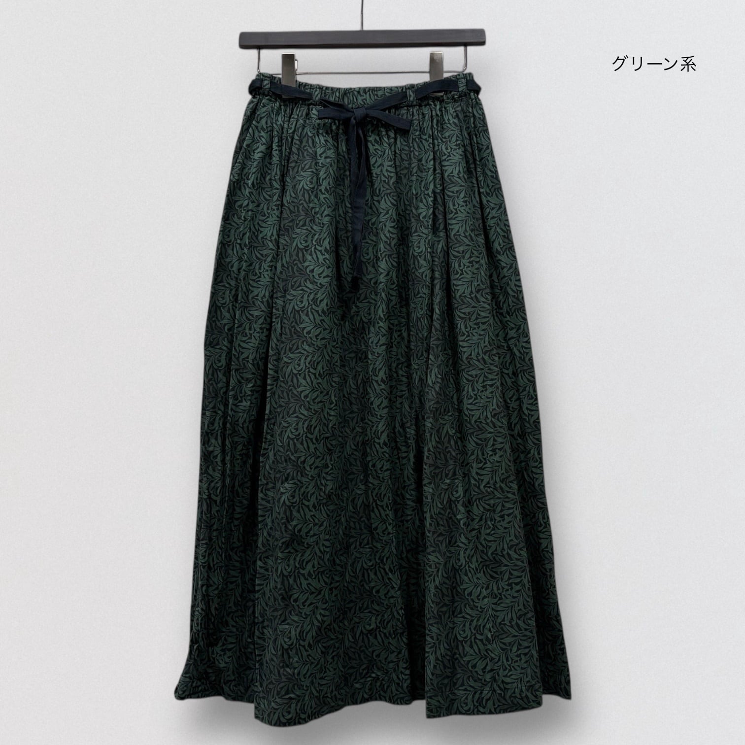 ゴム仕様のウエストにリボンを添え、たっぷりと入れたギャザーが歩くたびに揺れて女性らしいドレープラインに。