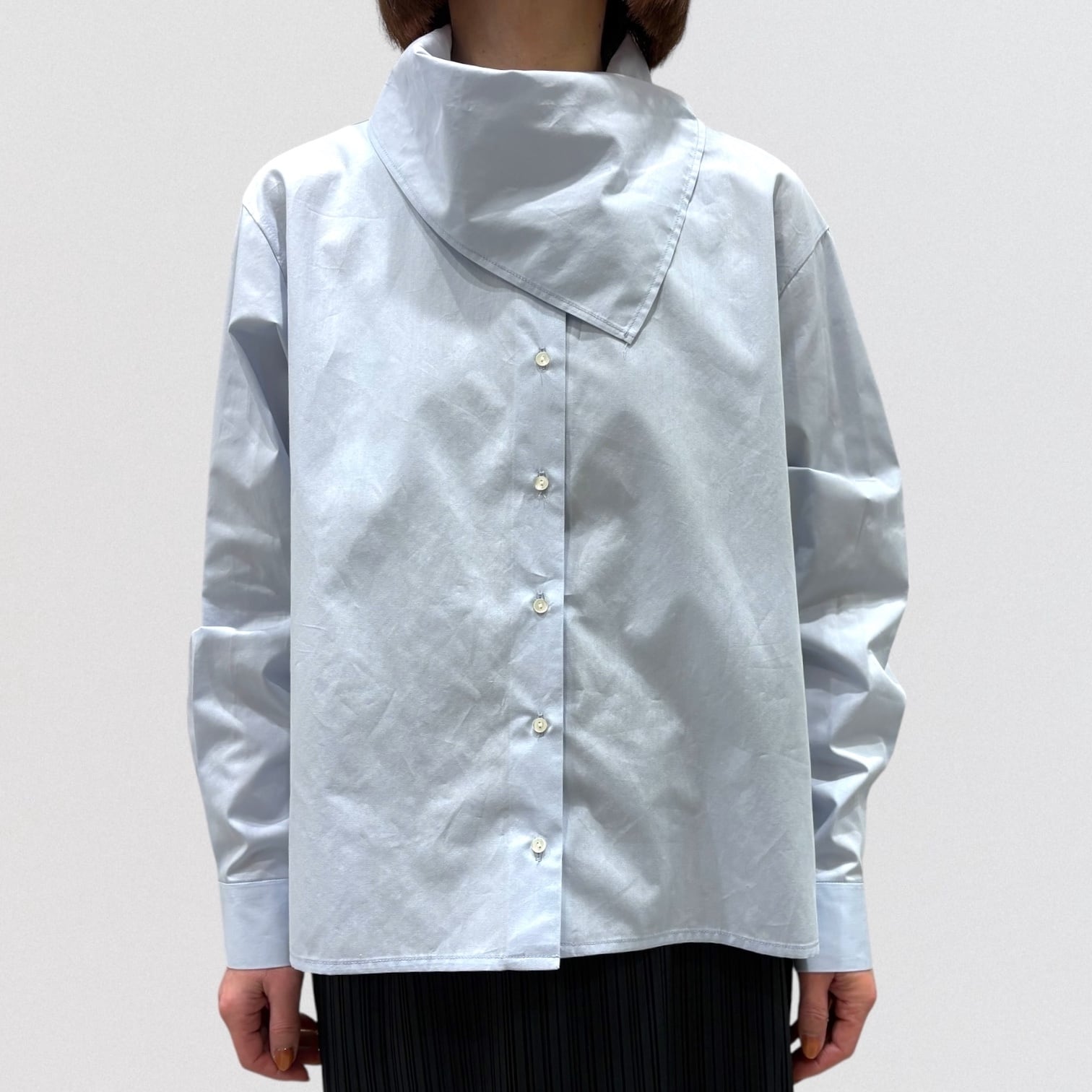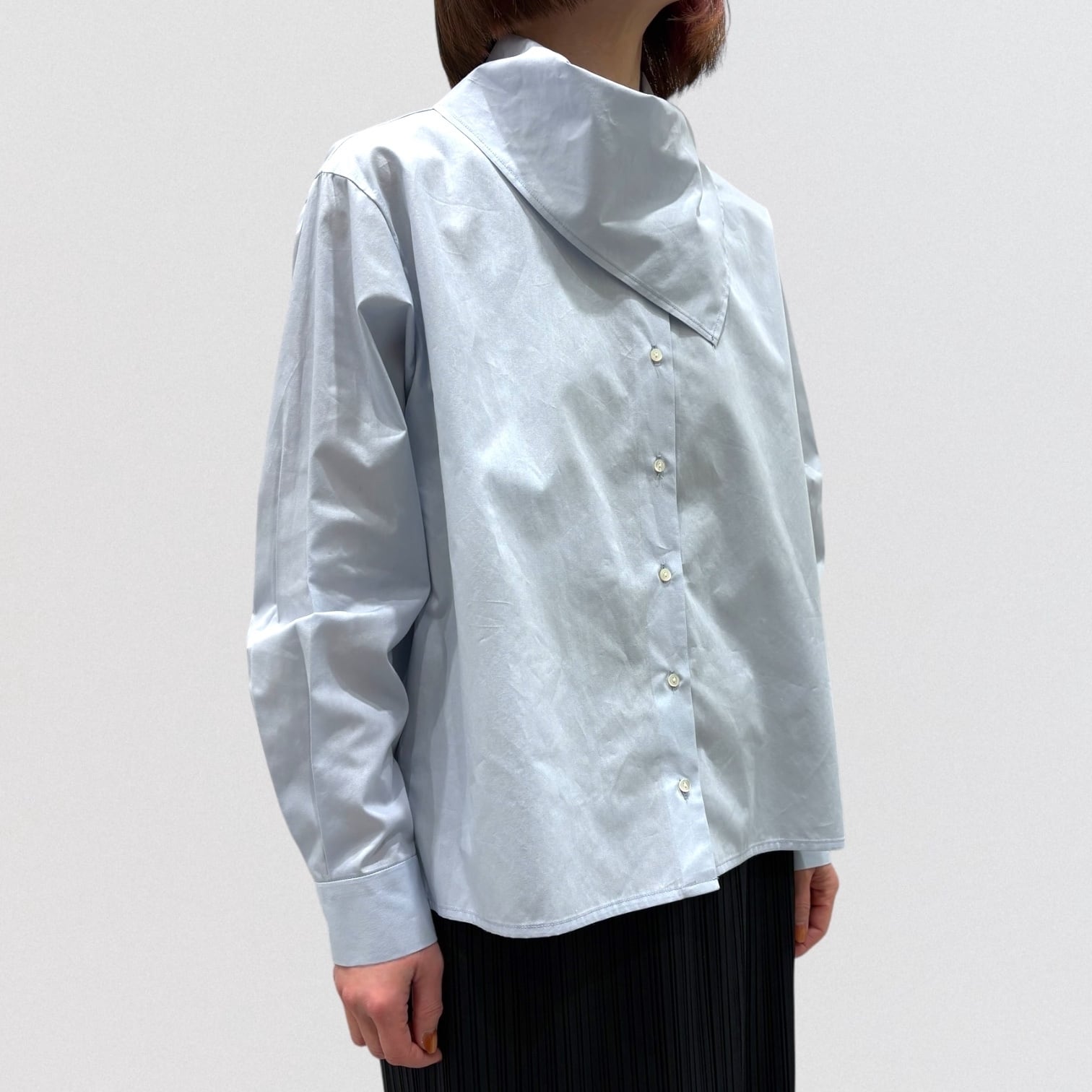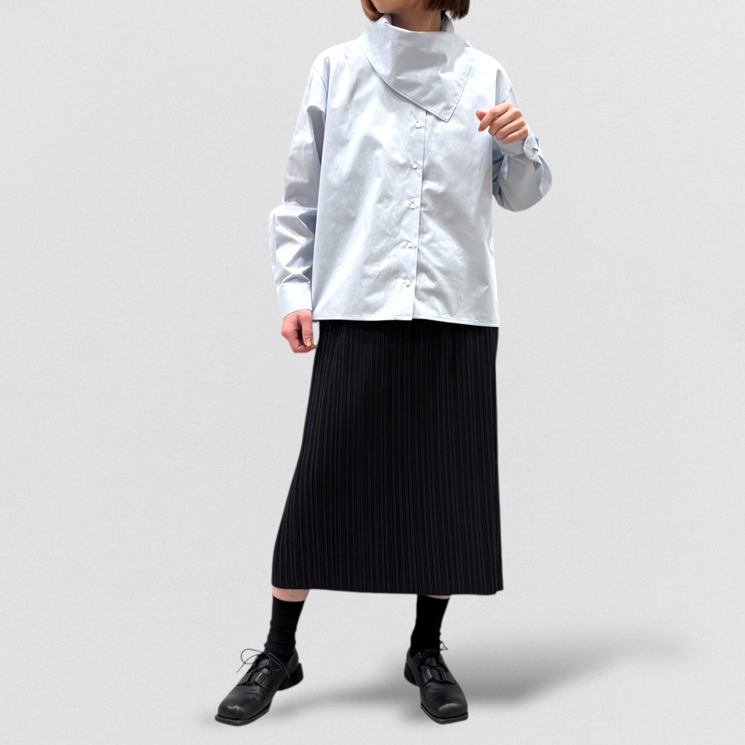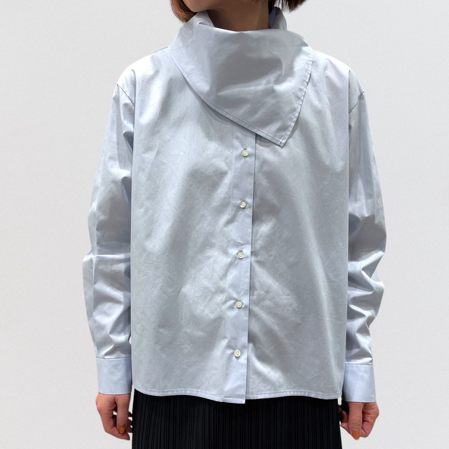 左肩上の小さいボタンで留められる仕様で、首を軽く包んでくれるシャツコーデを演出します。