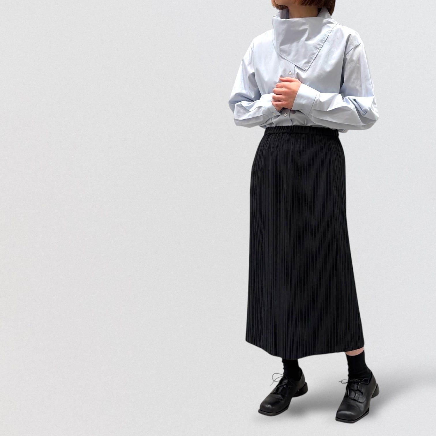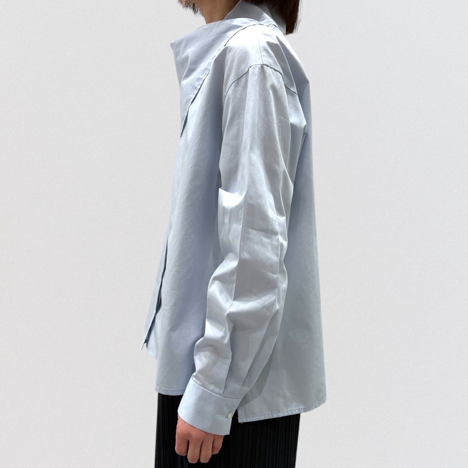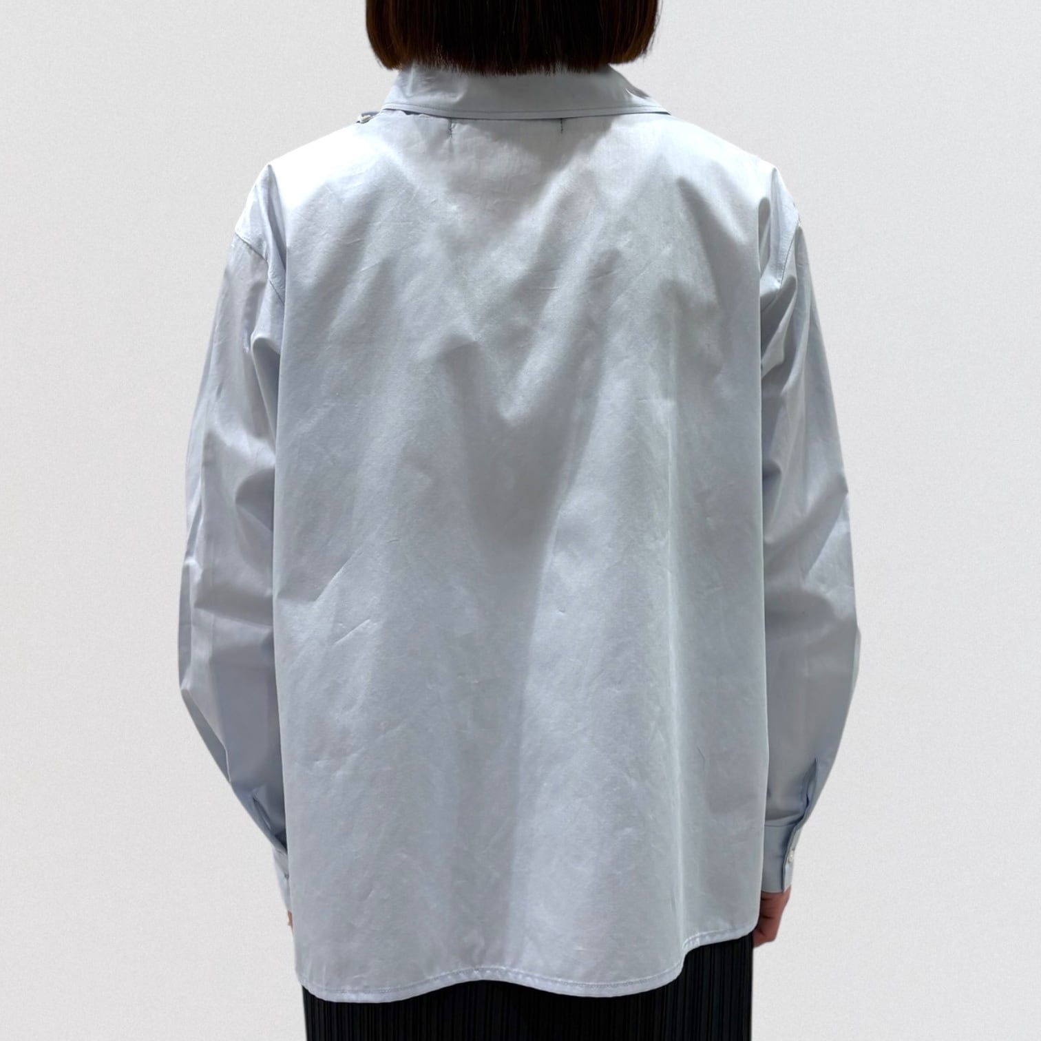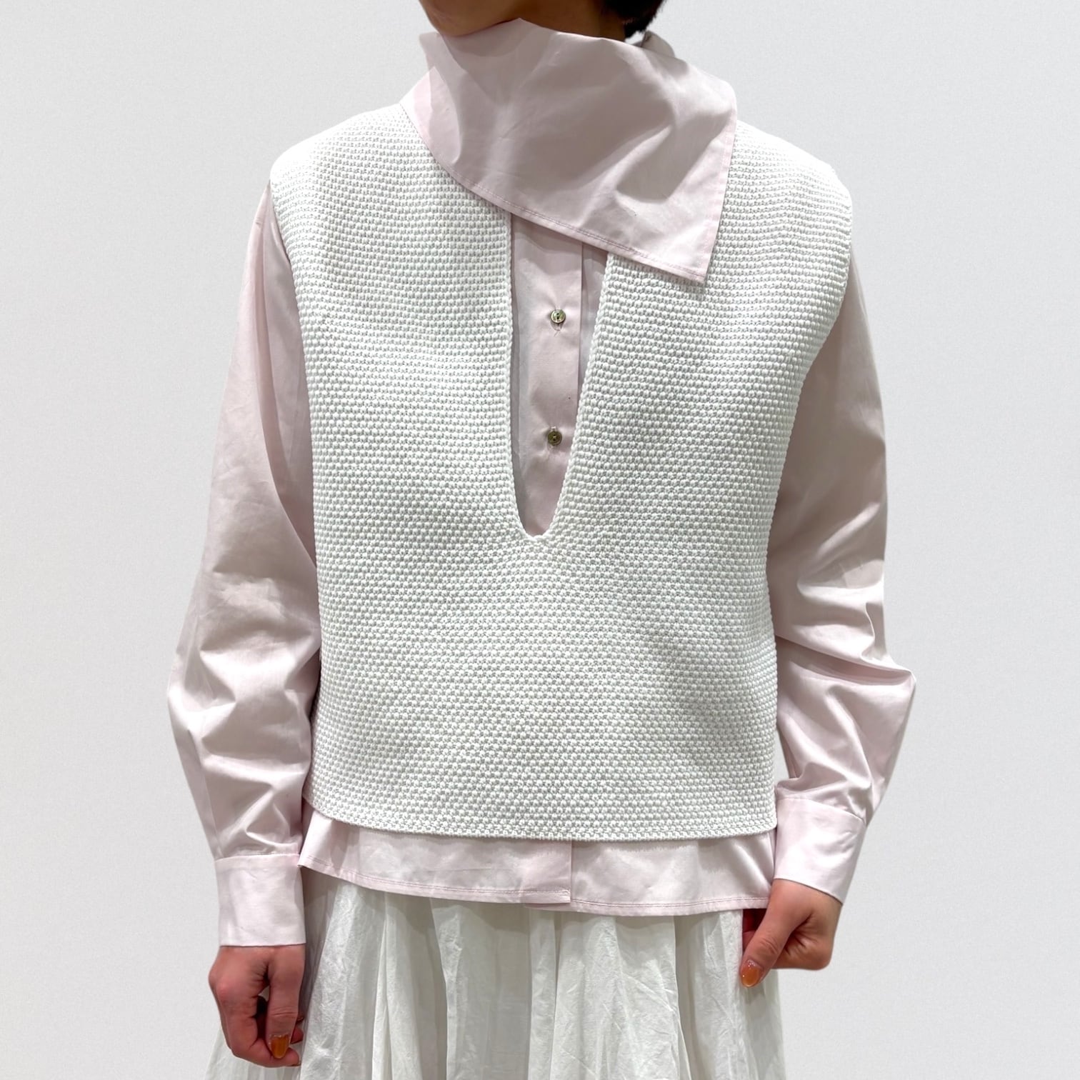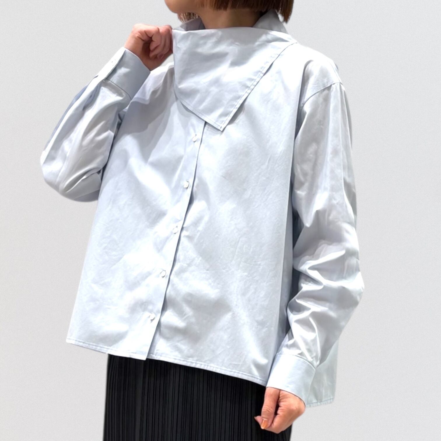 左肩上の小さいボタンで留められる仕様で、首を軽く包んでくれるシャツコーデを演出します。