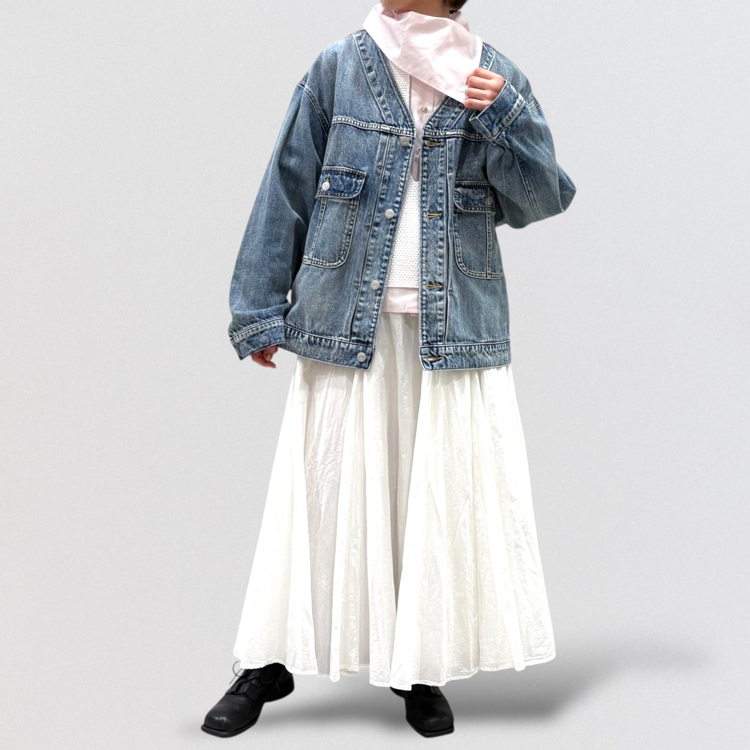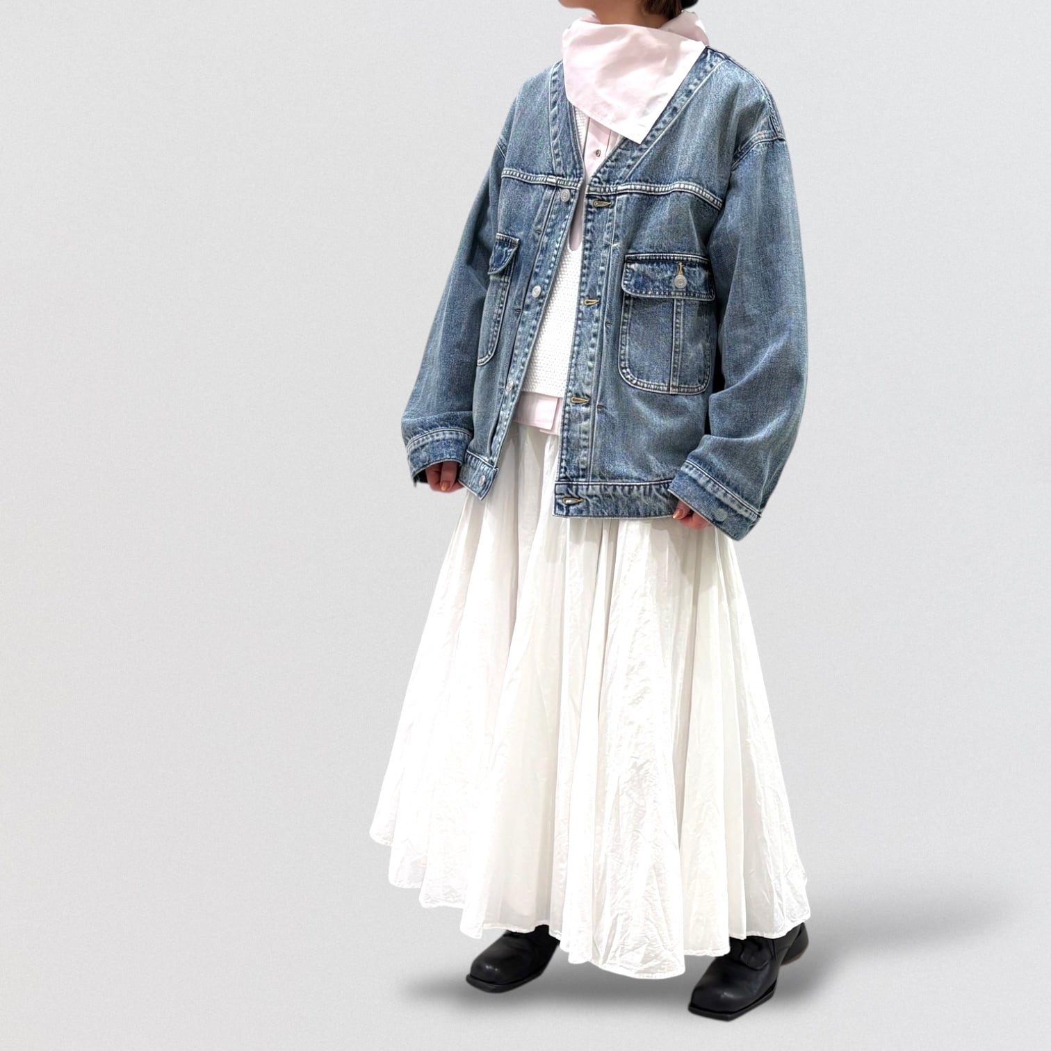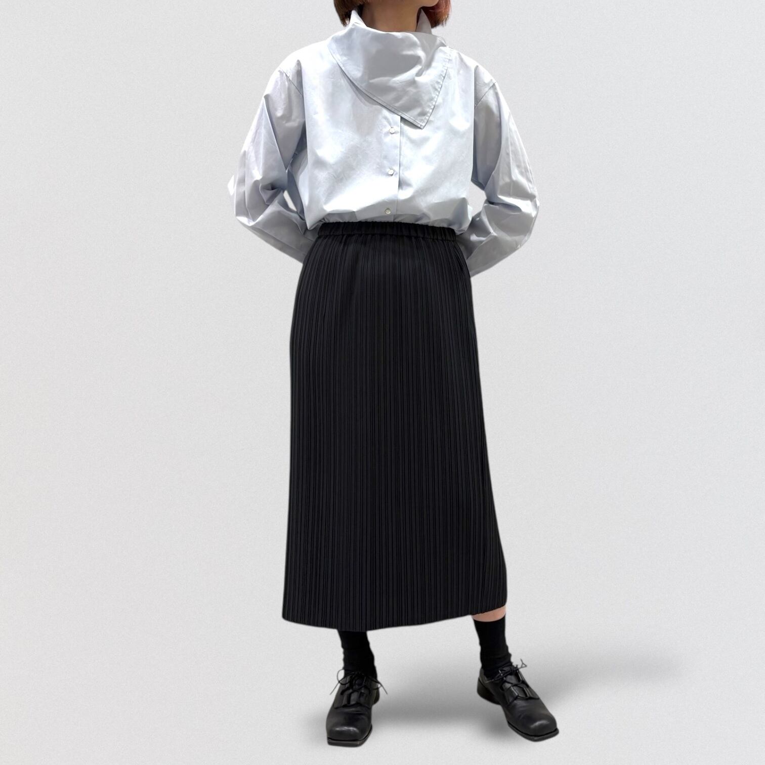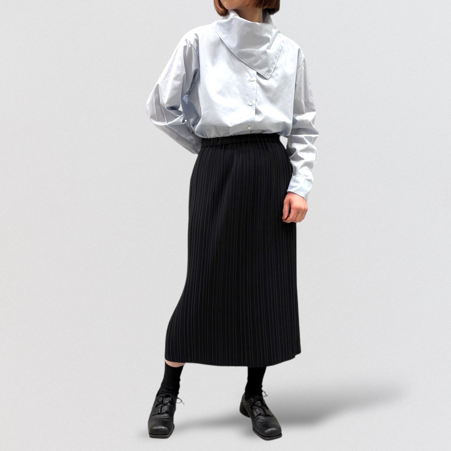 左肩上の小さいボタンで留められる仕様で、首を軽く包んでくれるシャツコーデを演出します。