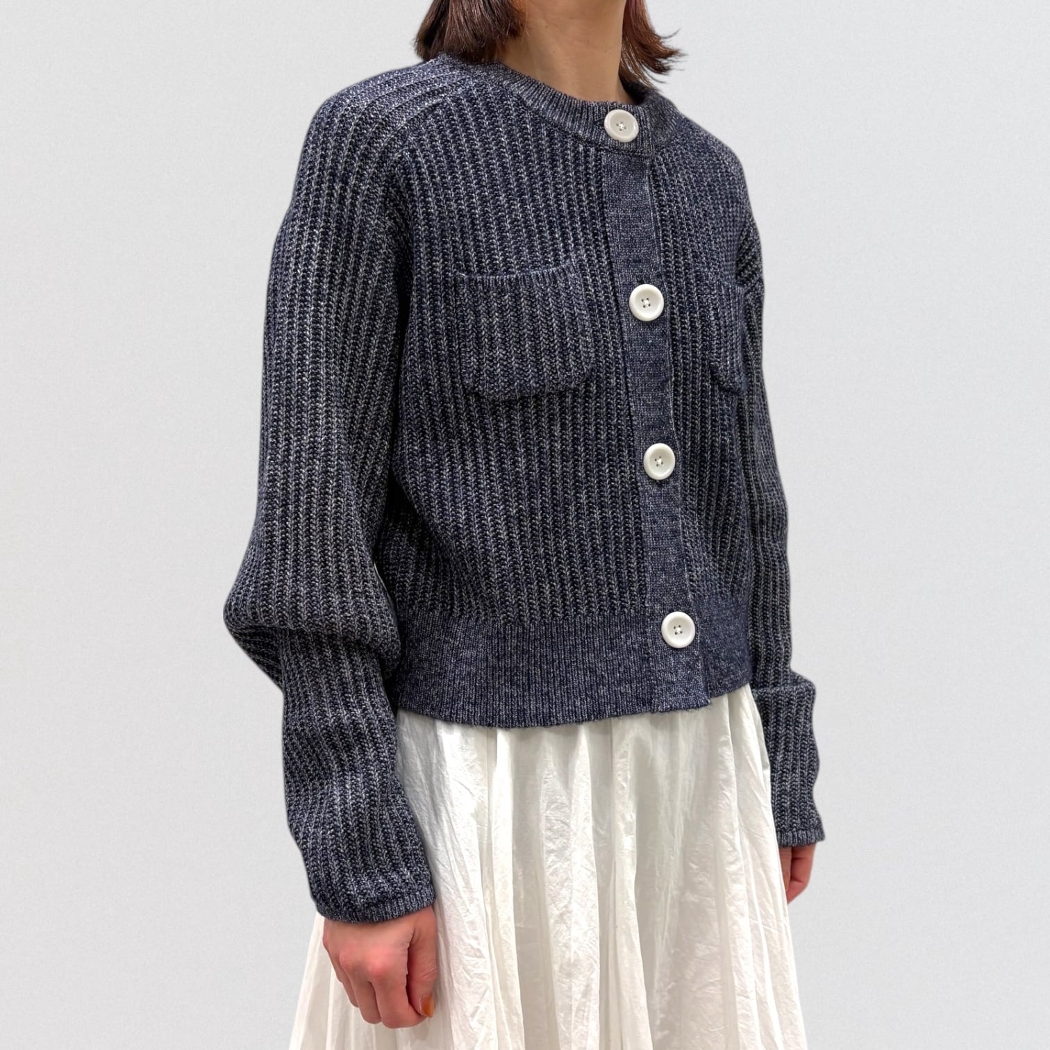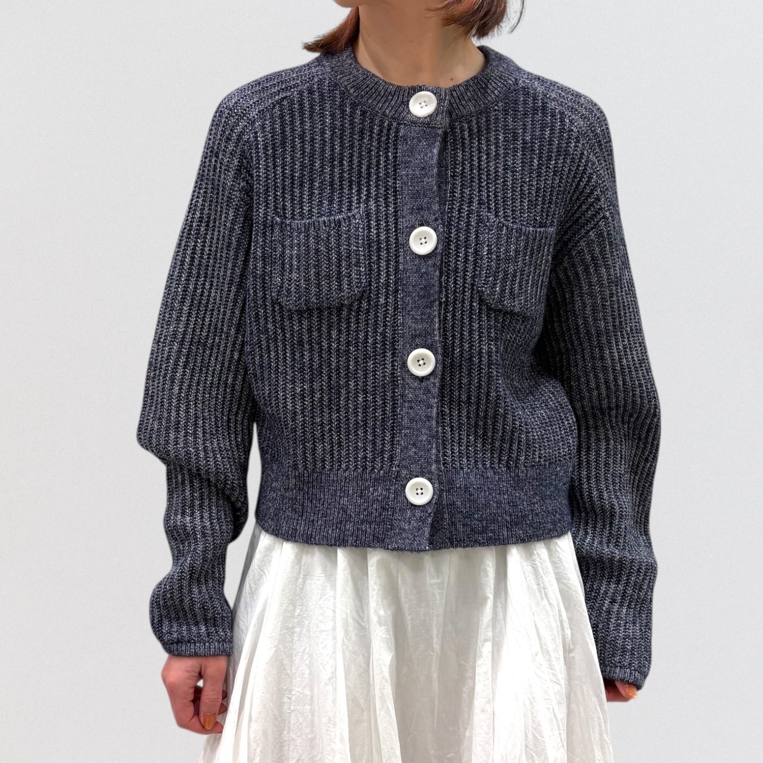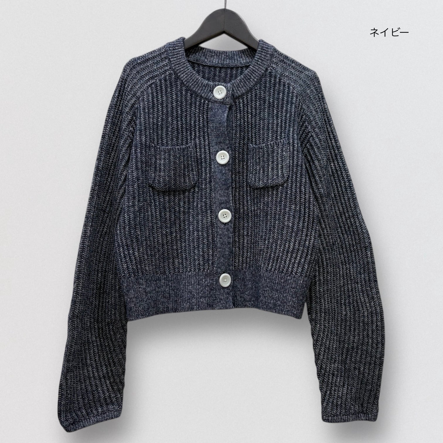 リブニットのショート丈カーディガンです。
