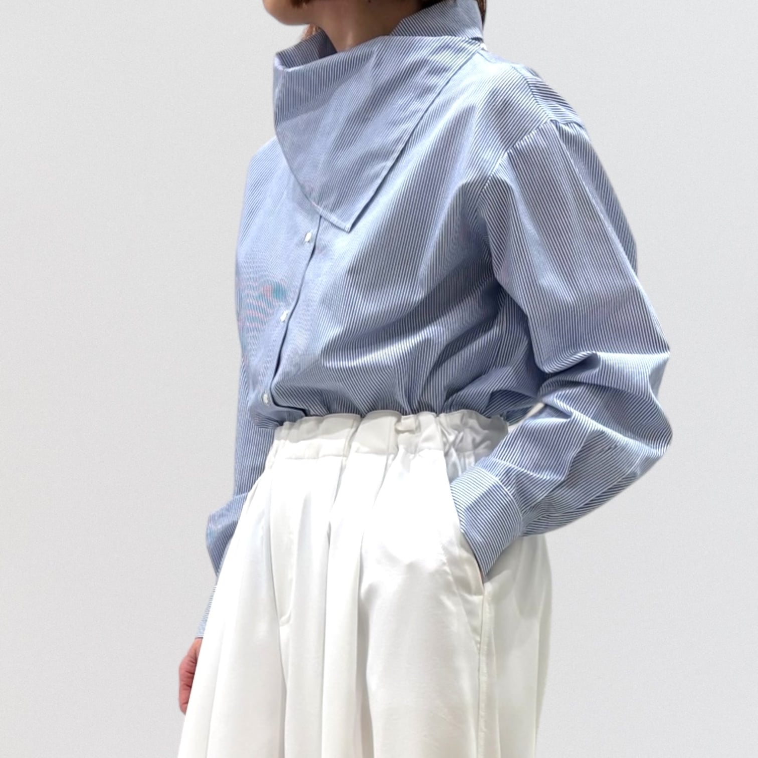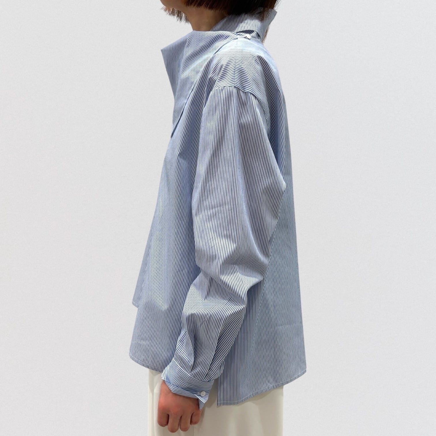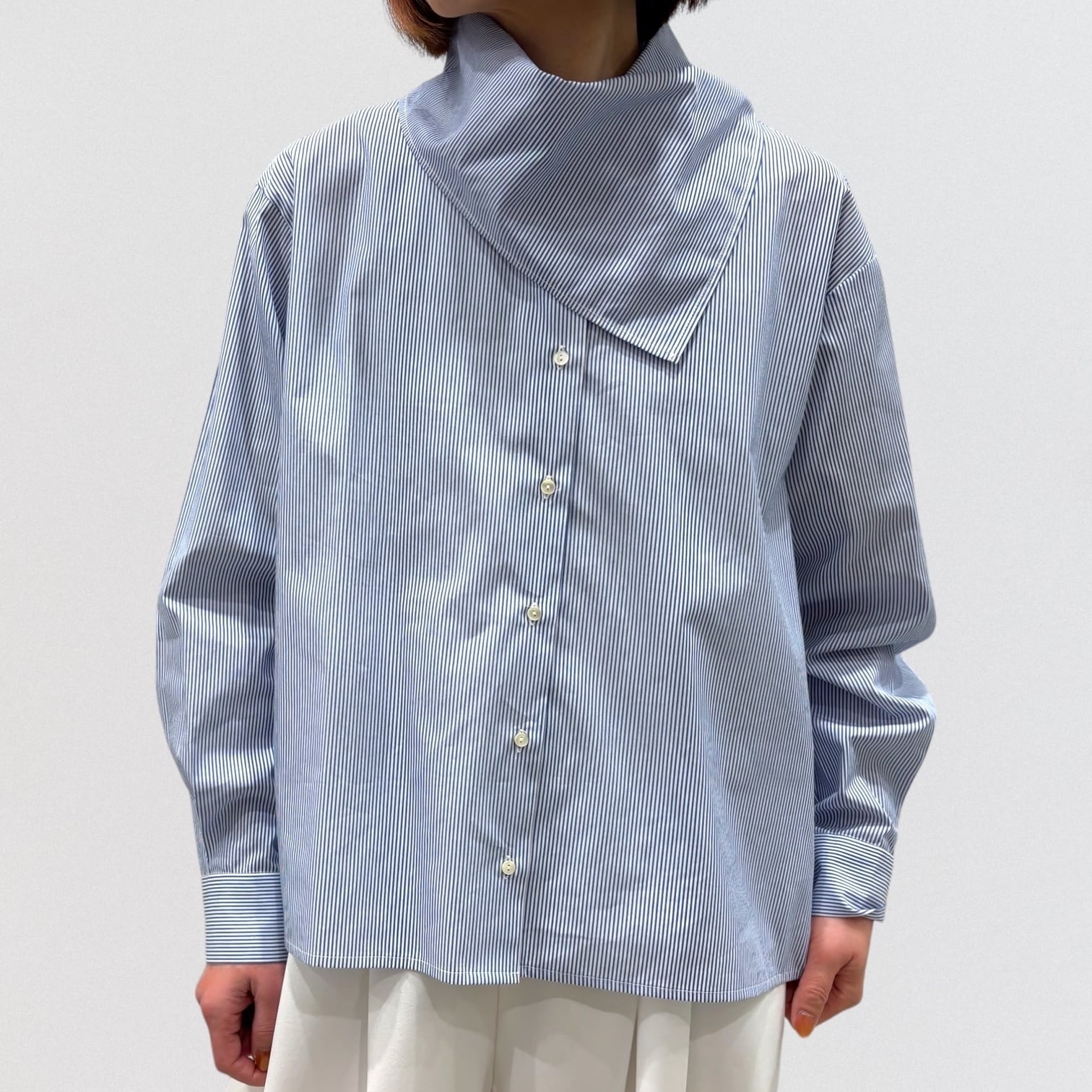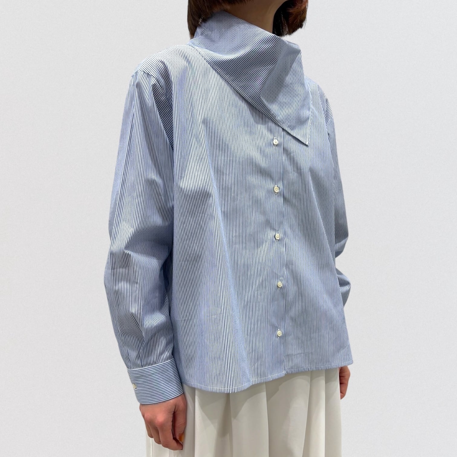 左肩上の小さいボタンで留められる仕様で、首を軽く包んでくれるシャツコーデを演出します。