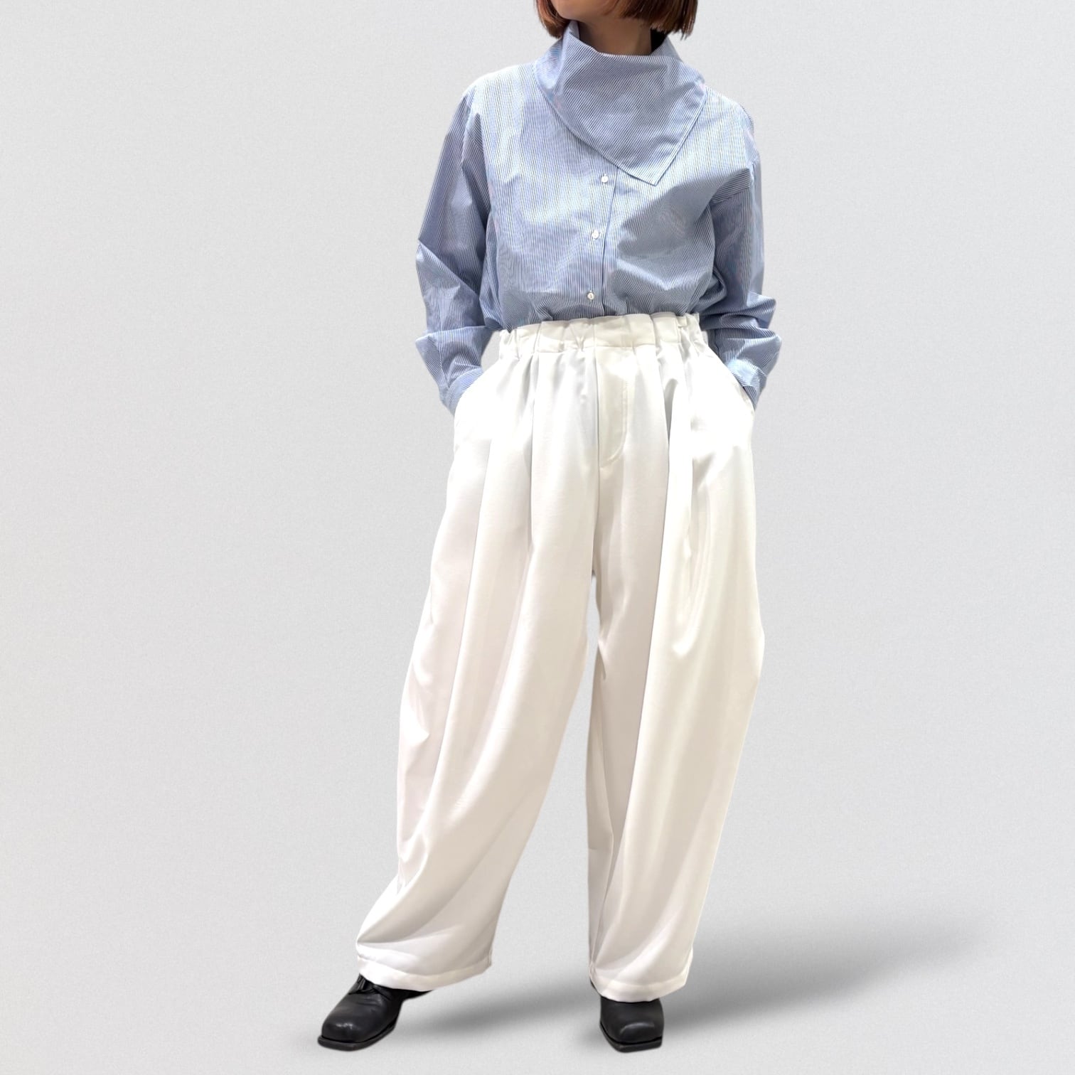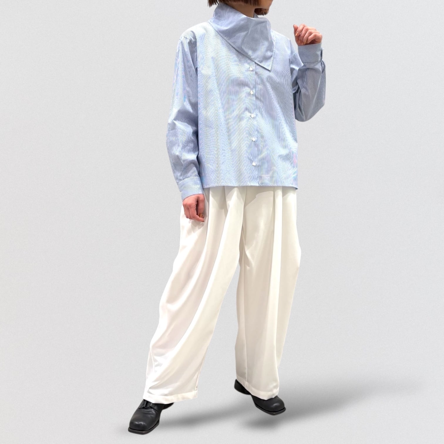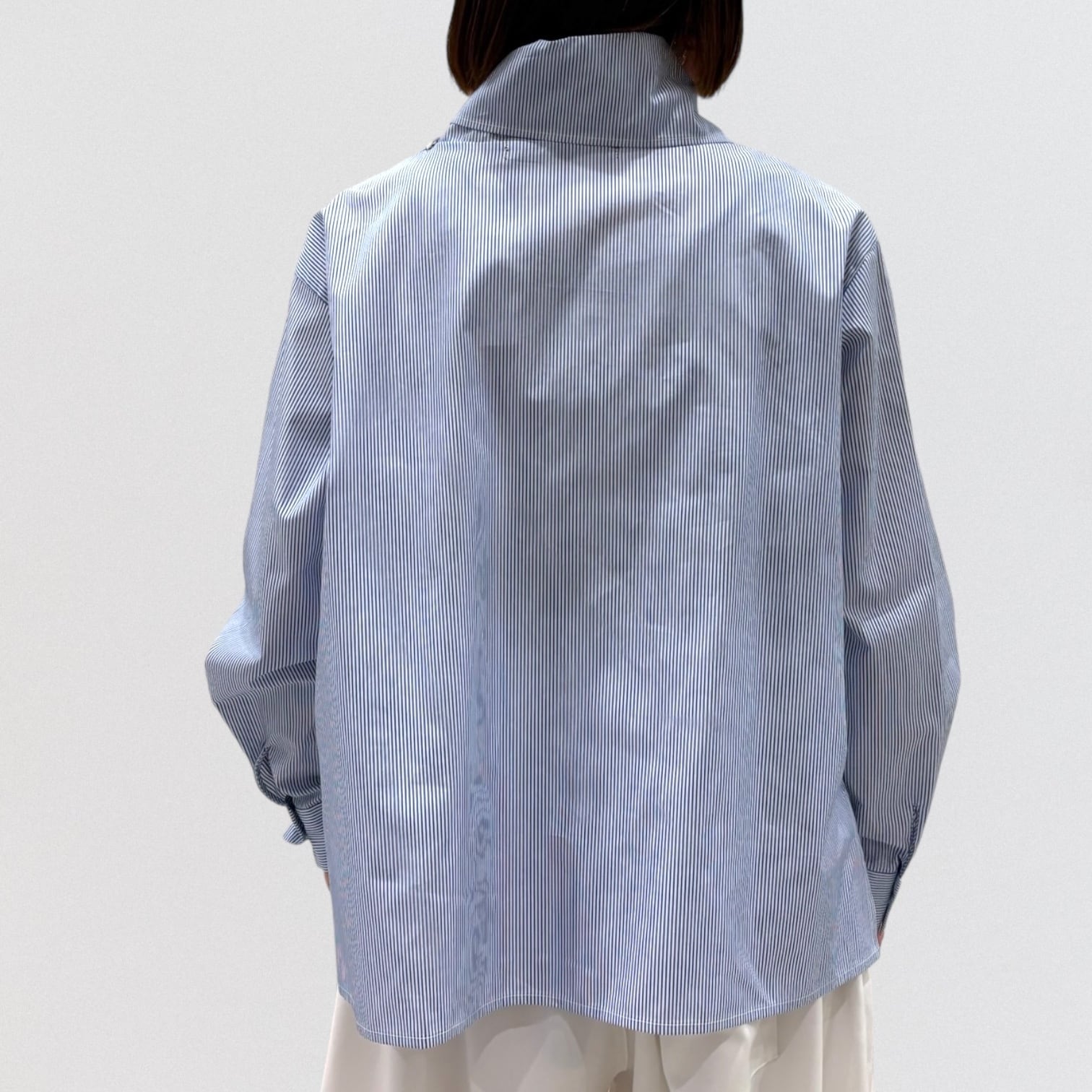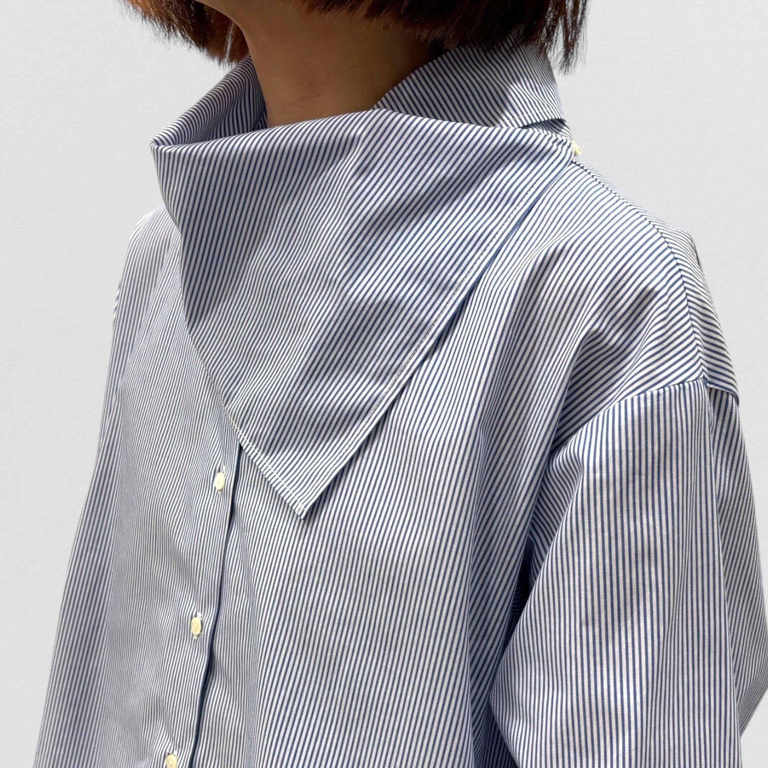 左肩上の小さいボタンで留められる仕様で、首を軽く包んでくれるシャツコーデを演出します。