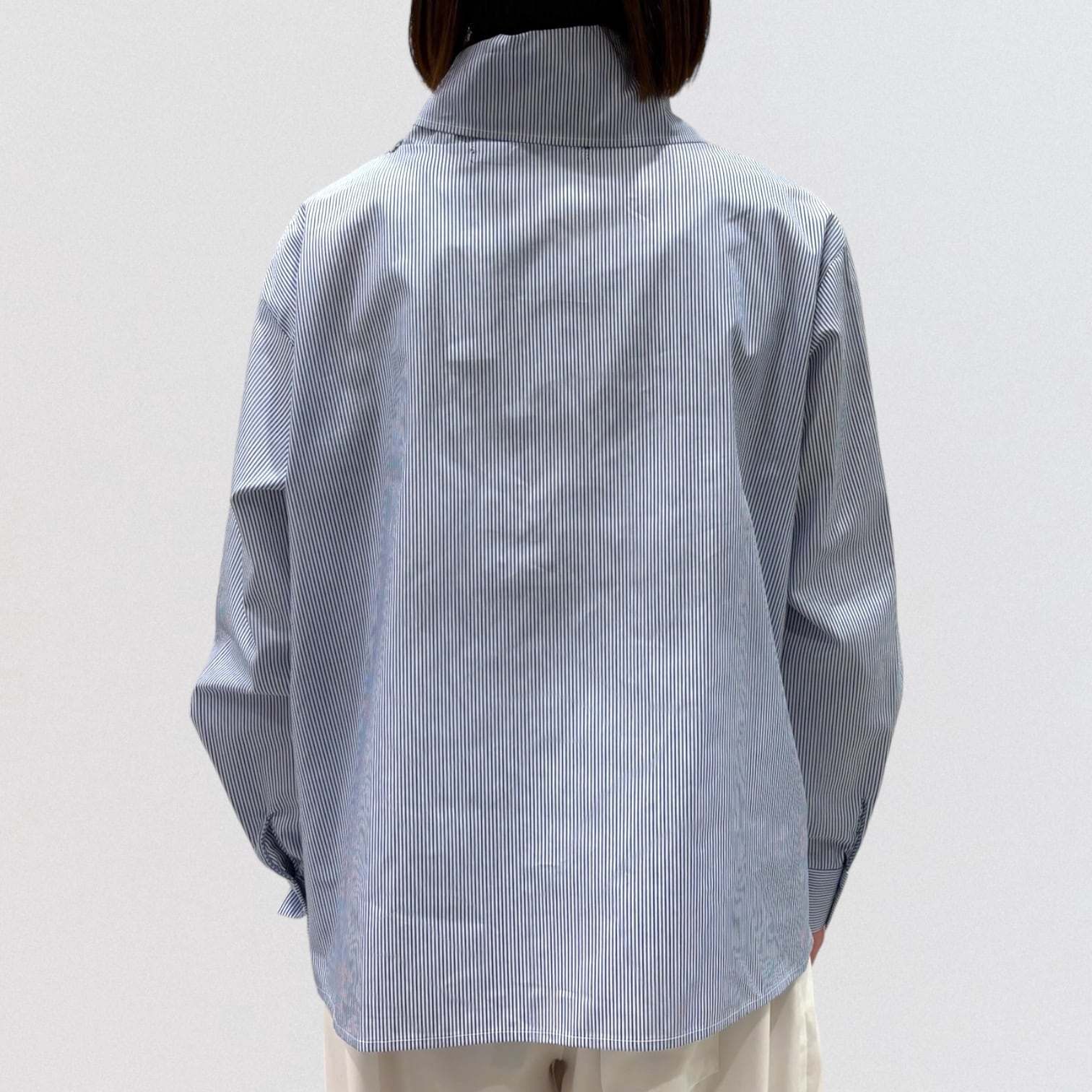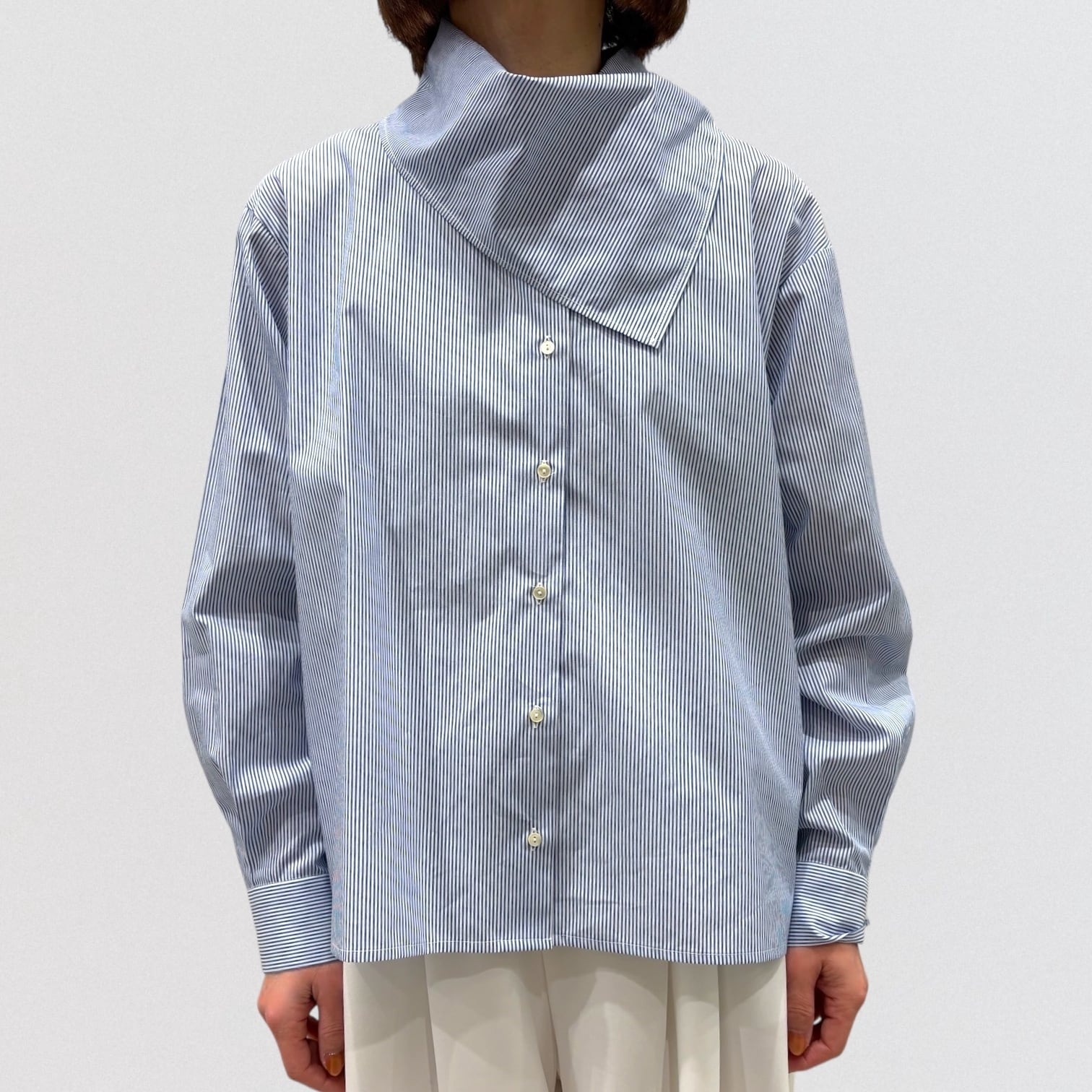 襟にドッキングしたスカーフが特徴のストライプスカーフカラーシャツです。