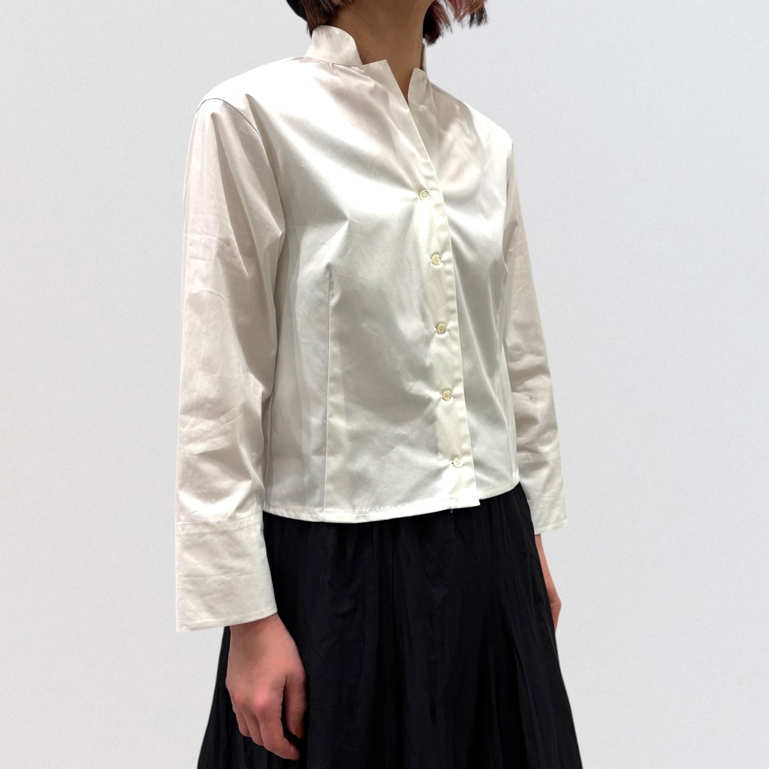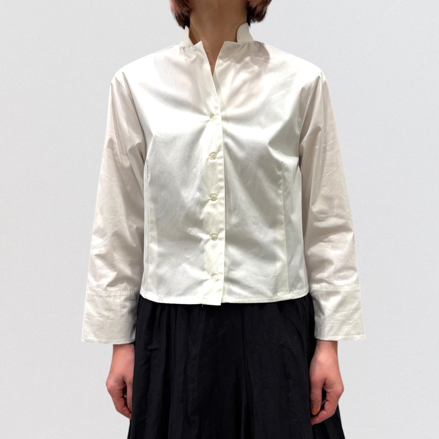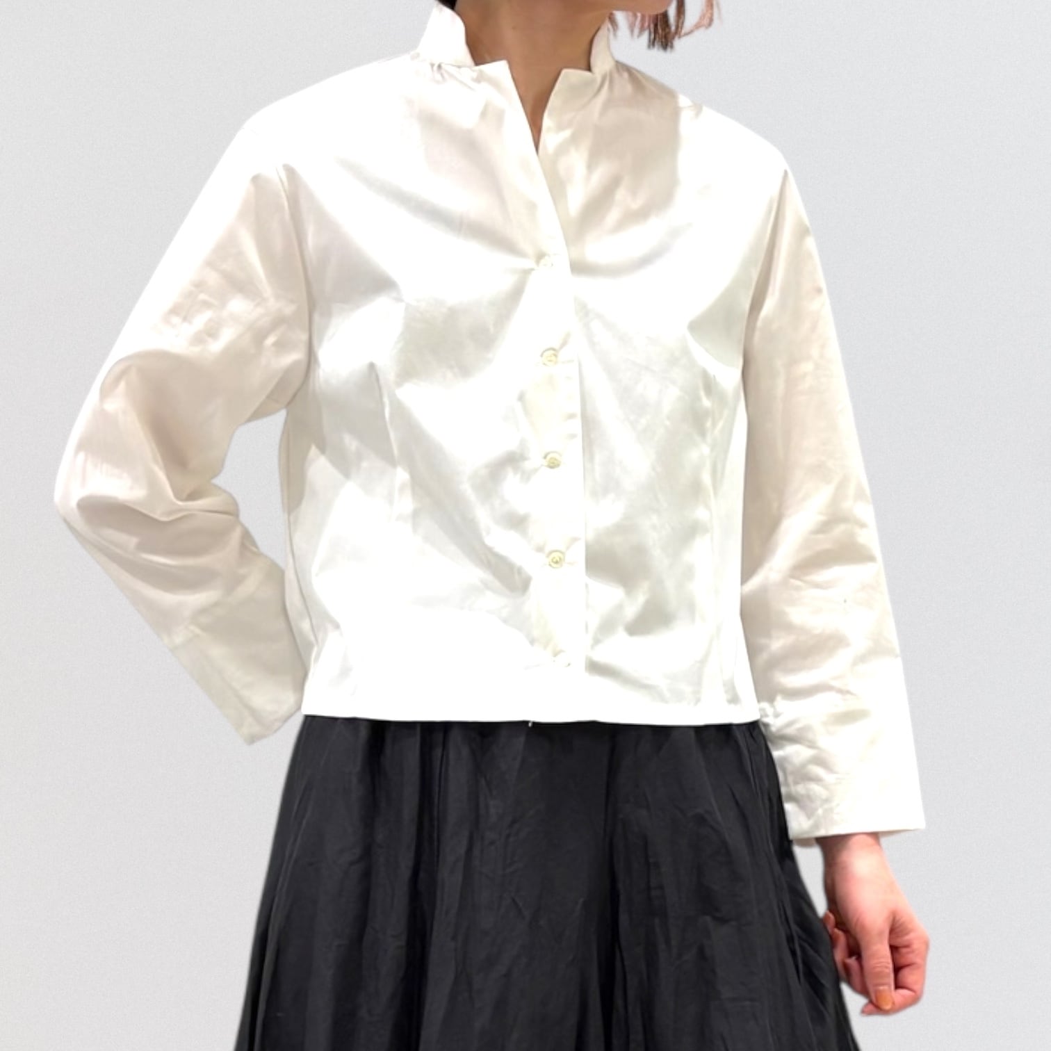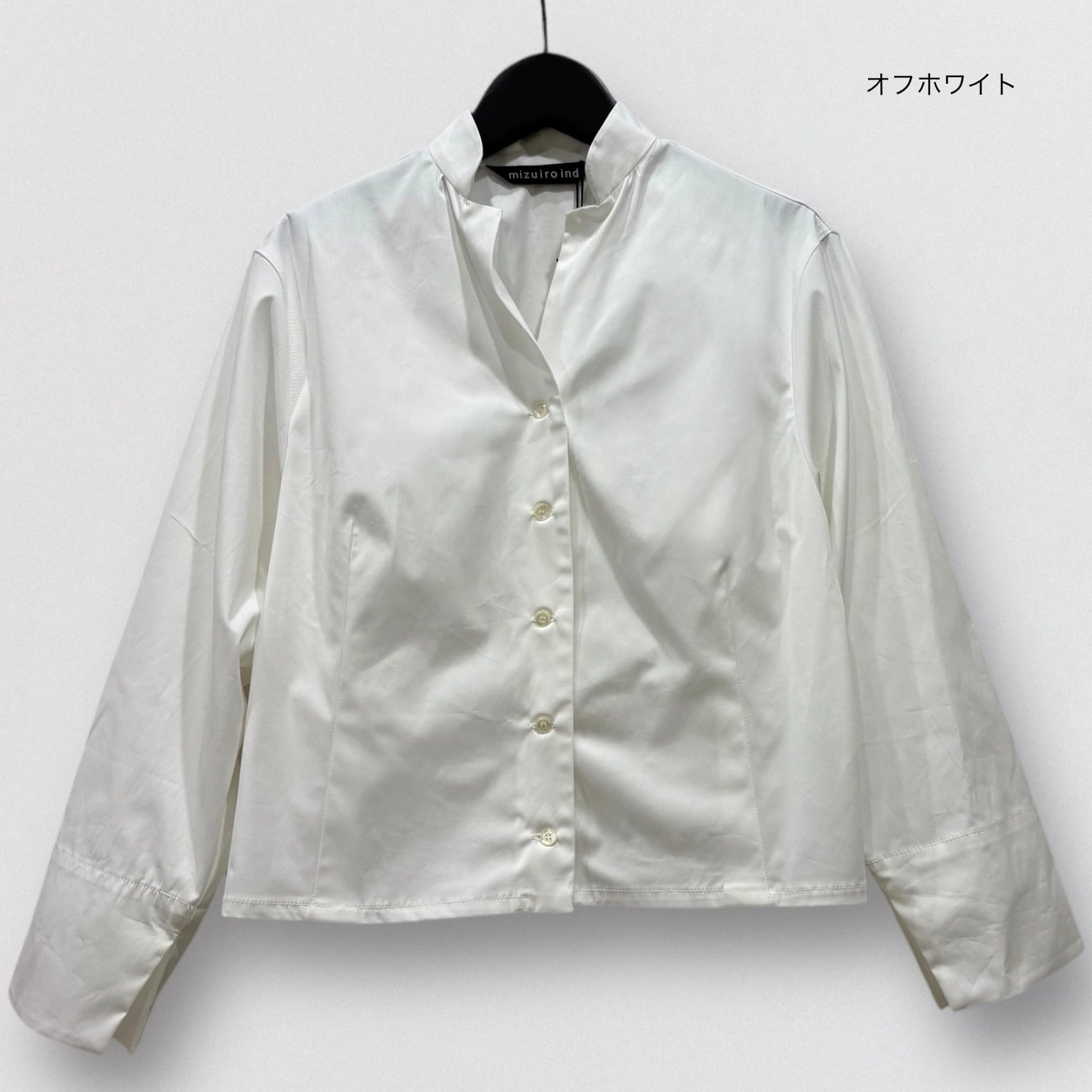 シンプルで上品な着こなしを演出するスタンドカラーショートシャツです。