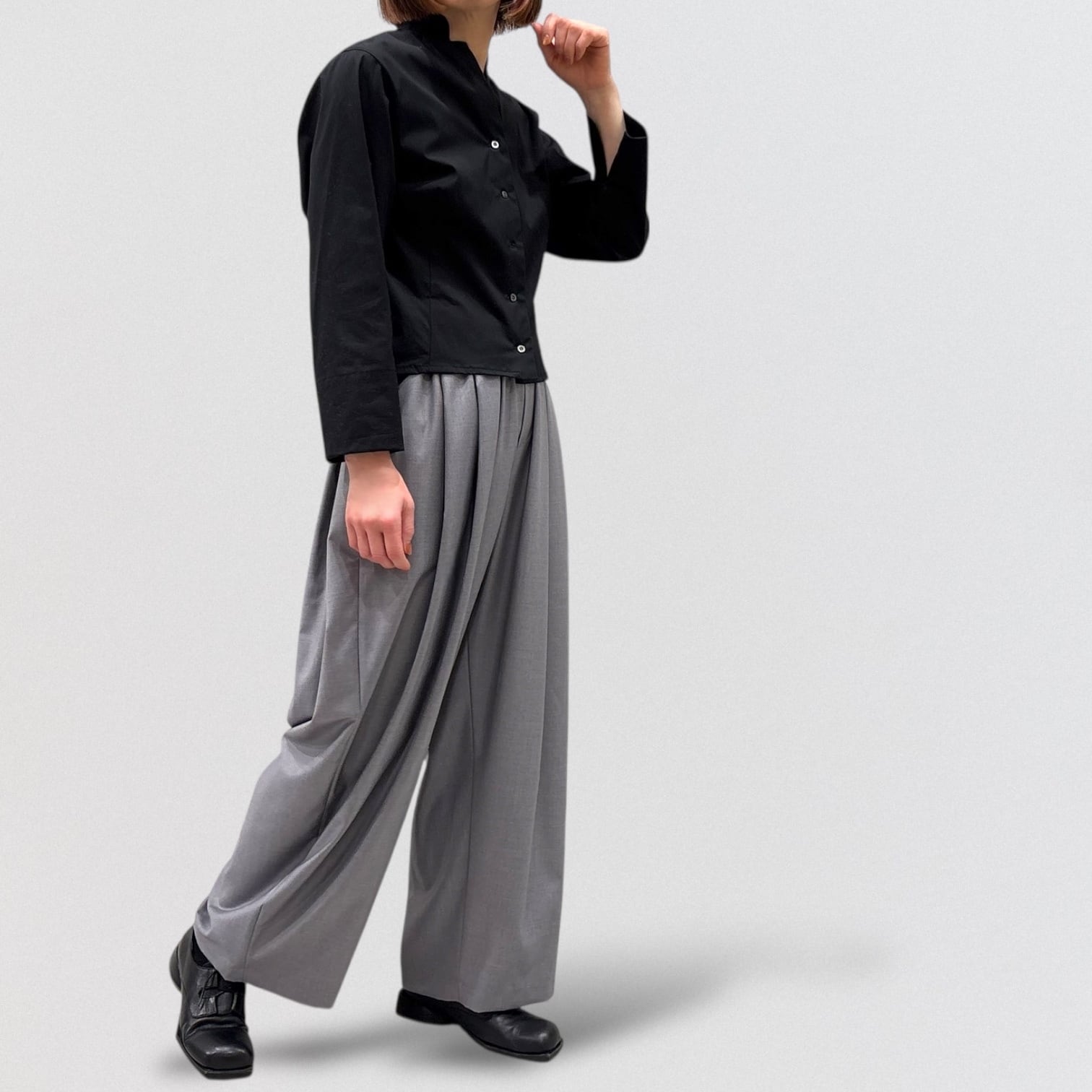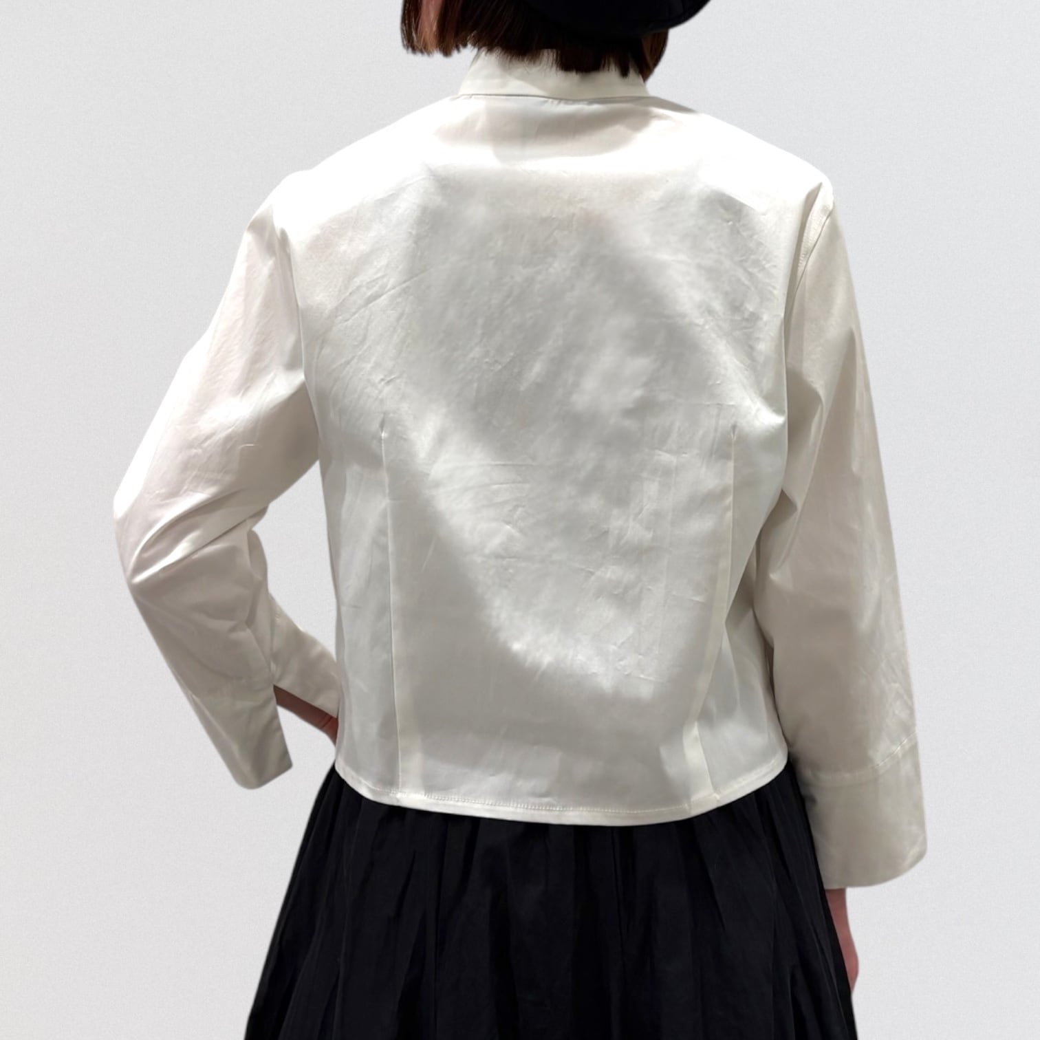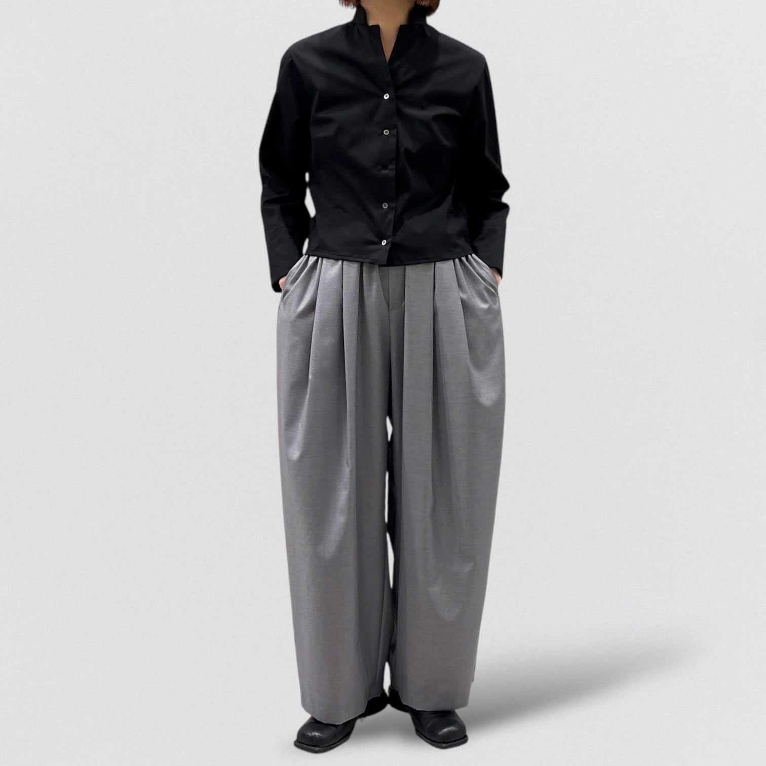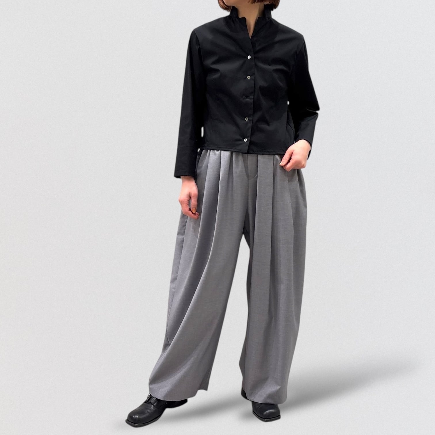 シンプルで上品な着こなしを演出するスタンドカラーショートシャツです。