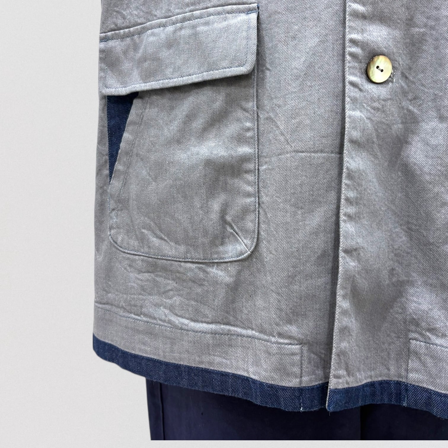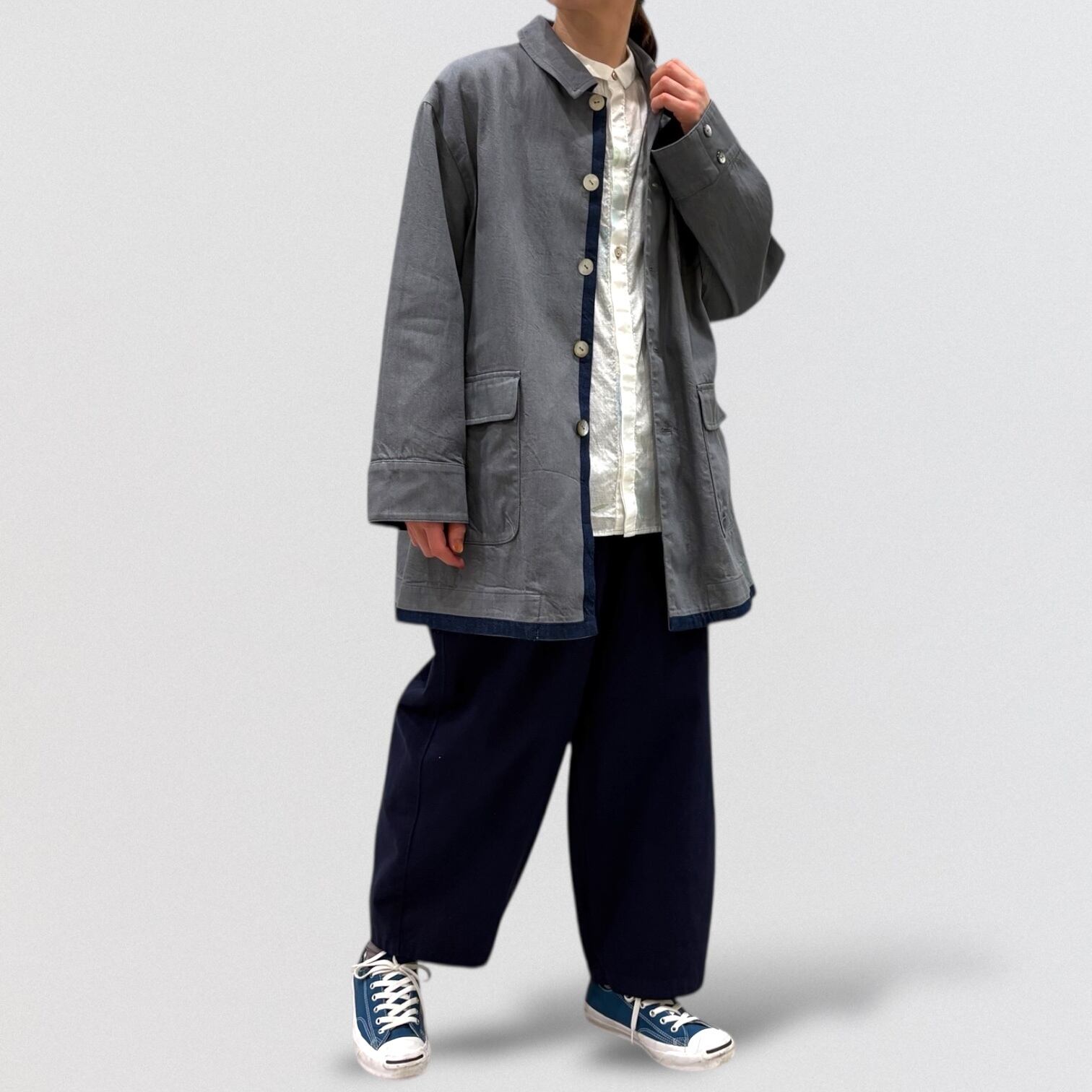 トリミングに使ったバイカラー配色がポケットやヘムラインに利いており、前を開けると右前にもアクセントになっています。