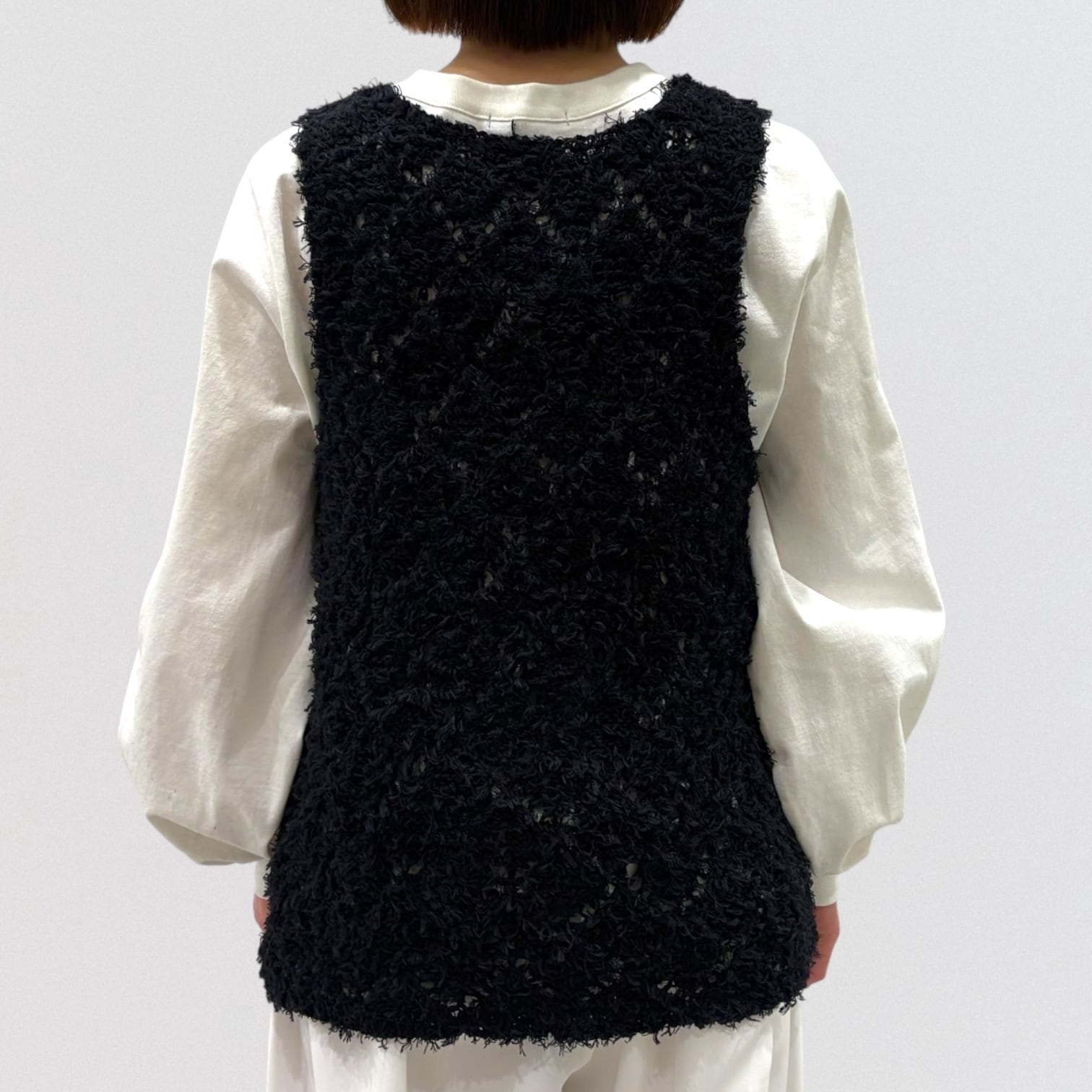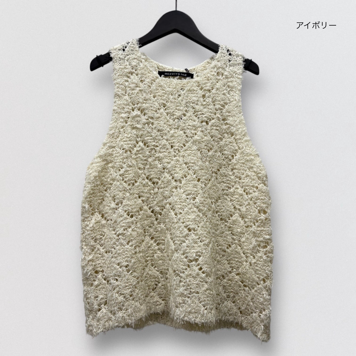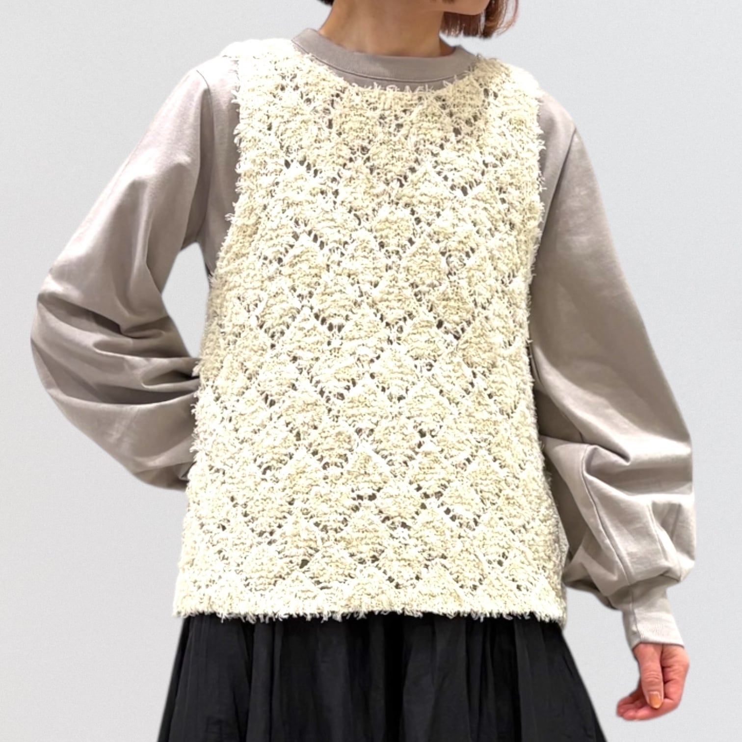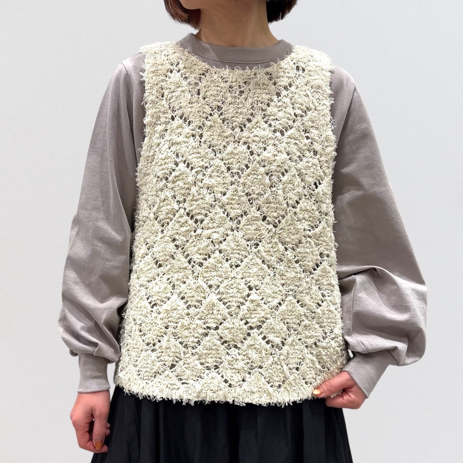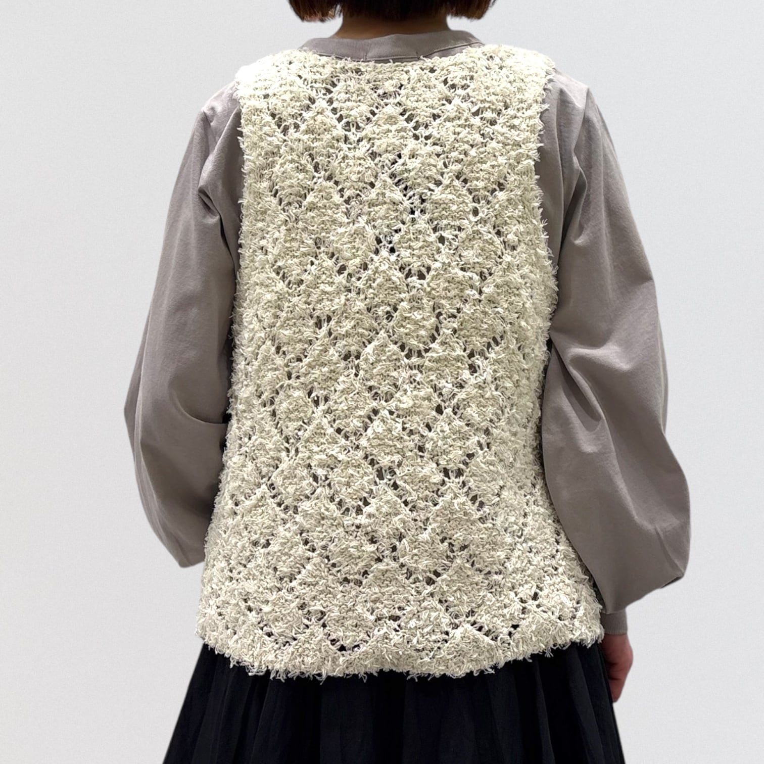 フリンジがついたテープヤーンをダイヤ柄で編んだパターンベストです。