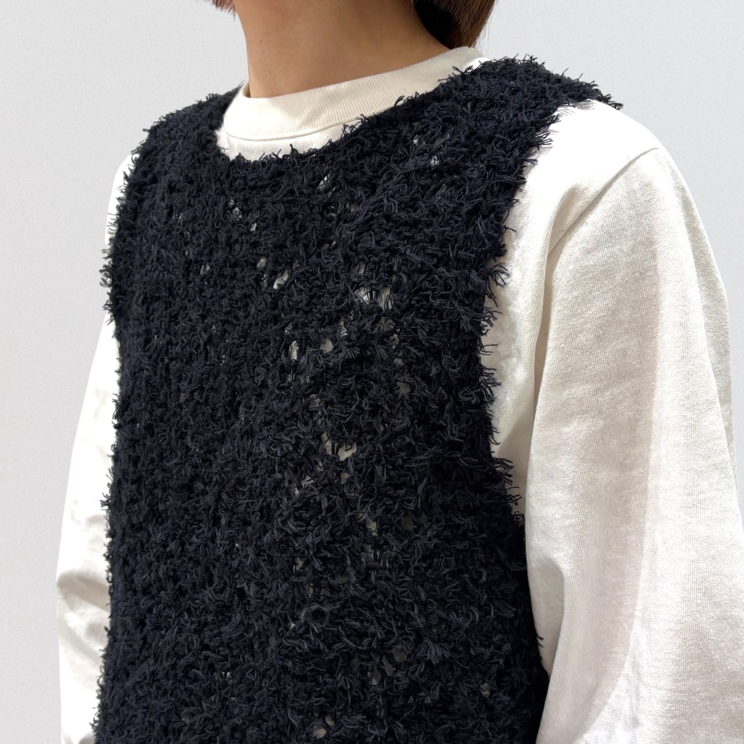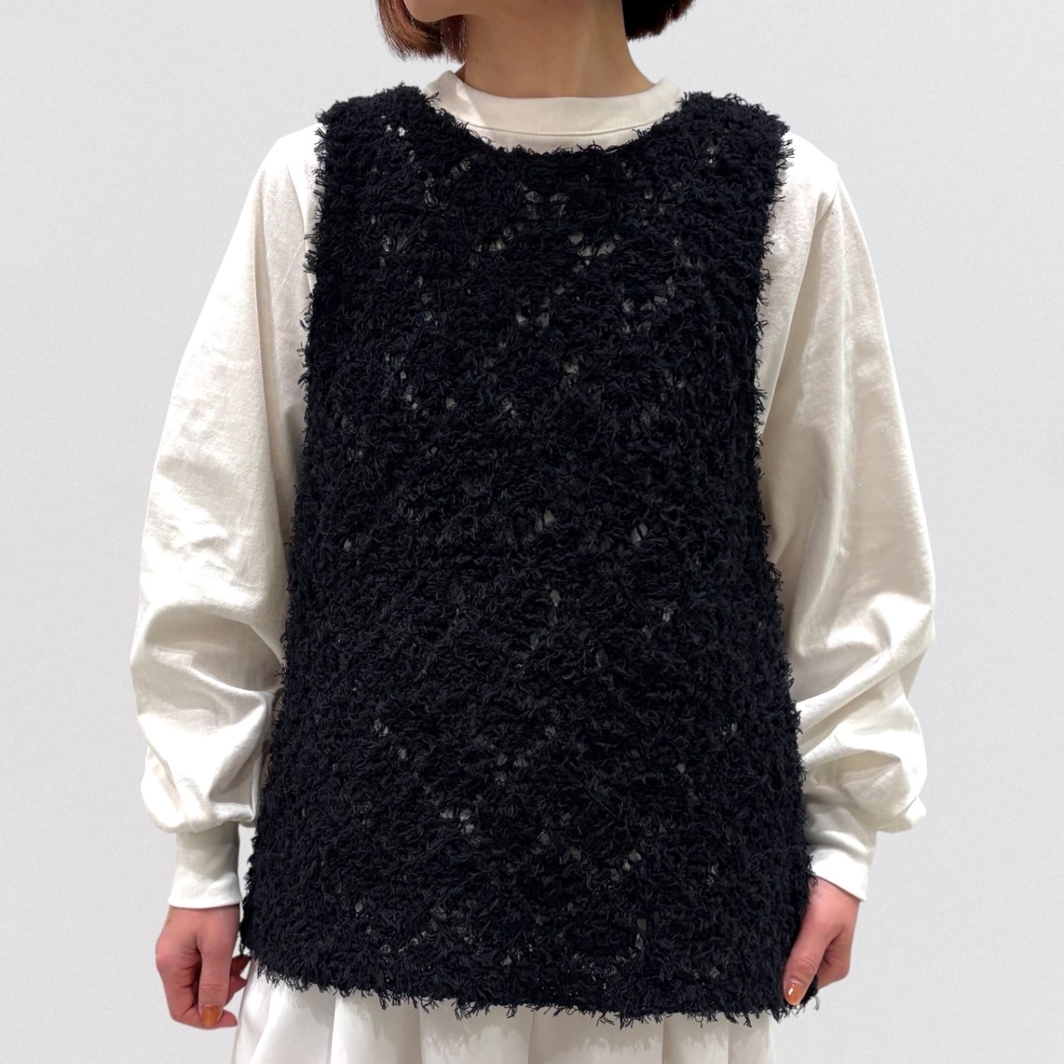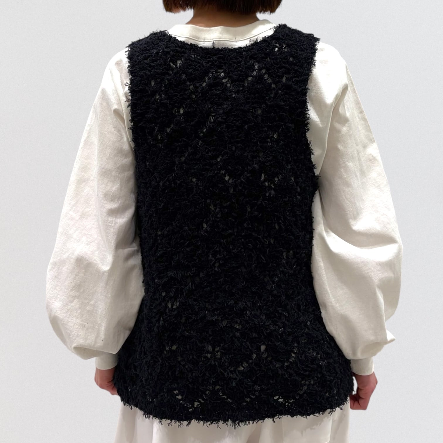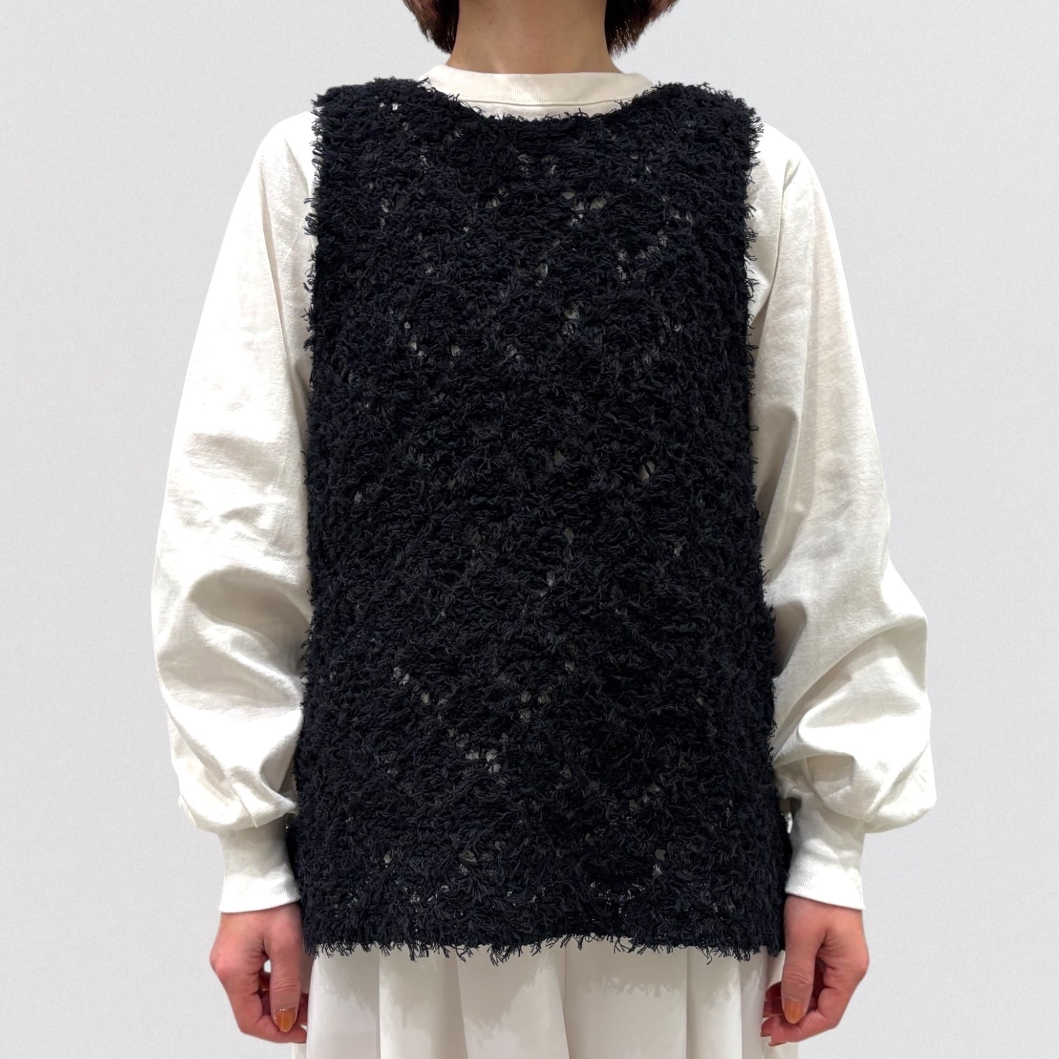 フリンジがついたテープヤーンをダイヤ柄で編んだパターンベストです。