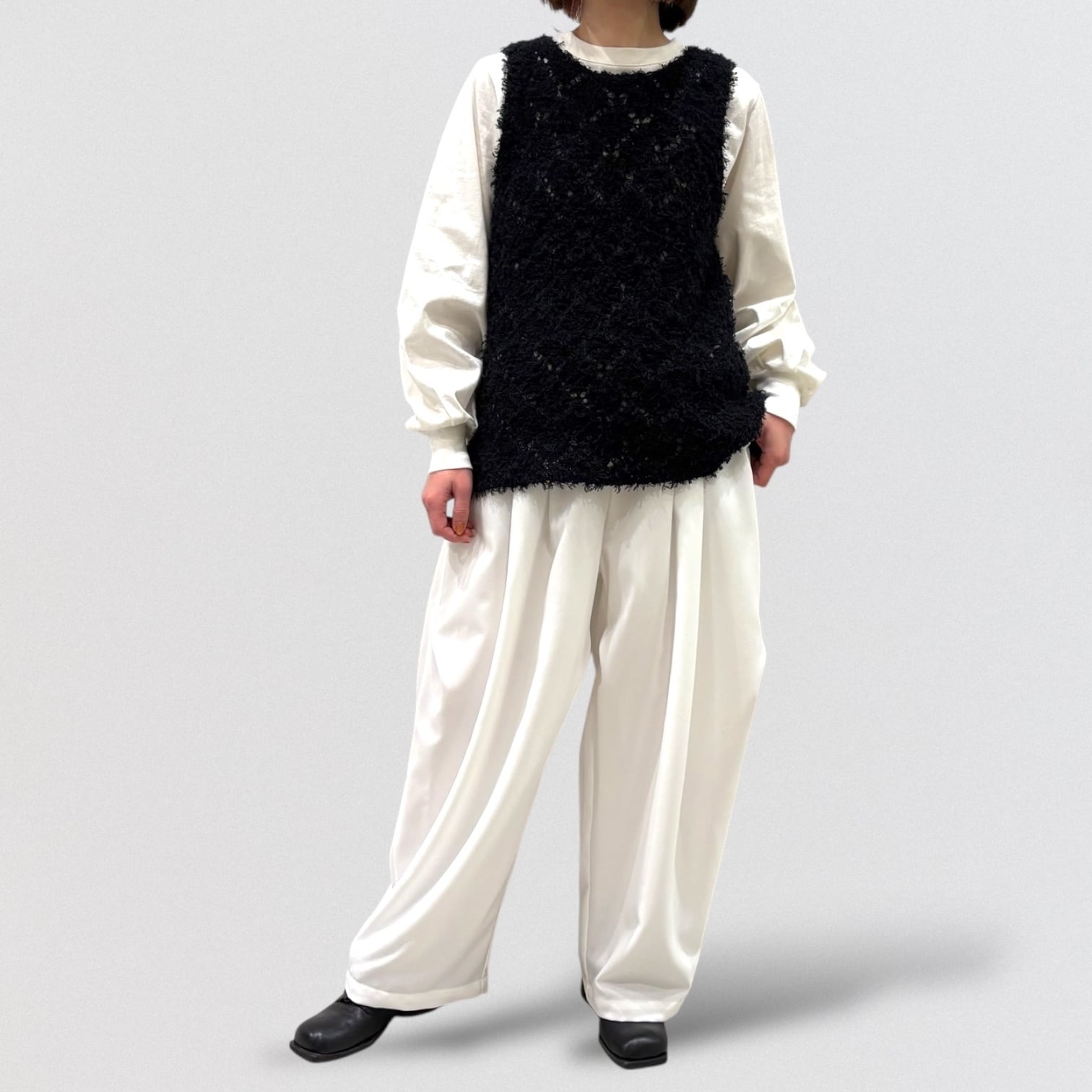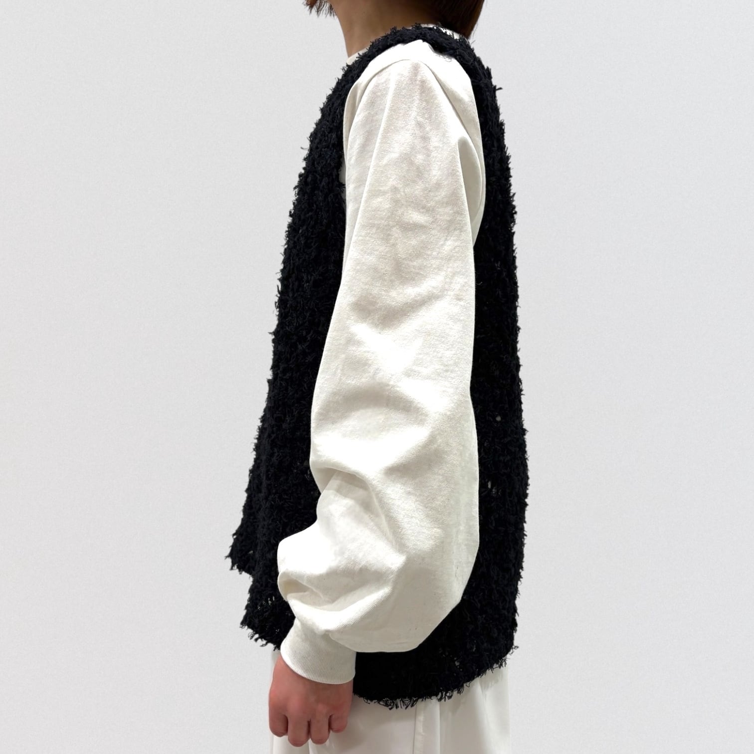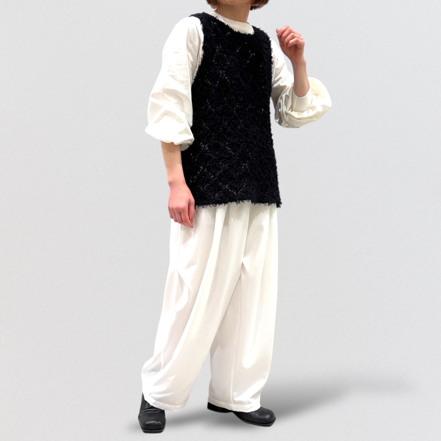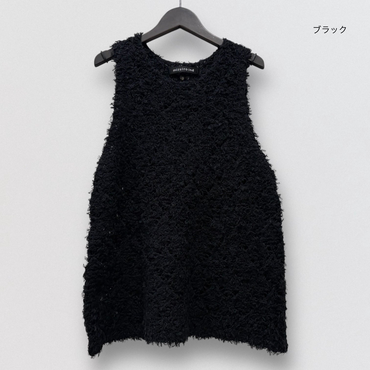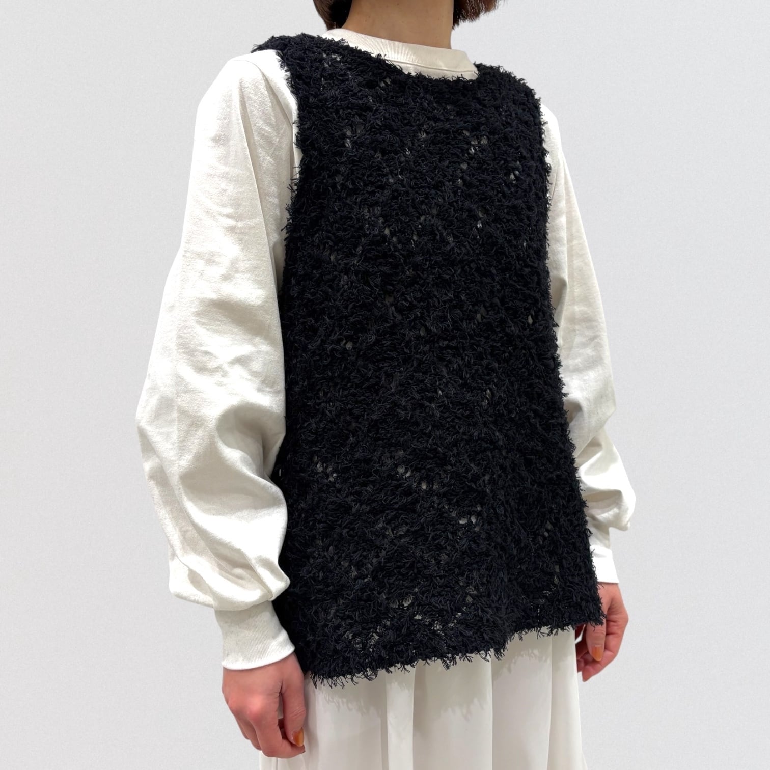 フリンジがついたテープヤーンをダイヤ柄で編んだパターンベストです。