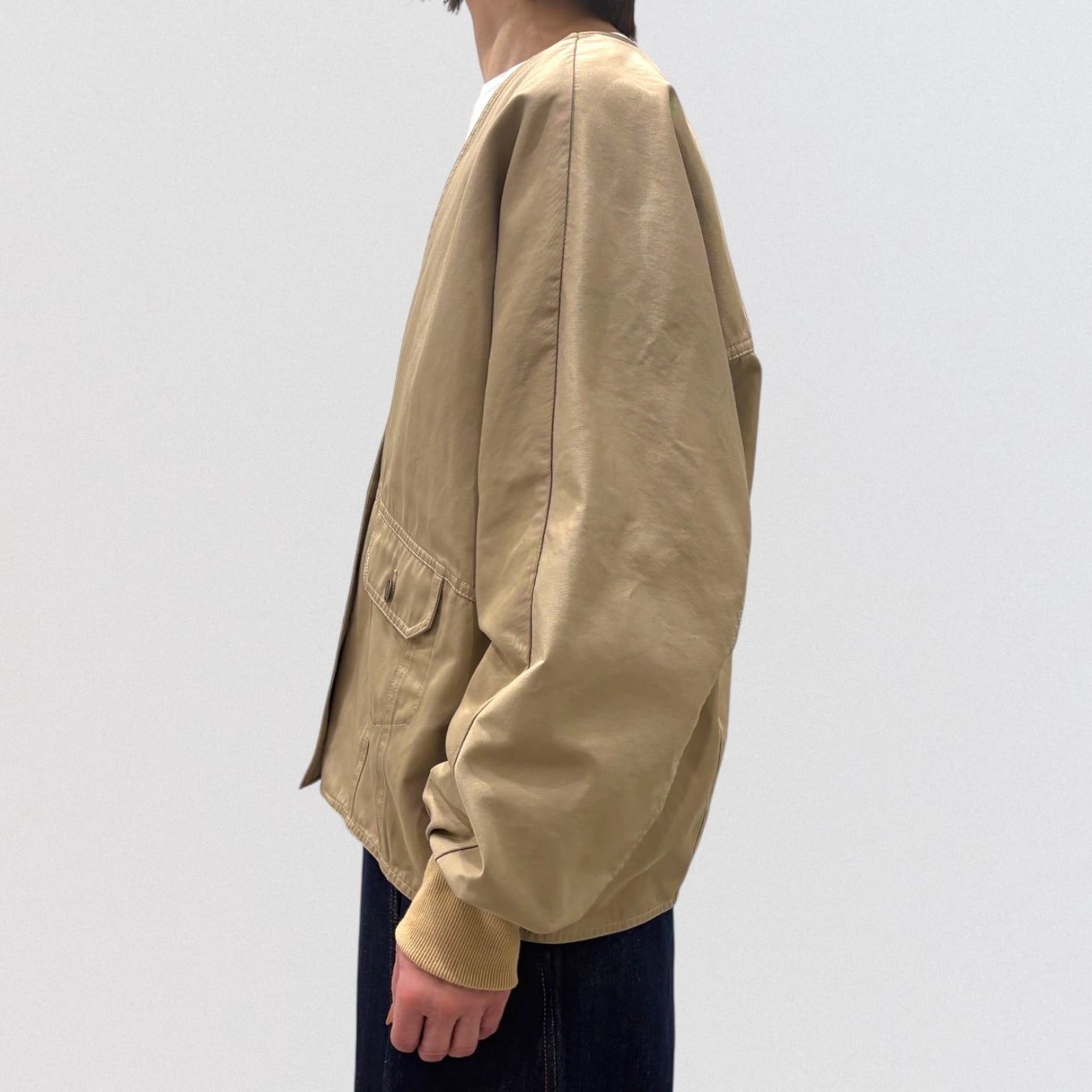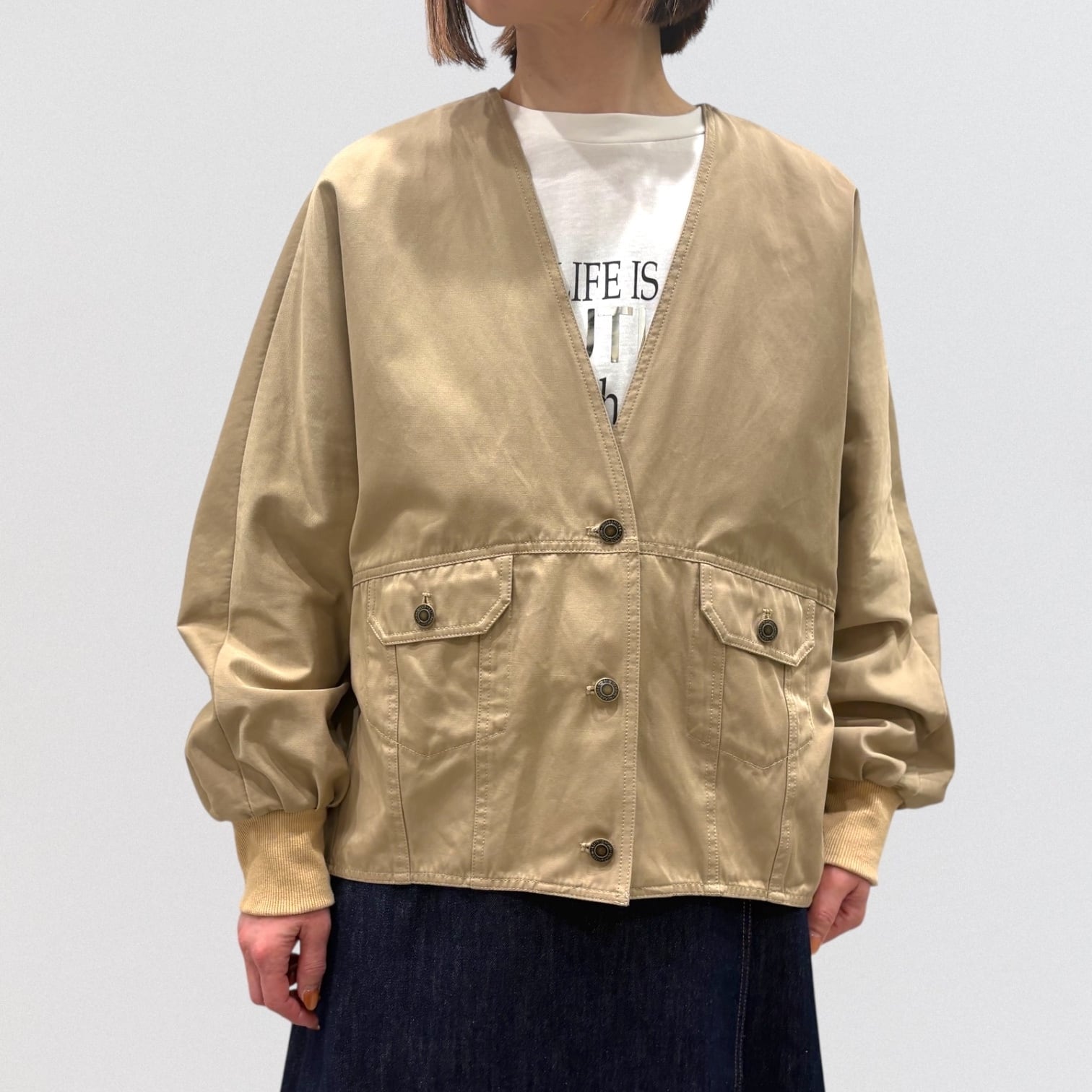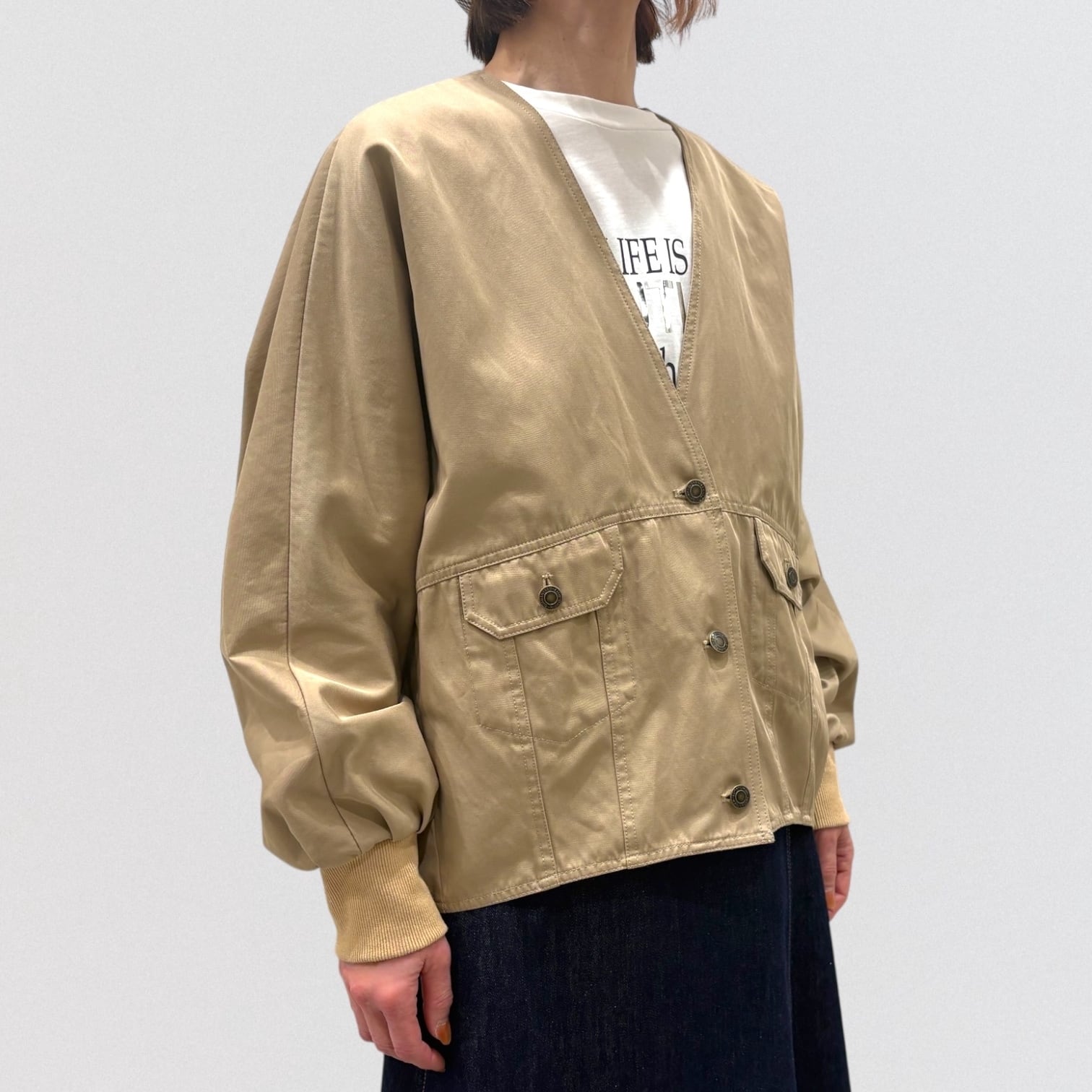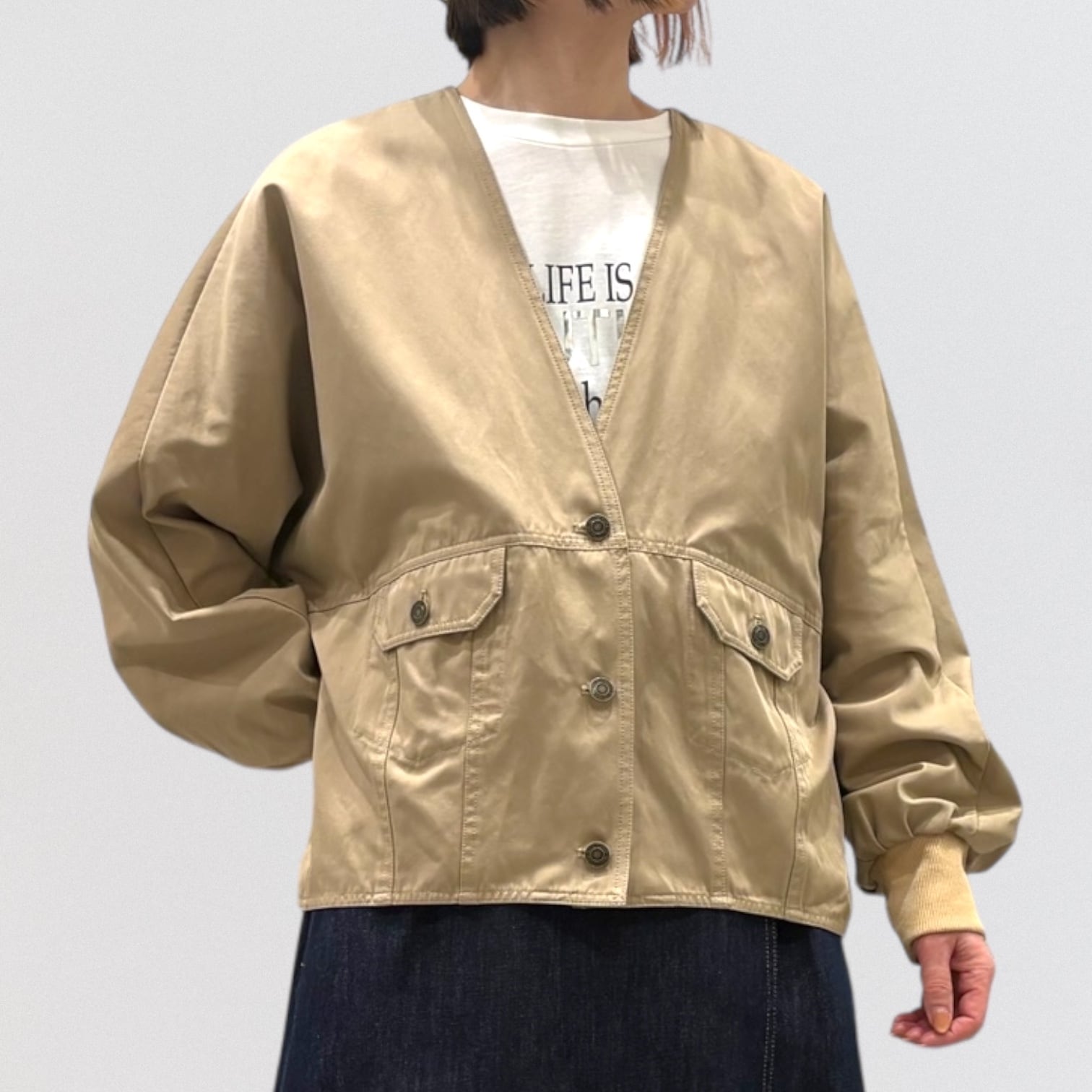 程よいハリ感のある素材で仕立てた、ドルマンスリーブのノーカラージャケット。