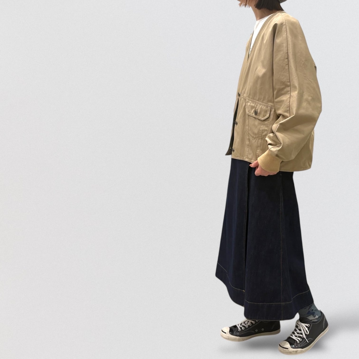 ウエスト位置のフラップポケットがさりげないアクセントになり、シンプルながらも立体感のある表情に。