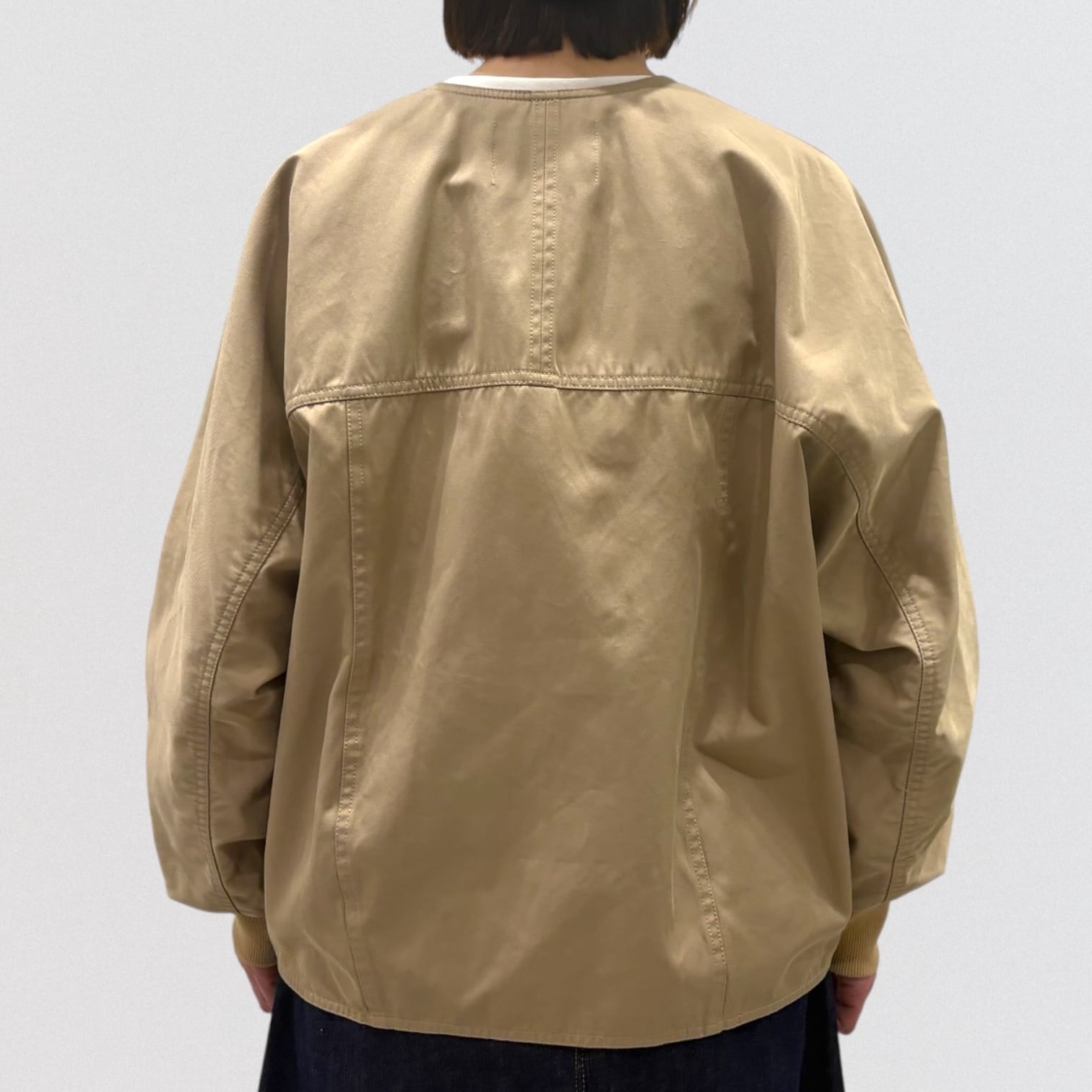 ノーカラー仕様なのでTシャツやロゴカットソーはもちろん、ブラウスやワンピースとも好相性。