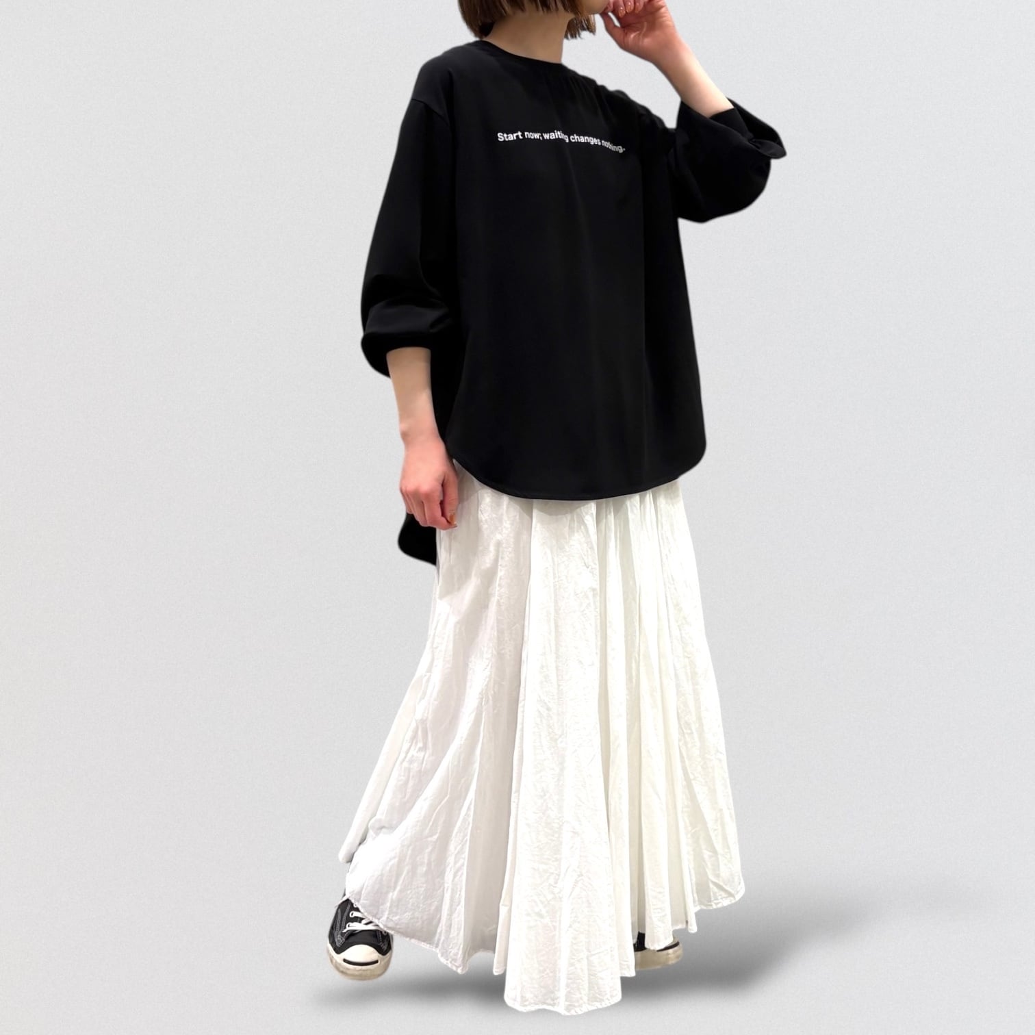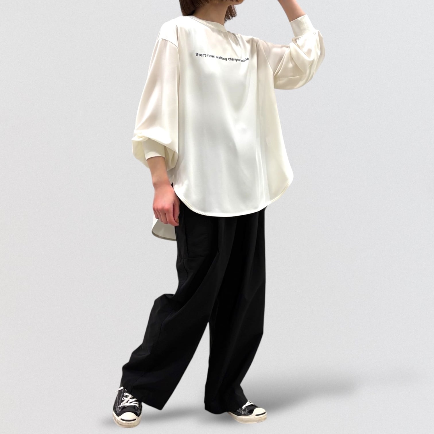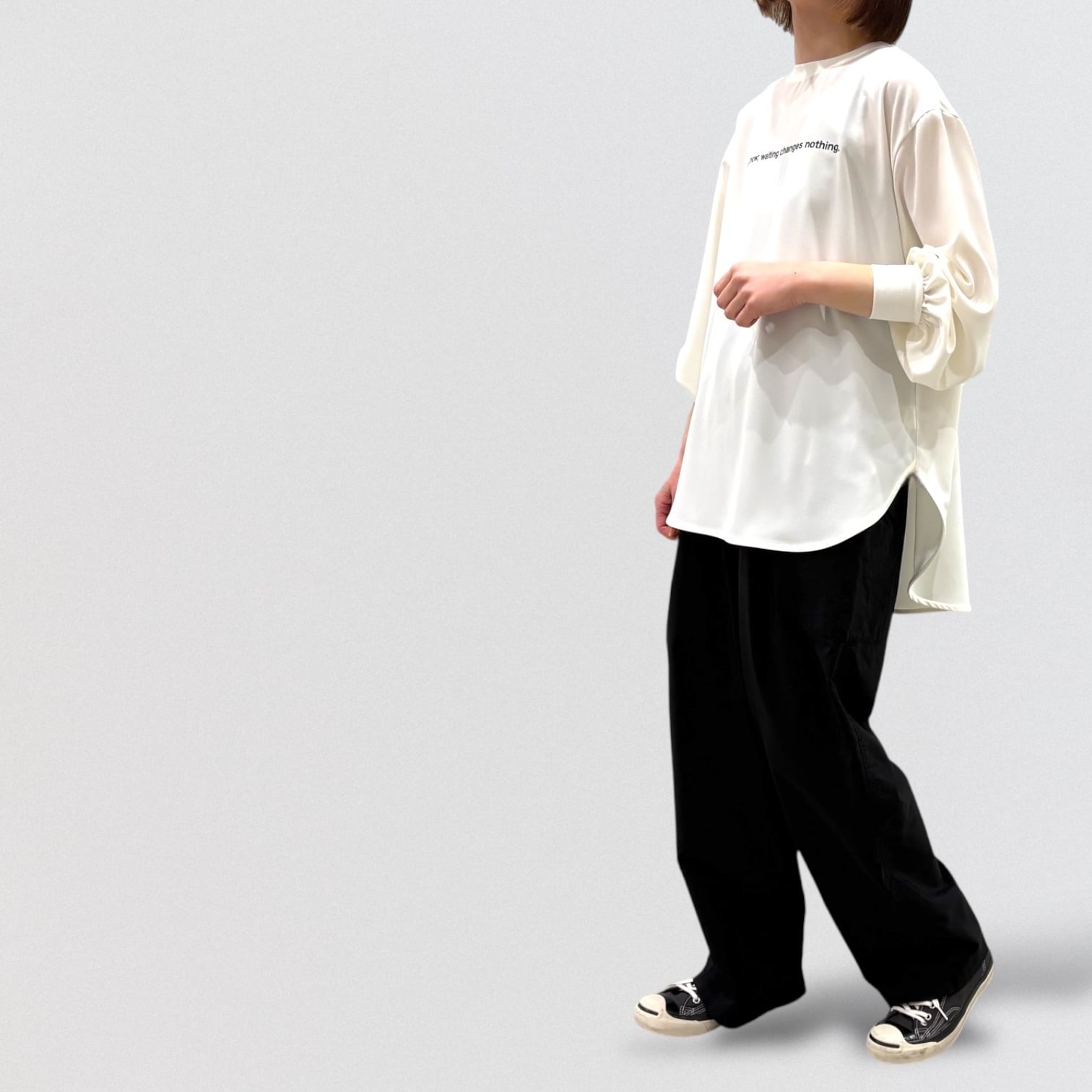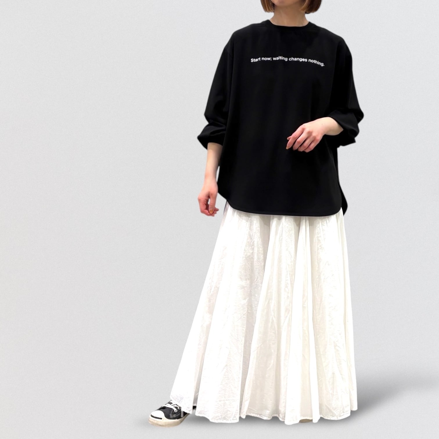 Tシャツとはちがう素材感と落ち感で、さりげないロゴが大人カジュアルの着回しに活躍。