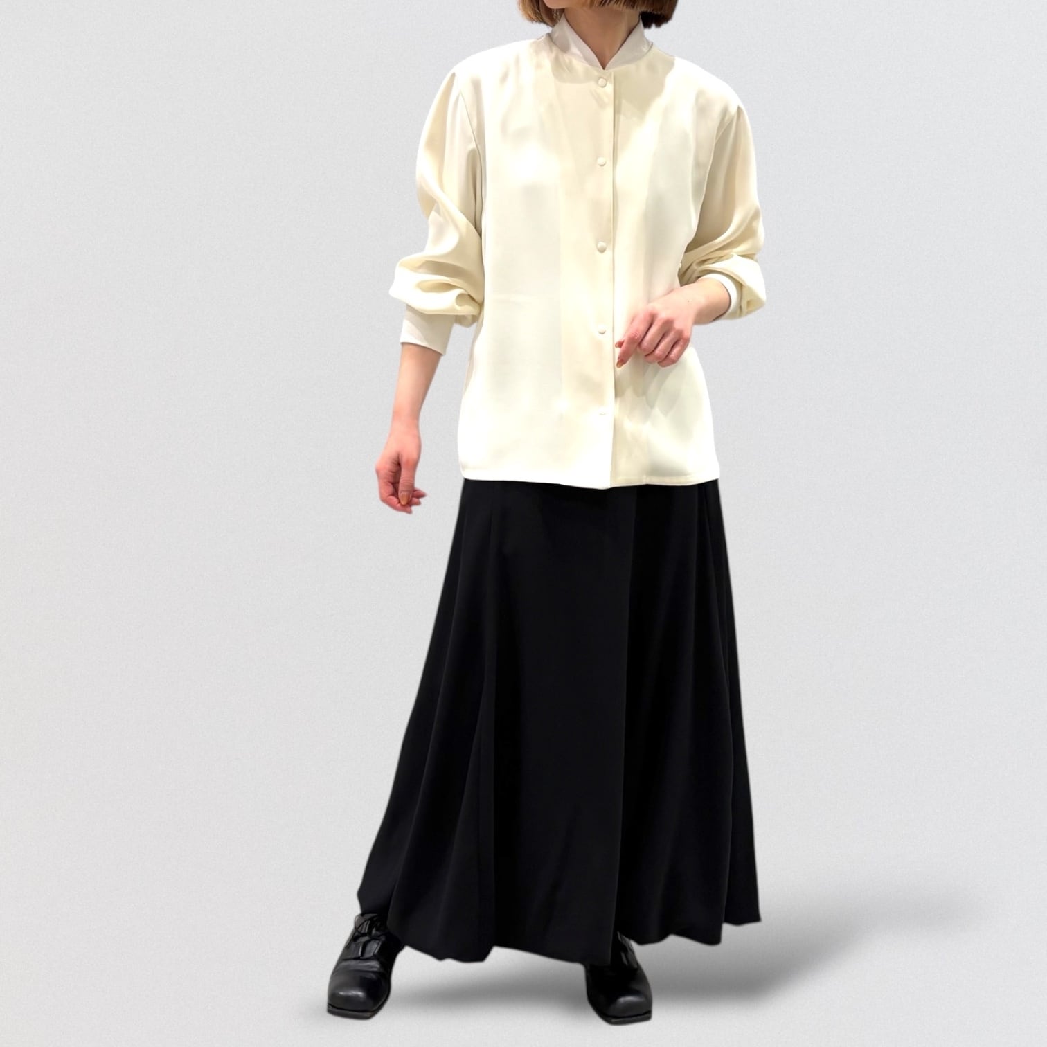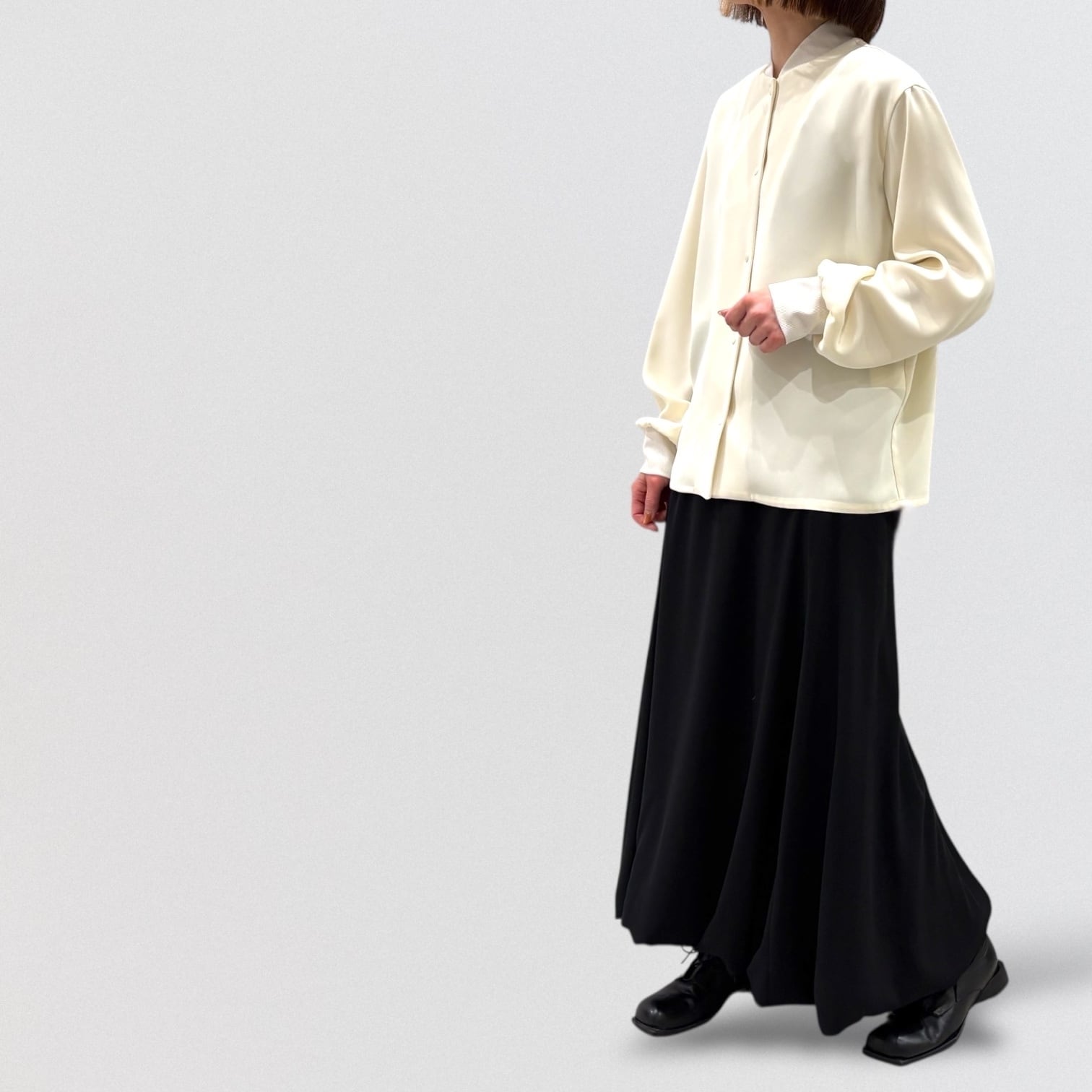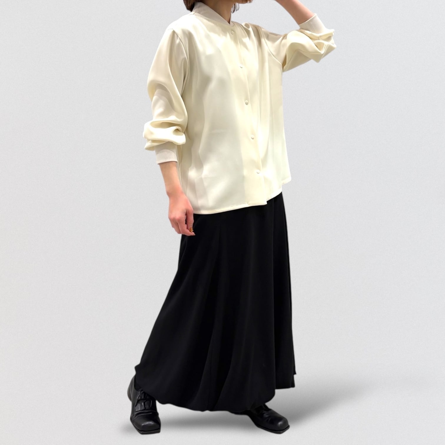 ややひねりをきかせたバルーンスカートをとろみのあるジョーゼット素材で仕上げたことで更に上品な雰囲気に。