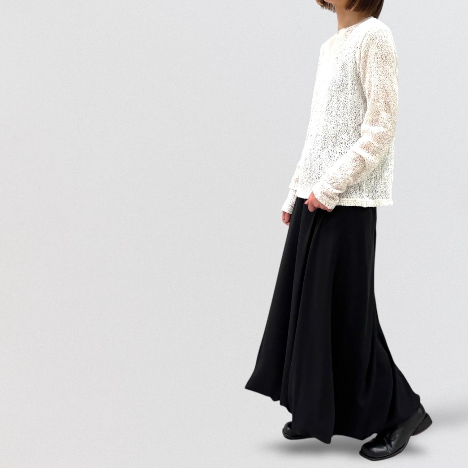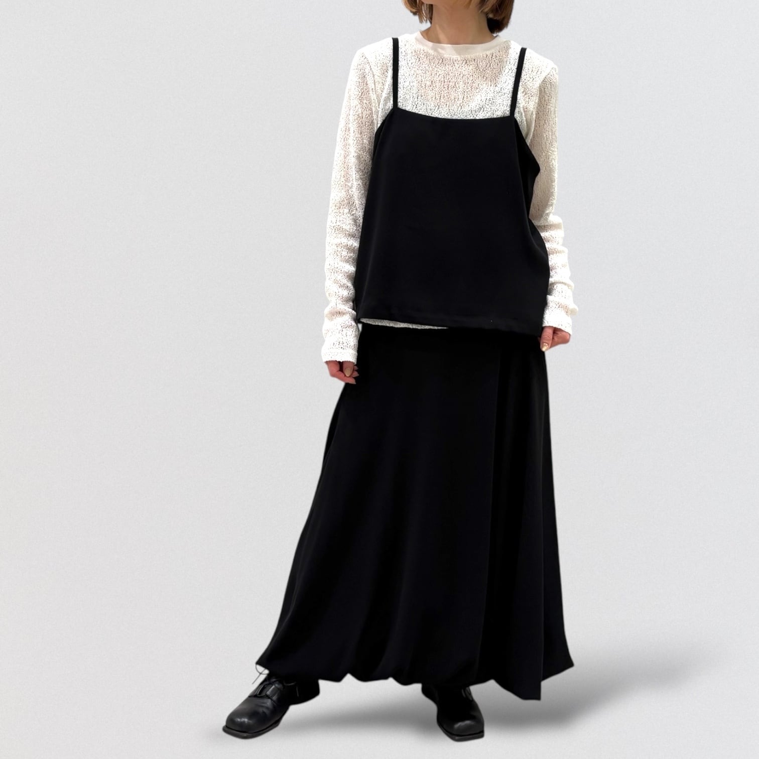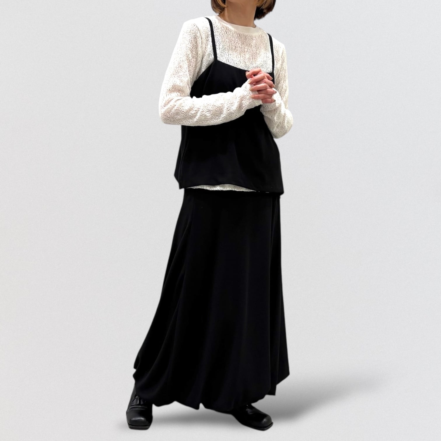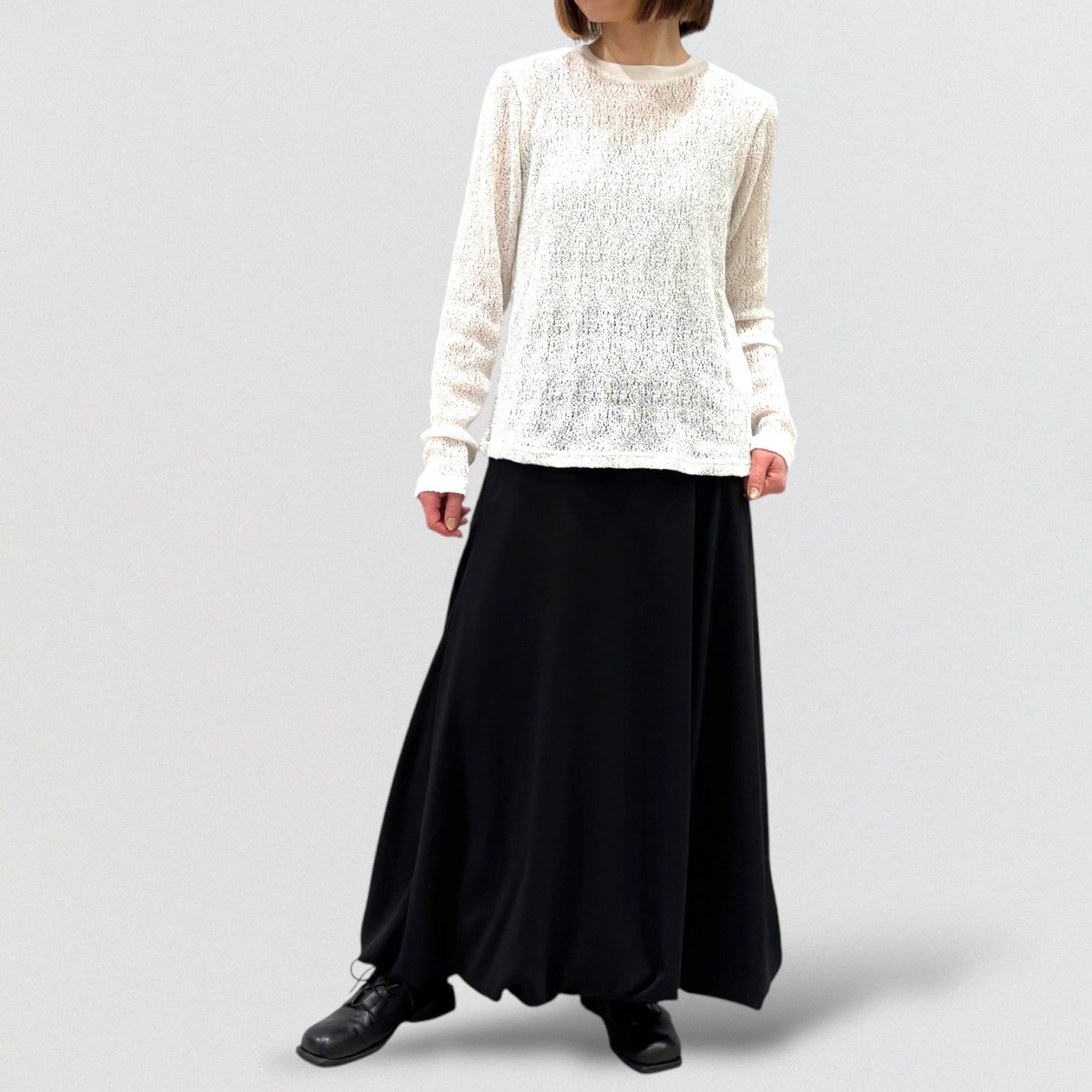 ややひねりをきかせたバルーンスカートをとろみのあるジョーゼット素材で仕上げたことで更に上品な雰囲気に。